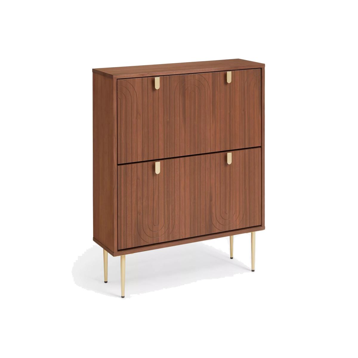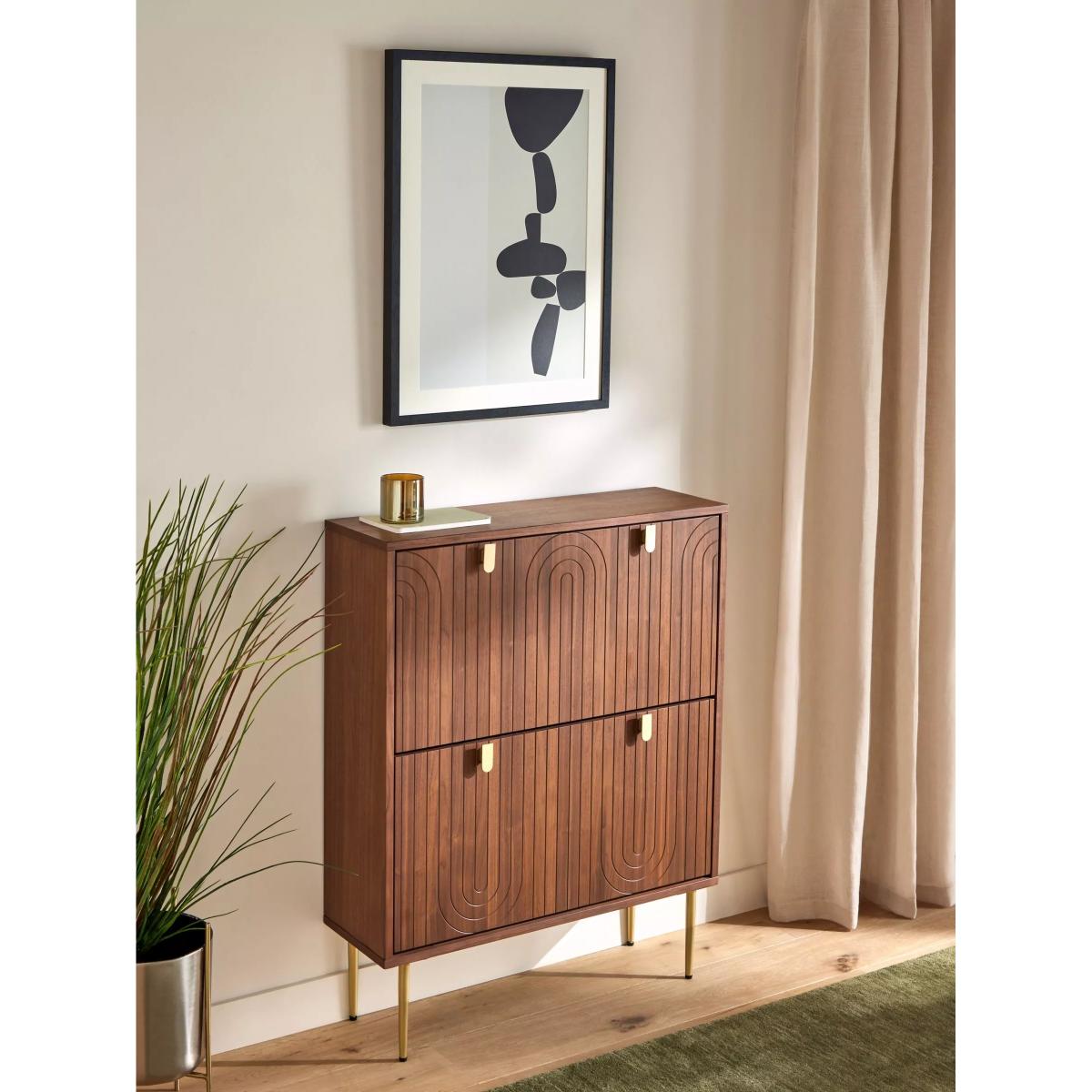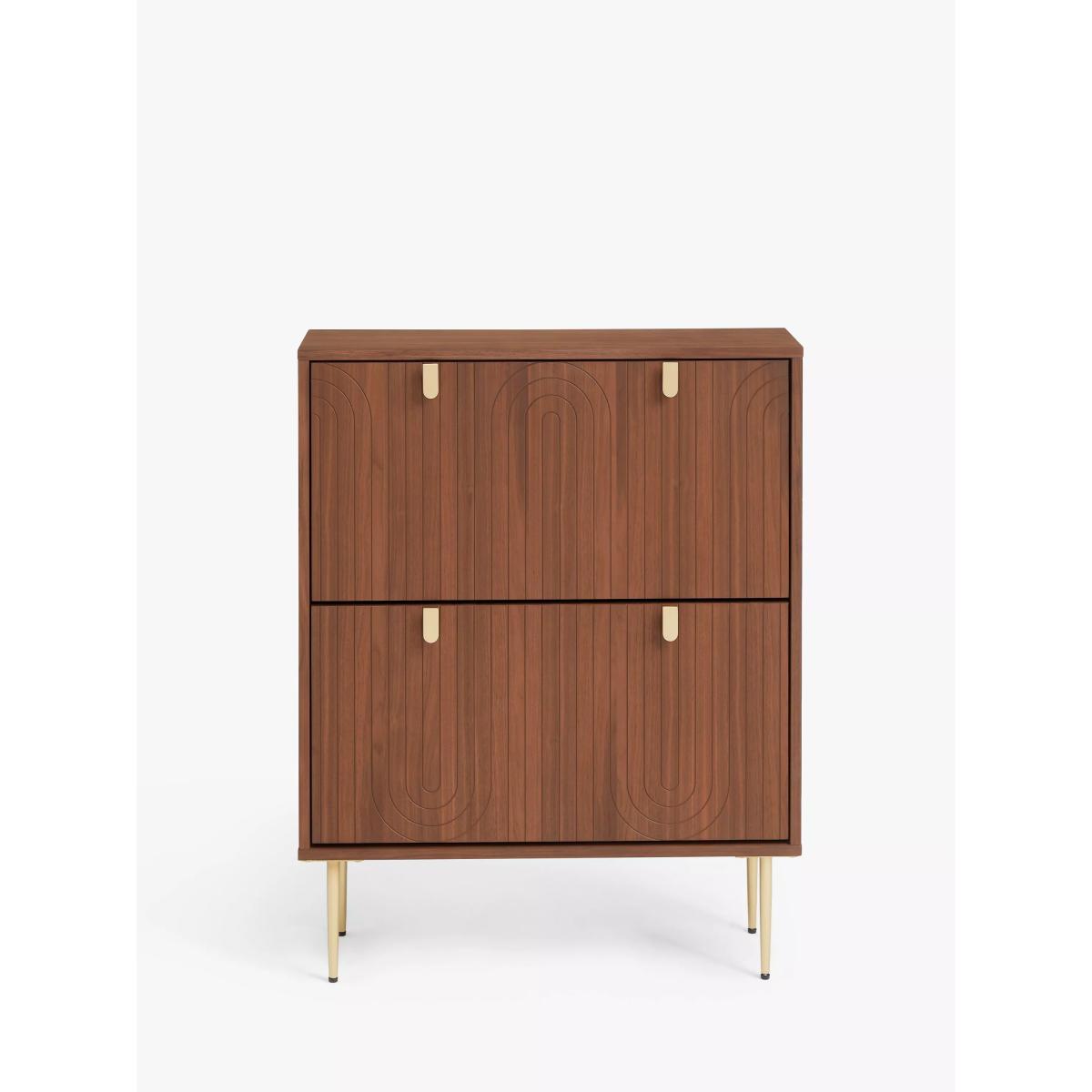 Our Harvard range of furniture combines Art-Deco style with modern shapes to inject character into your space. This wide shoe storage unit is made from MDF and walnut veneers and features two pull-out compartments. We love the fluid pattern inset on the door fronts, as well as the gold finish handles and tapered legs, all of which add to its sleek look. Want to see it first? You may want to see and get a feel for the furniture in one of our shops before ordering. We'll be able to tell you where the range you'd like to view is on display.