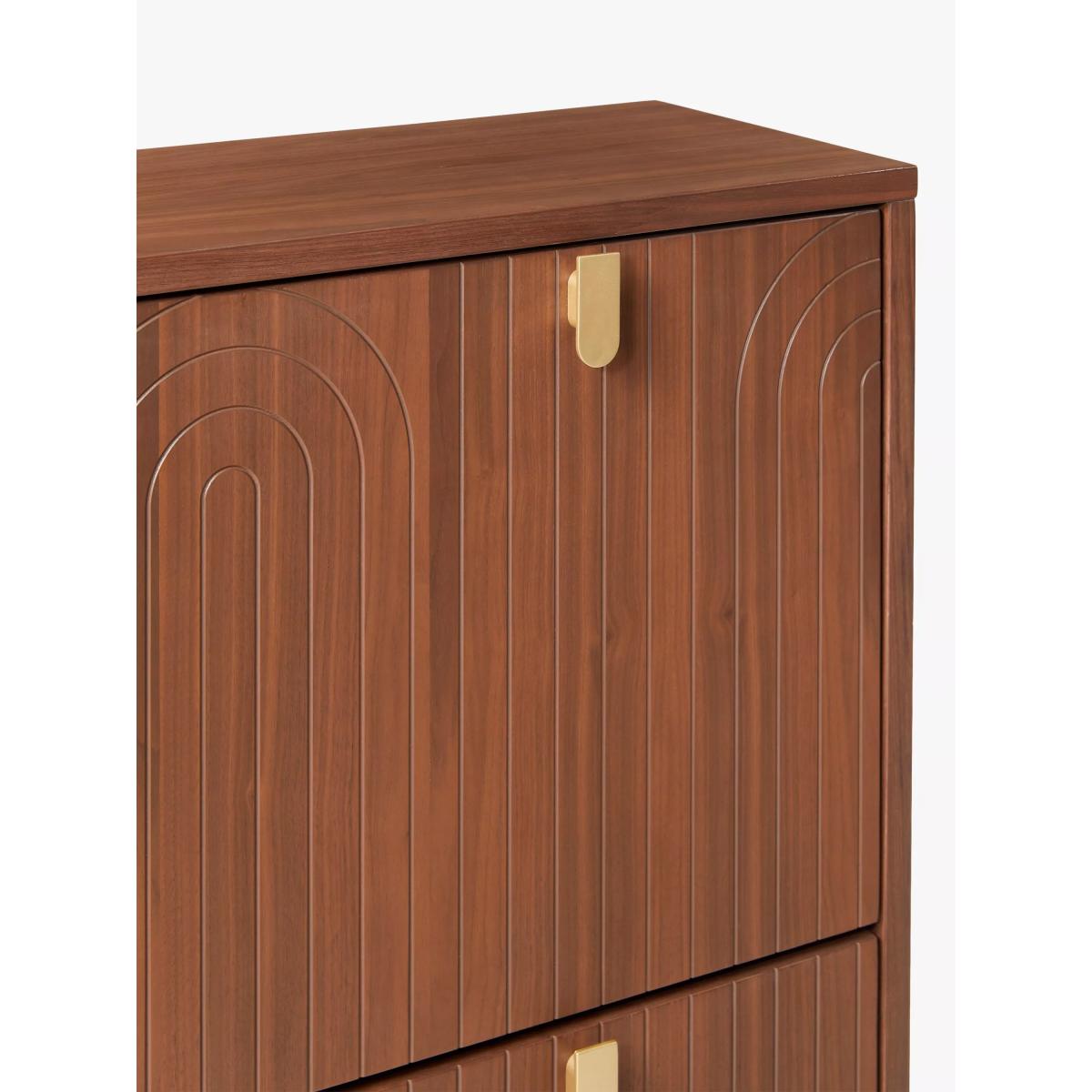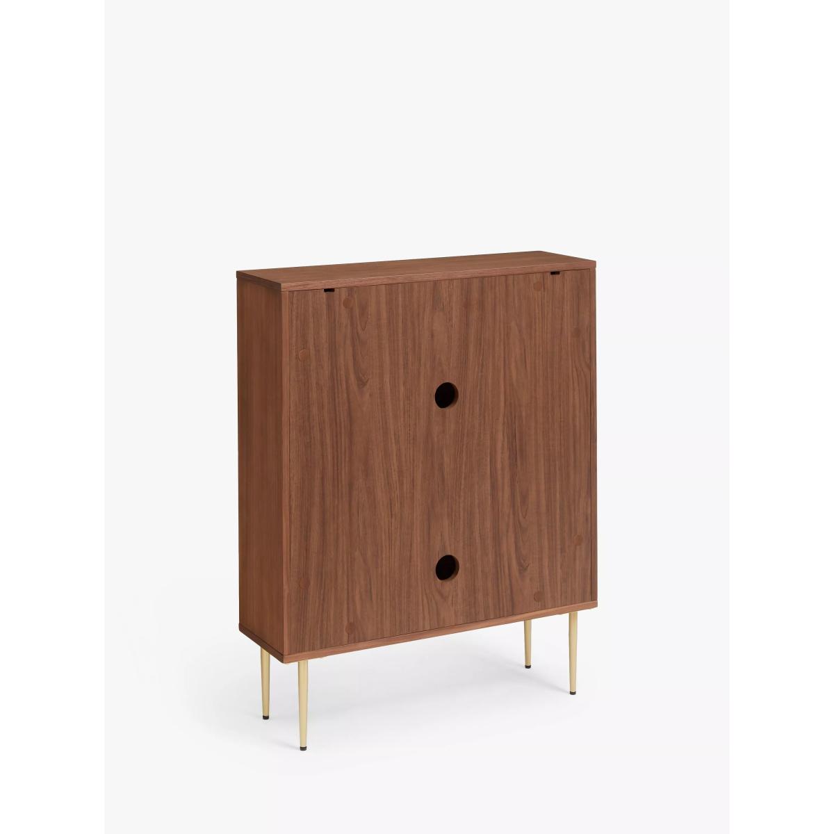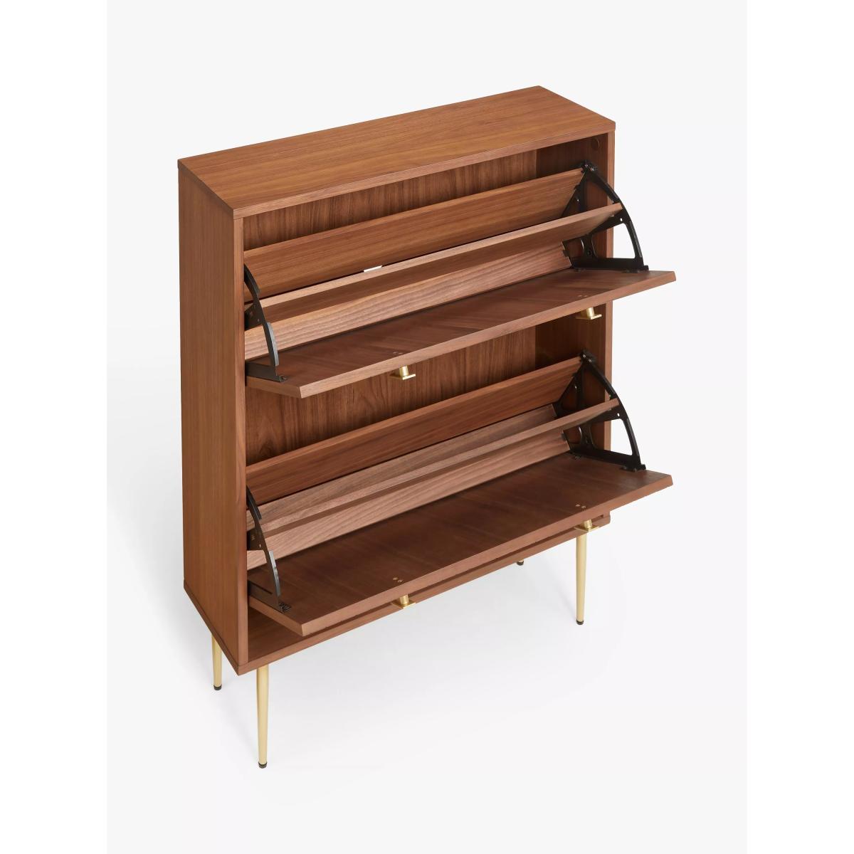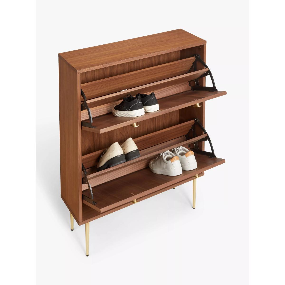Our Harvard range of furniture combines Art-Deco style with modern shapes to inject character into your space. This wide shoe storage unit is made from MDF and walnut veneers and features two pull-out compartments. We love the fluid pattern inset on the door fronts, as well as the gold finish handles and tapered legs, all of which add to its sleek look. Want to see it first? You may want to see and get a feel for the furniture in one of our shops before ordering. We'll be able to tell you where the range you'd like to view is on display.