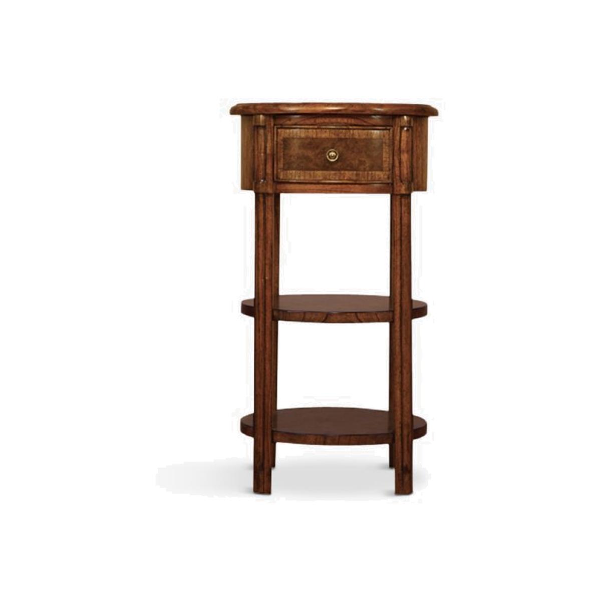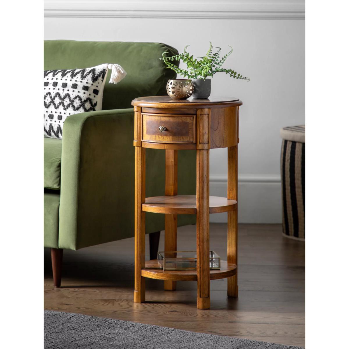 I’d call this the Hemingway side table - its warm, figured wood and slim profile suit both classic and more relaxed schemes. It works brilliantly beside a sofa or in a hallway alcove where you need surface space without bulk. The built-in drawer and two lower shelves are perfect for stashing remotes, coasters or a stack of your favourite reads. To style it, keep the top simple with a small lamp and a single pot plant or sculptural vase, then use the lower tiers for baskets or neatly arranged books to balance form and function.