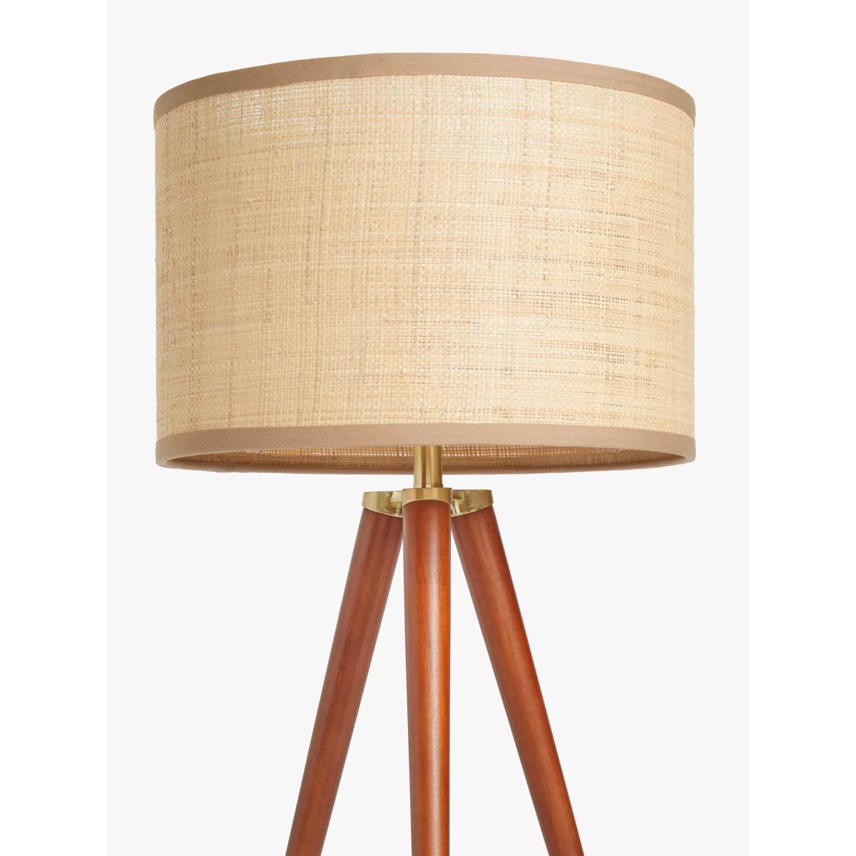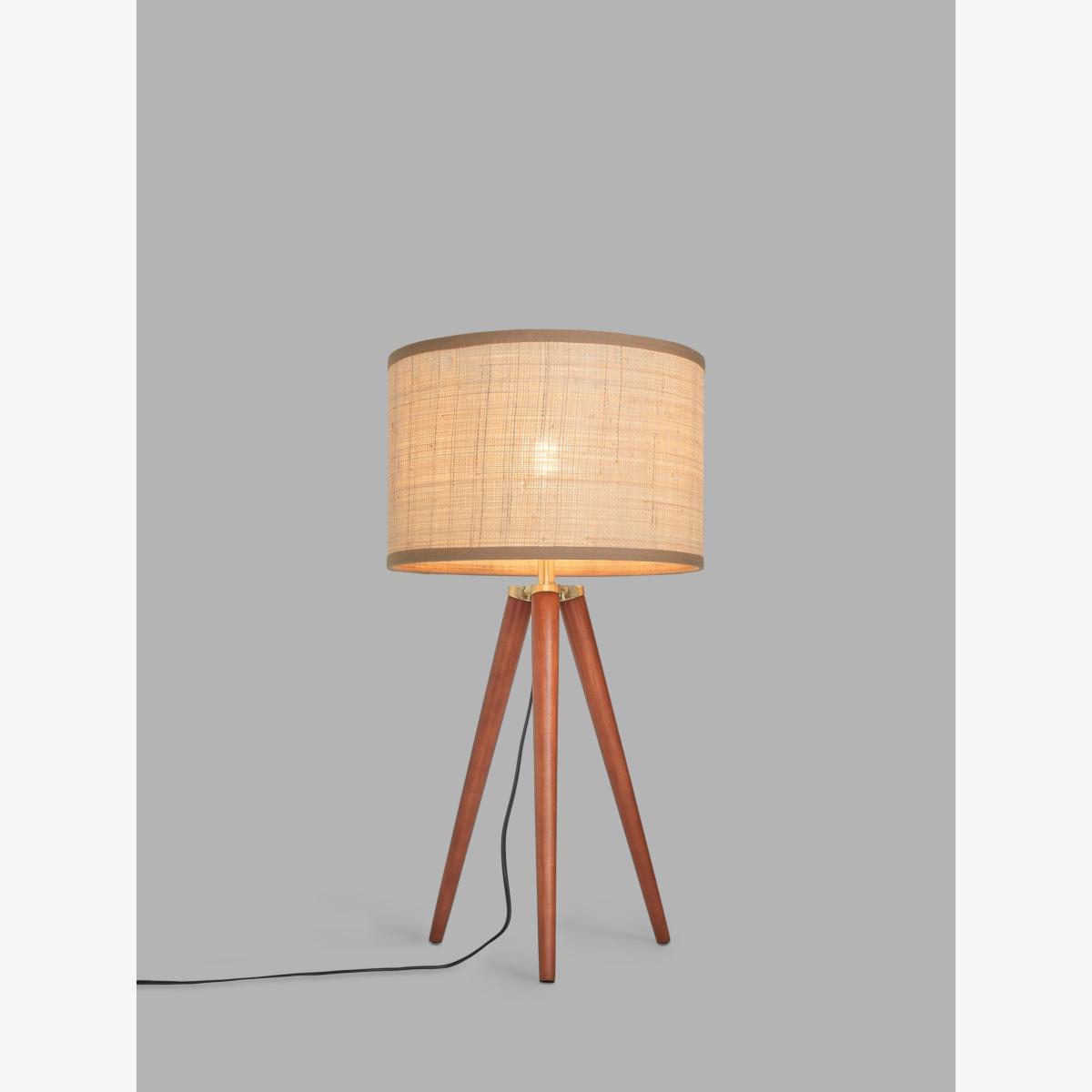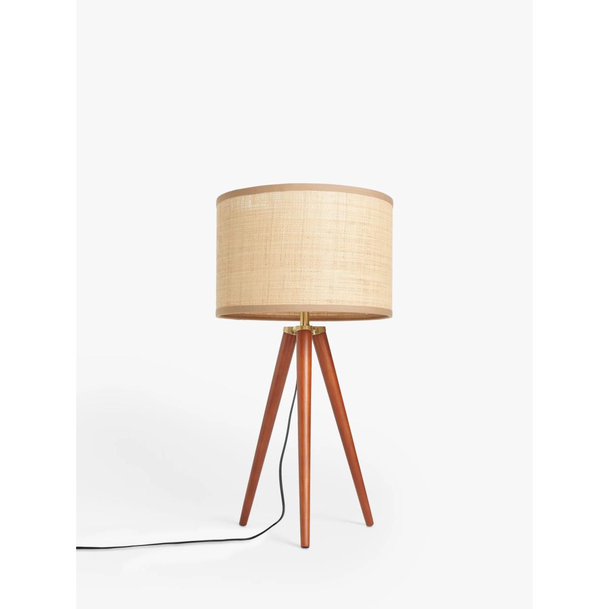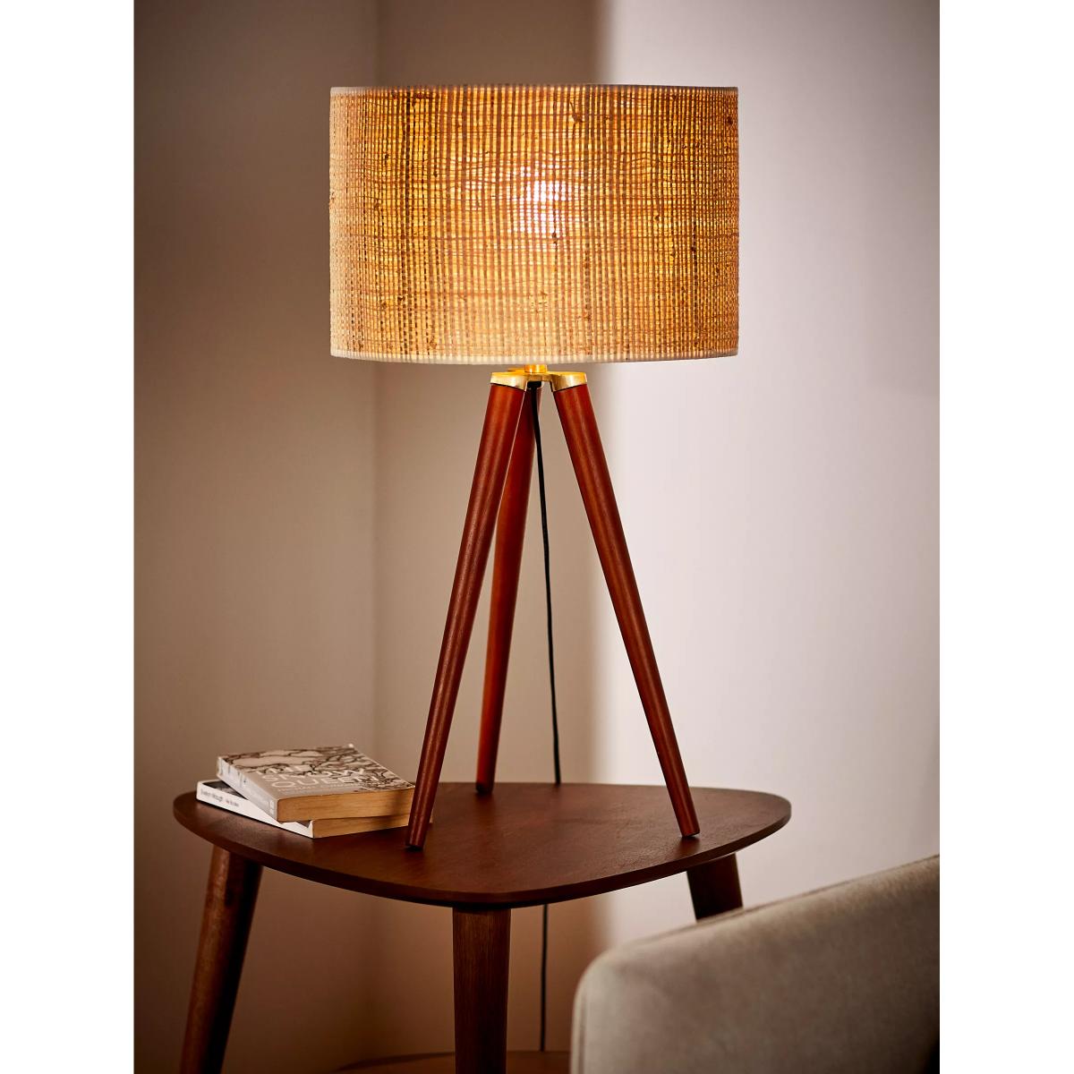 Our Herschel table lamp has a contemporary tripod design with natural elements including wood tripod legs and a short natural raffia grass drum shade. The textured shade disperses light from a 10W LED bulb. The sturdy and stylish design features antique brass detailing. Lamp shade trim matches the wood stain finish on the tripod legs. Turn on and off with the in-line switch. The lamp is powered by a five-foot cord covered in natural fabric.
