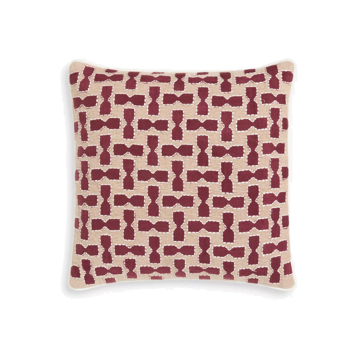 A machine embroidered "bow tie" design cushion with jute applique.