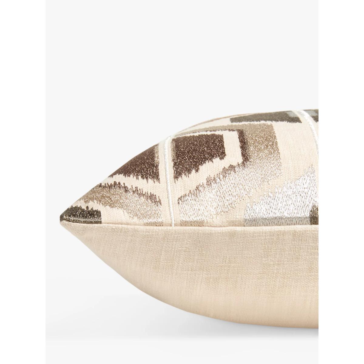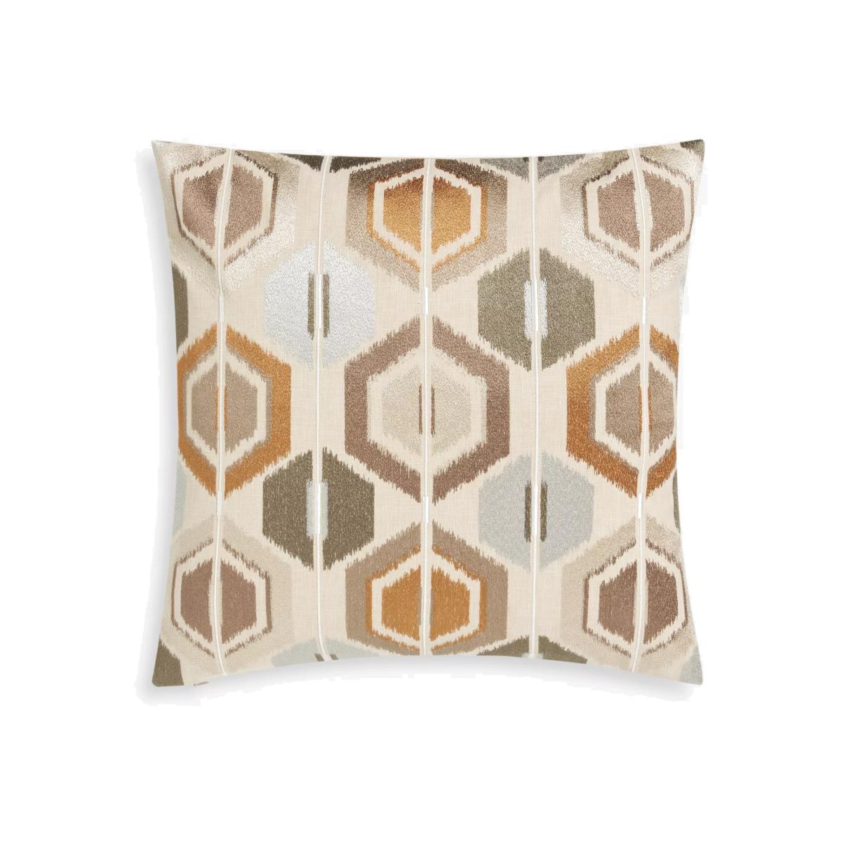 Computerised embroidery hexagons stand out in a subtle sheen against the plain background of this contemporary cushion.