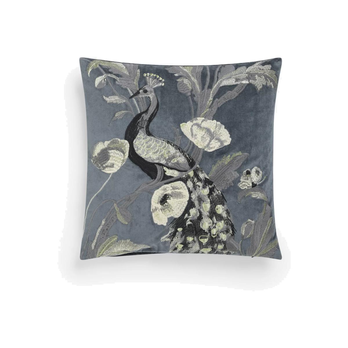 This exotic poppy and peacock design is machine embroidered onto luxurious cotton velvet fabric using accents of metallic gold thread.