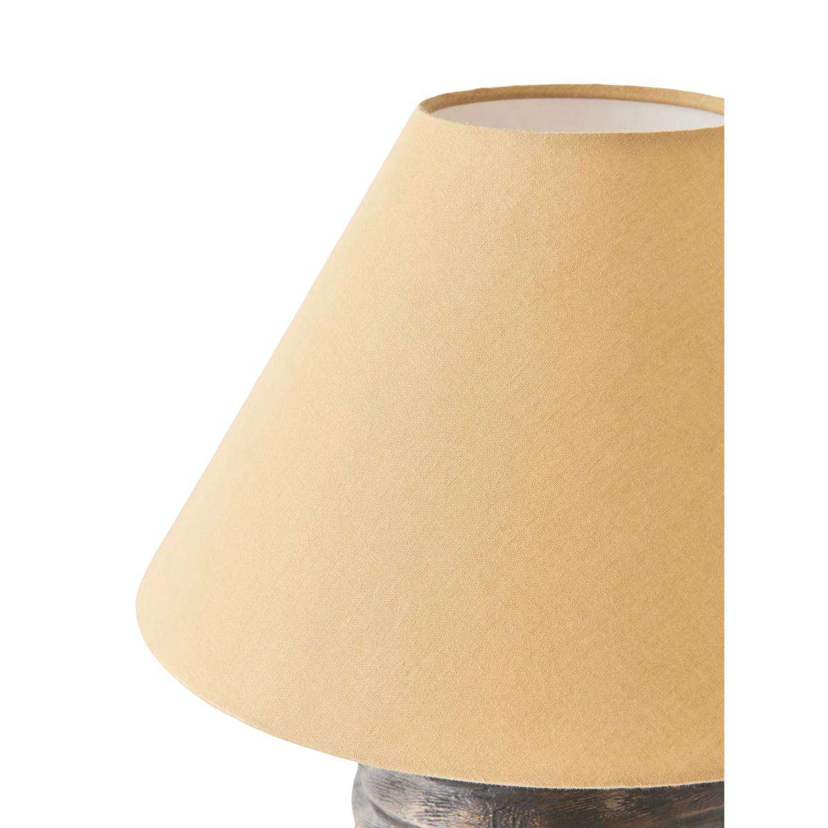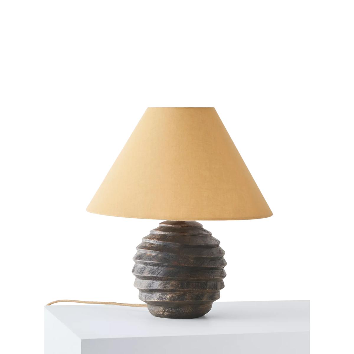 The Jika table lamp has a handcrafted base made from solid mango wood. Its unique carved pattern and black stained finish have a rustic charm. Complemented by an ochre faux-linen lampshade and an aged brass plate, this lamp makes an ideal accent piece for bohemian-inspired decor. Finished with a handy in-line switch on the tonal cable.