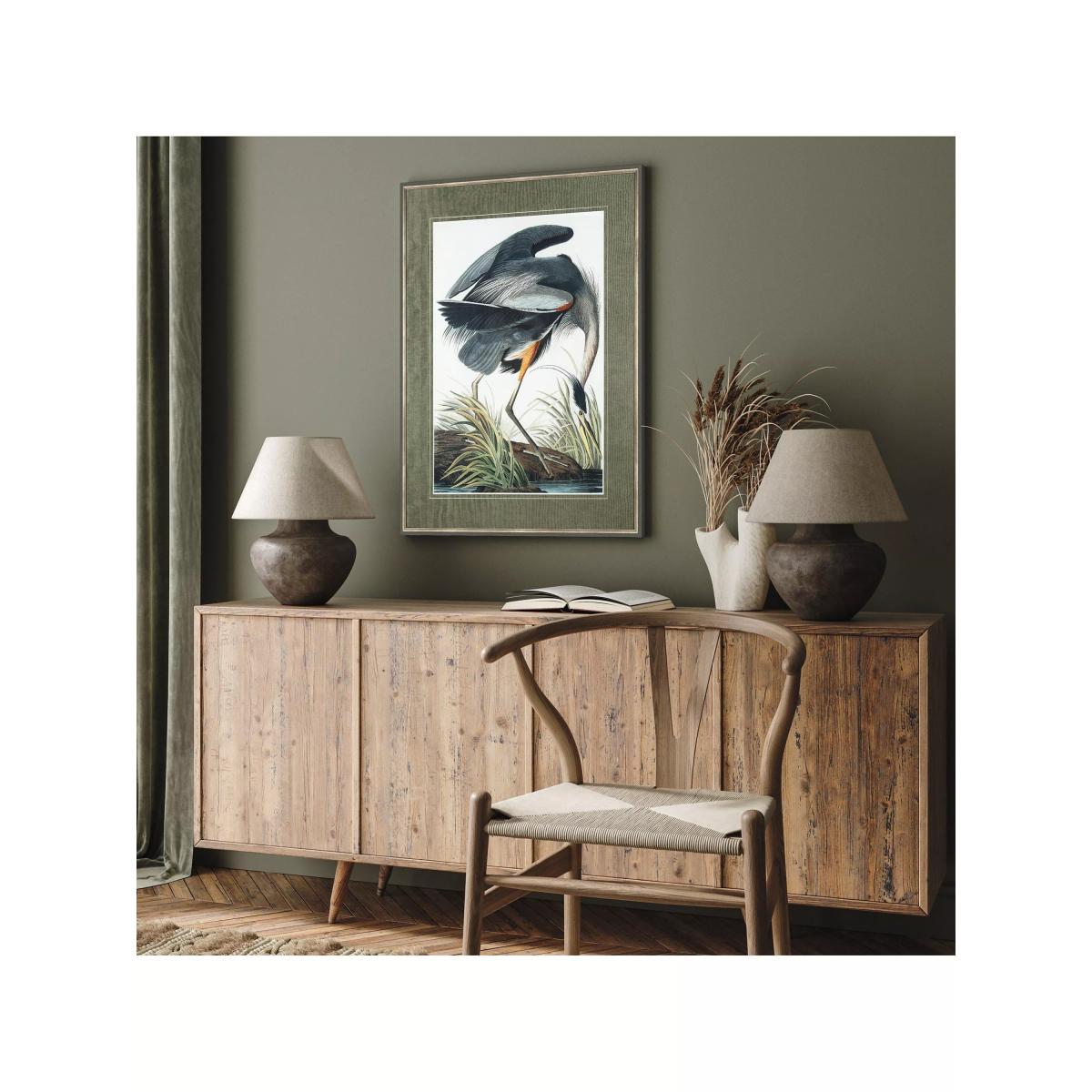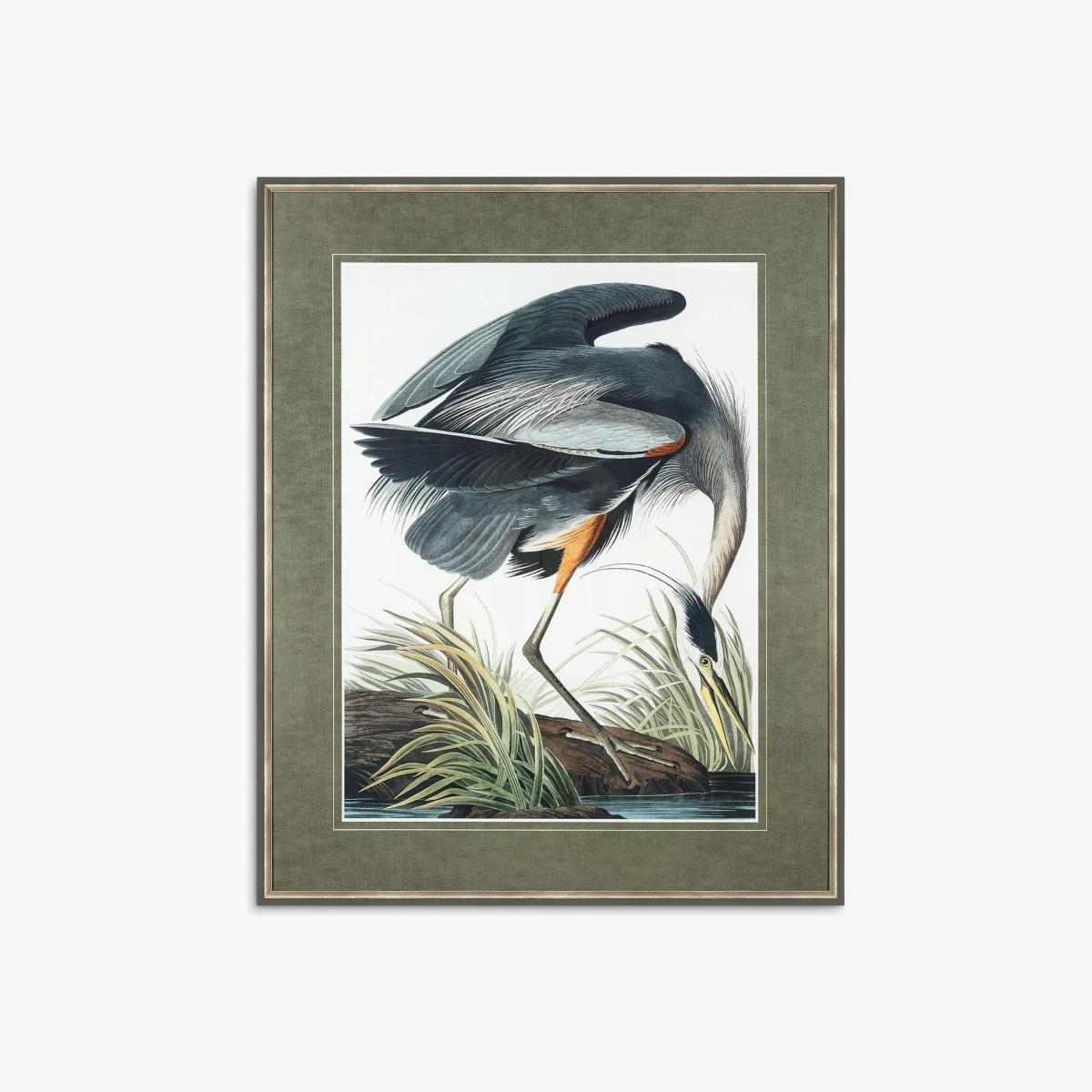A vintage illustration of a great blue heron by renowned American ornithologist and painter John James Audubon, using a gentle colour palette. An olive green mount and slimline brown frame with a gold lip heighten the design. John James Audubon (1785-1851) was a self-trained American artist, naturalist and ornithologist. His combined interests in art and ornithology turned into a plan to make a complete pictorial record of all the bird species of North America. Have you thought about wall hooks and fittings?