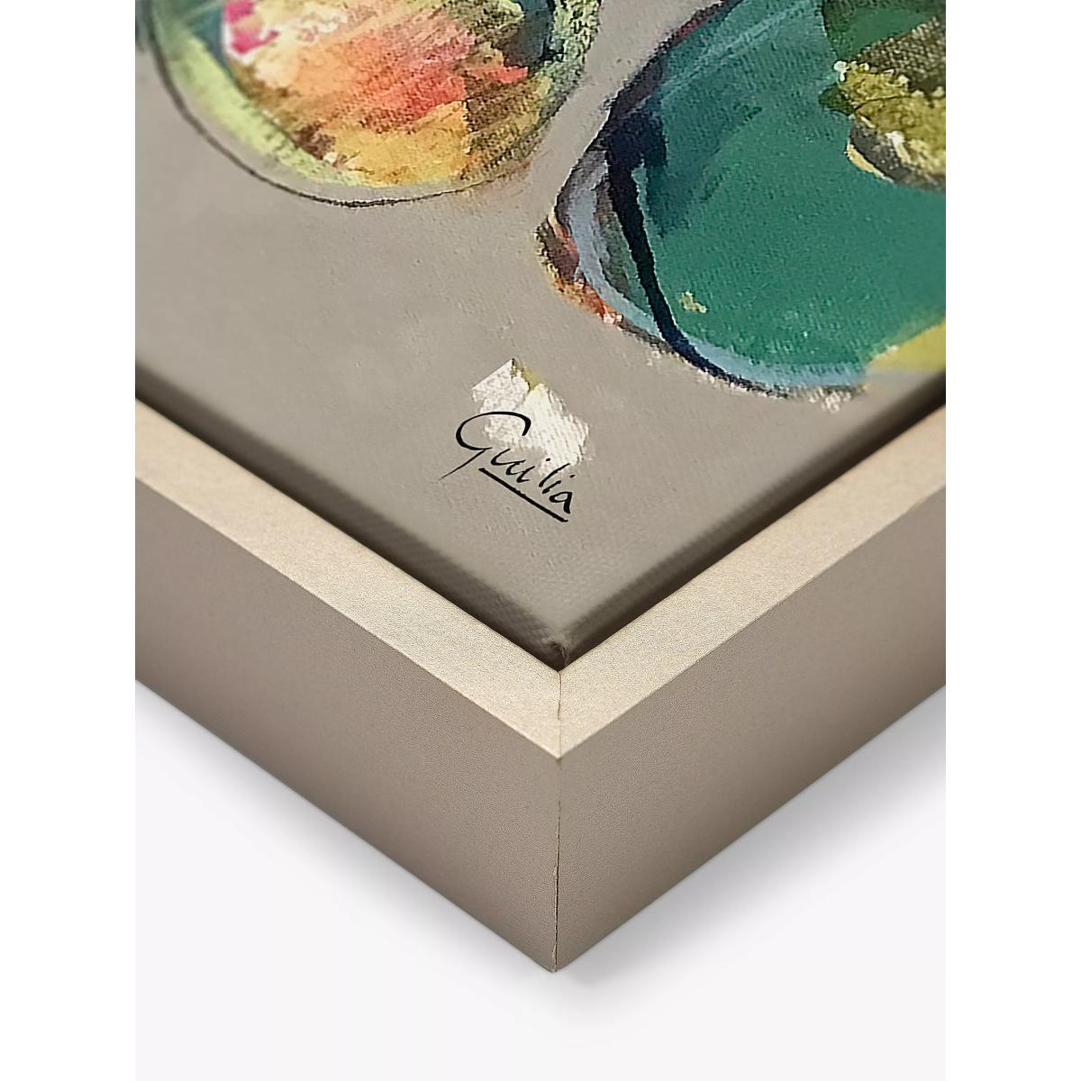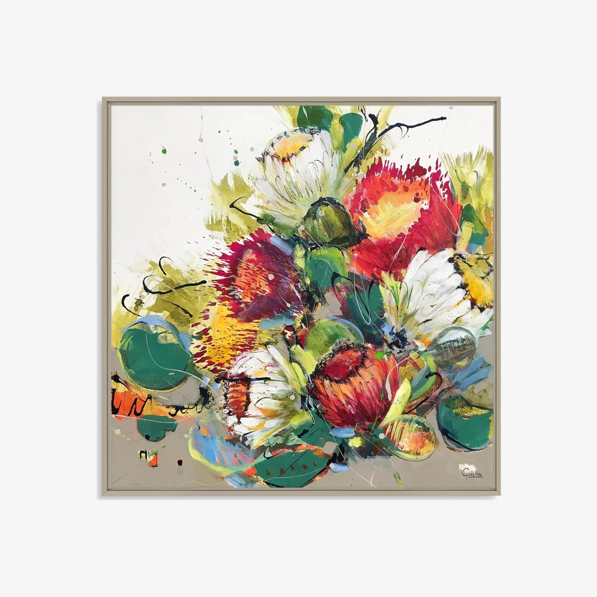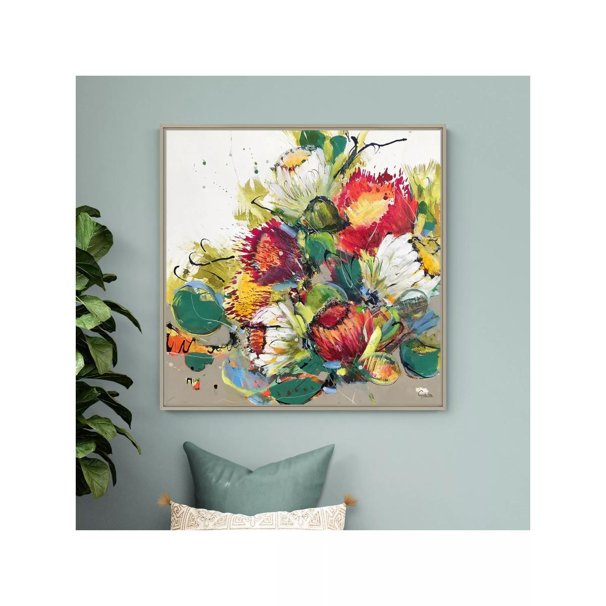 Colourful floral canvas print by Julia Forman. Made in the UK, this unglazed print is float-mounted and framed, ready to hang on your wall. Julia Forman lives and works on the East Coast of South Africa. Her work captures the diversity of life parallel to the Indian Ocean in a country known for its contrasts of mountains and sea; rural and urban life; unique flora and abundant wildlife. Have you thought about wall hooks and fittings?