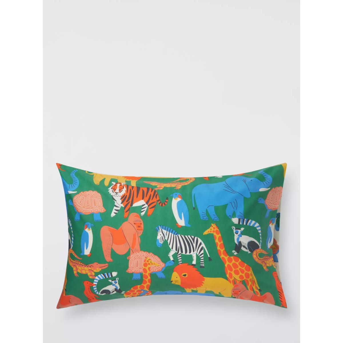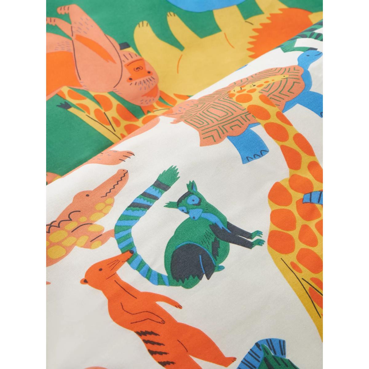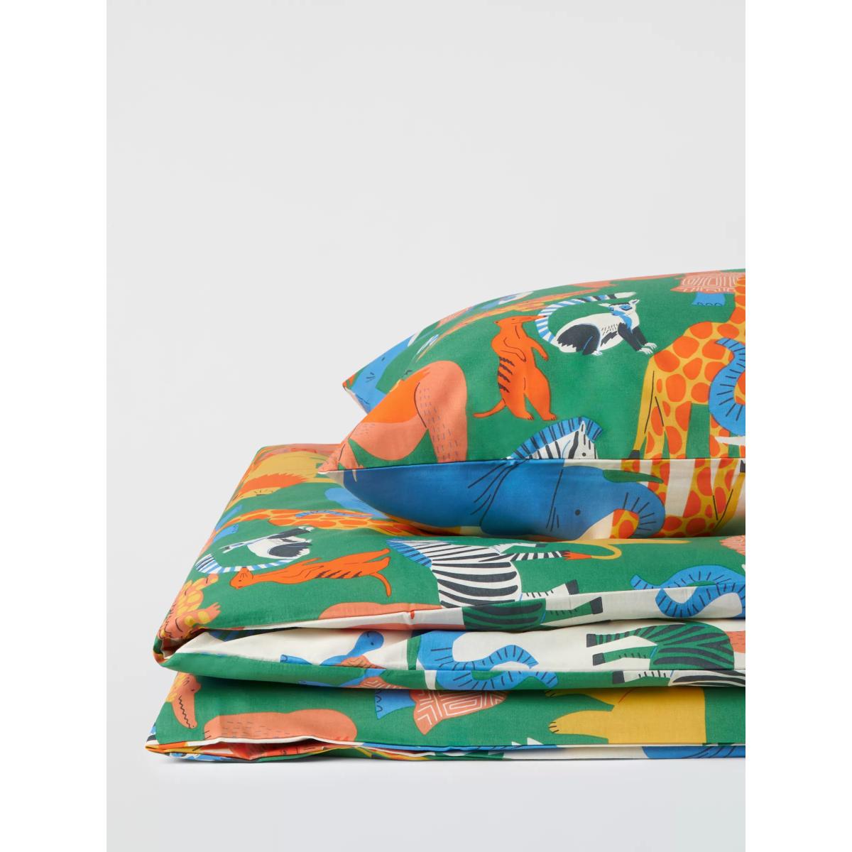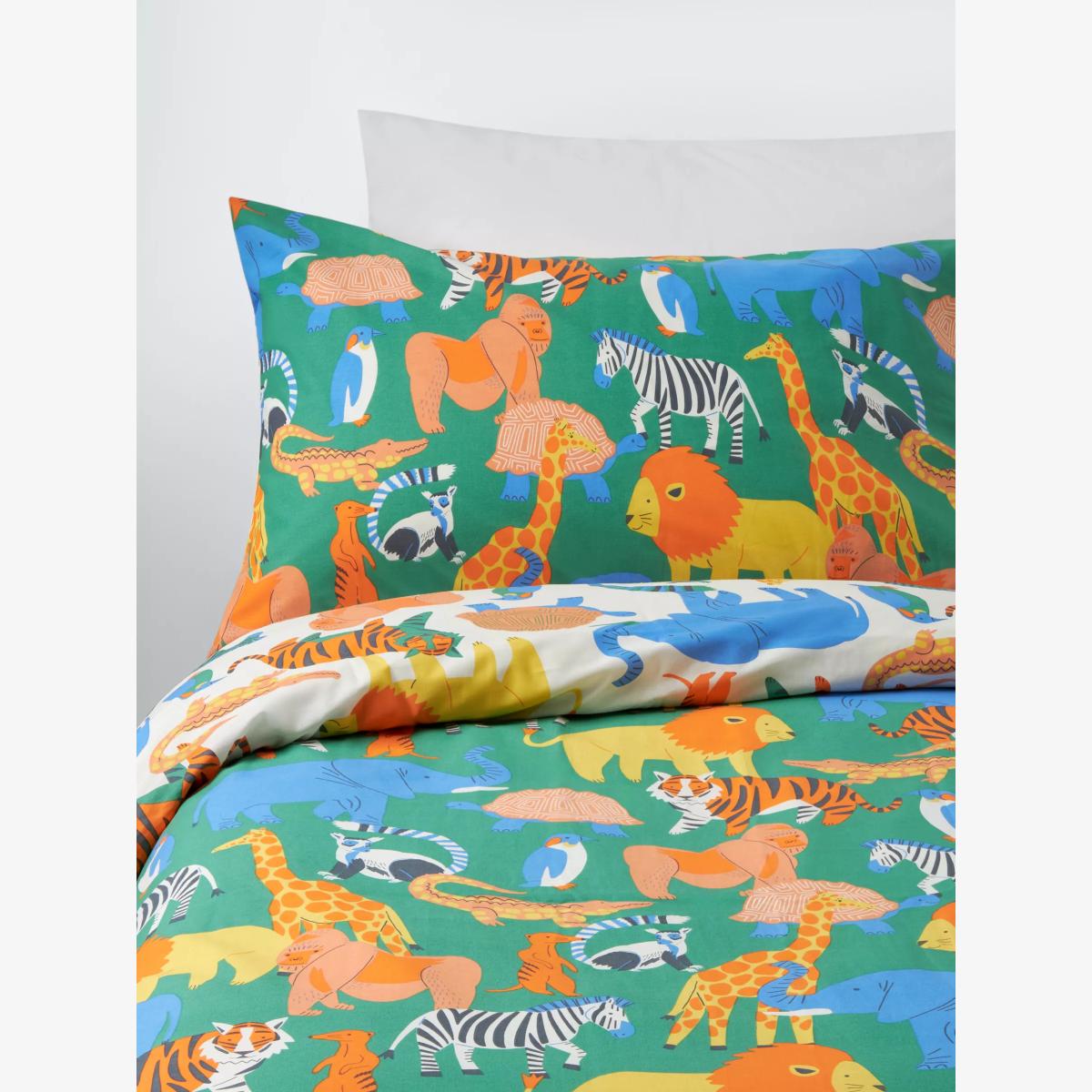 A vibrant animal-themed print decorates this duvet cover and pillowcase set. Let them dream of sunny temperatures and adventurous days with this reversible style - a perfect choice for brightening up their bedrooms. This colourful duvet cover and pillowcase set is made from pure cotton that has a soft handle and breathable feel. It features a secondary print on the reverse, allowing you to change their sleep setting after every wash. Good to know: The cot, cotbed and single sets come with one pillowcase and the double set comes with two standard pillowcases. To fit duvet/pillow size (cm) Junior pillowcase L60 x W40cm Standard pillowcase, L75 x W50cm Cot duvet cover, L100 x W120cm Cotbed duvet cover, L150 x W120cm Single duvet cover, L200 x W135cm Double duvet cover, L200 x W200cm Please remember: Quilts, duvets and pillows are not suitable for children under 12 months due to the risk of overheating. Have you thought about sheeting? Shop here