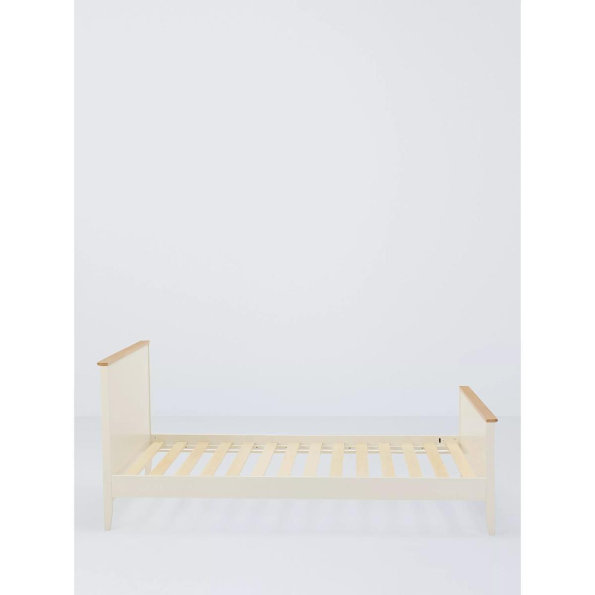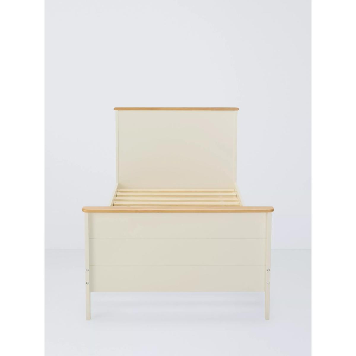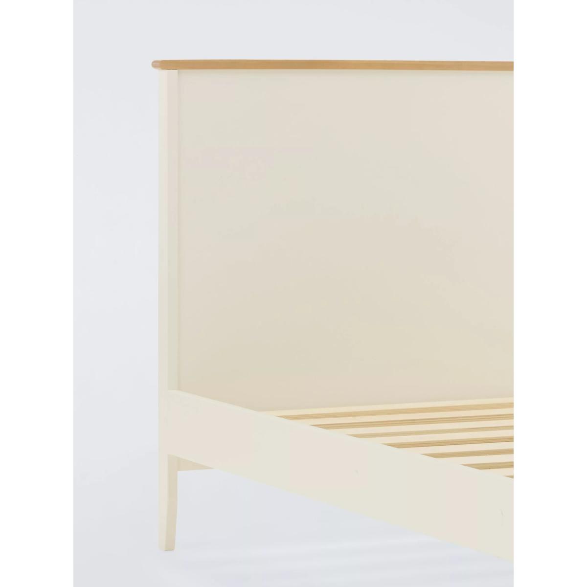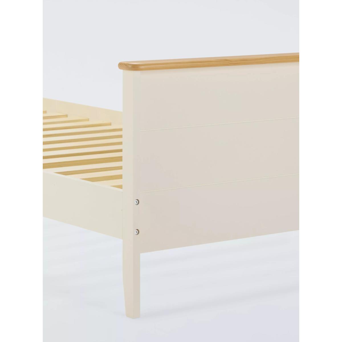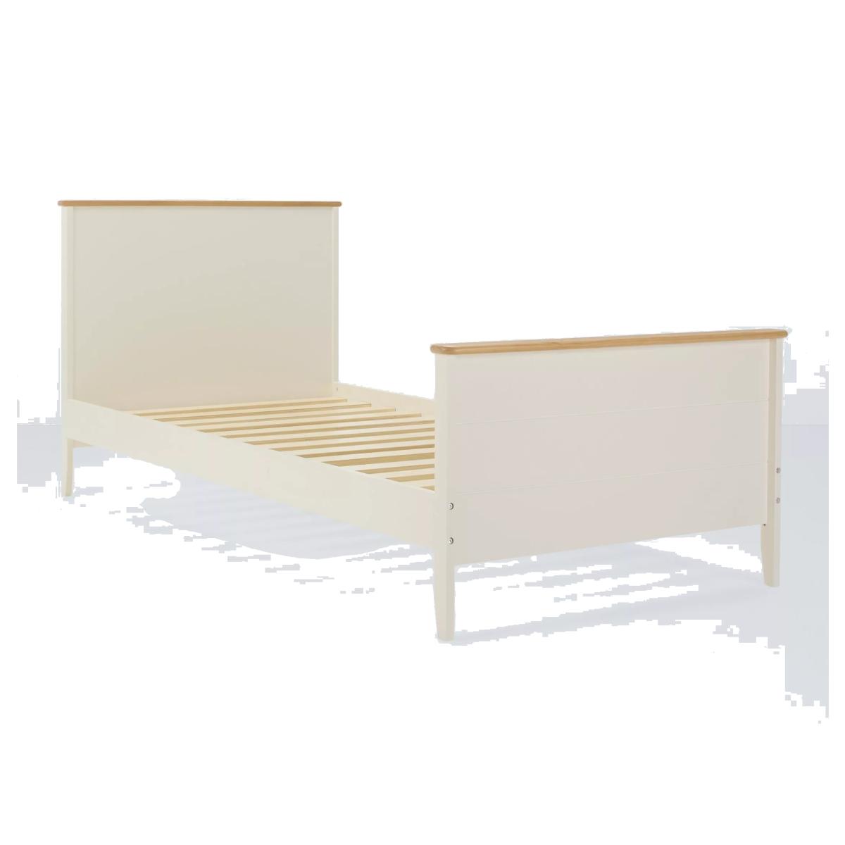 This Avery bed frame is built from a combination of hardwearing timbers and MDF. Solid slats in the base provide a supportive foundation for your mattress. With a sleek contemporary style, it combines painted and natural wood for a look that works with any theme. Note: Take care when handling or moving. Careless handling may cause damage. Regularly check all fixings are tightened and that there are no broken or damaged parts. Do not use abrasives, bleach, alcohol or ammonia-based household polishes. Comes packed in two boxes and requires self-assembly.