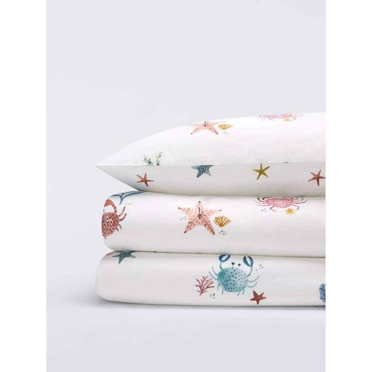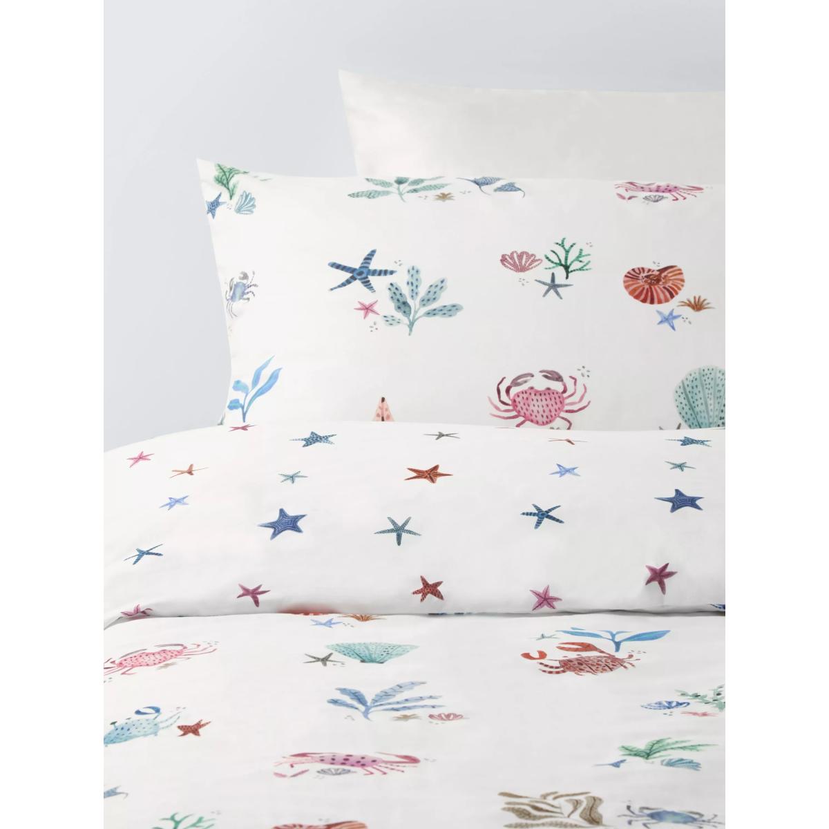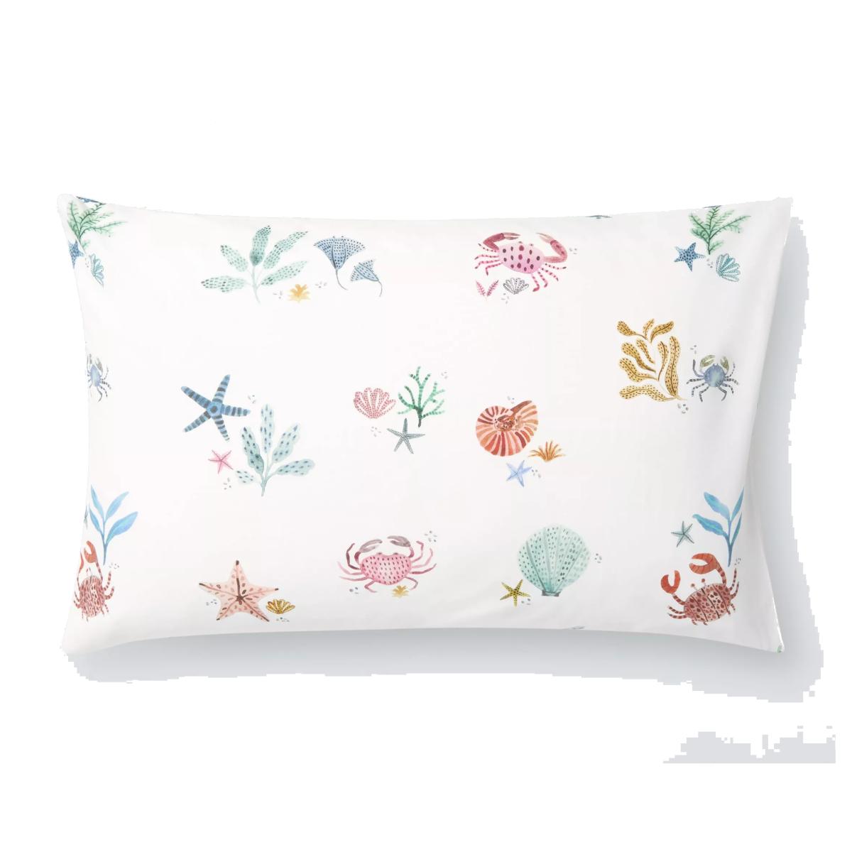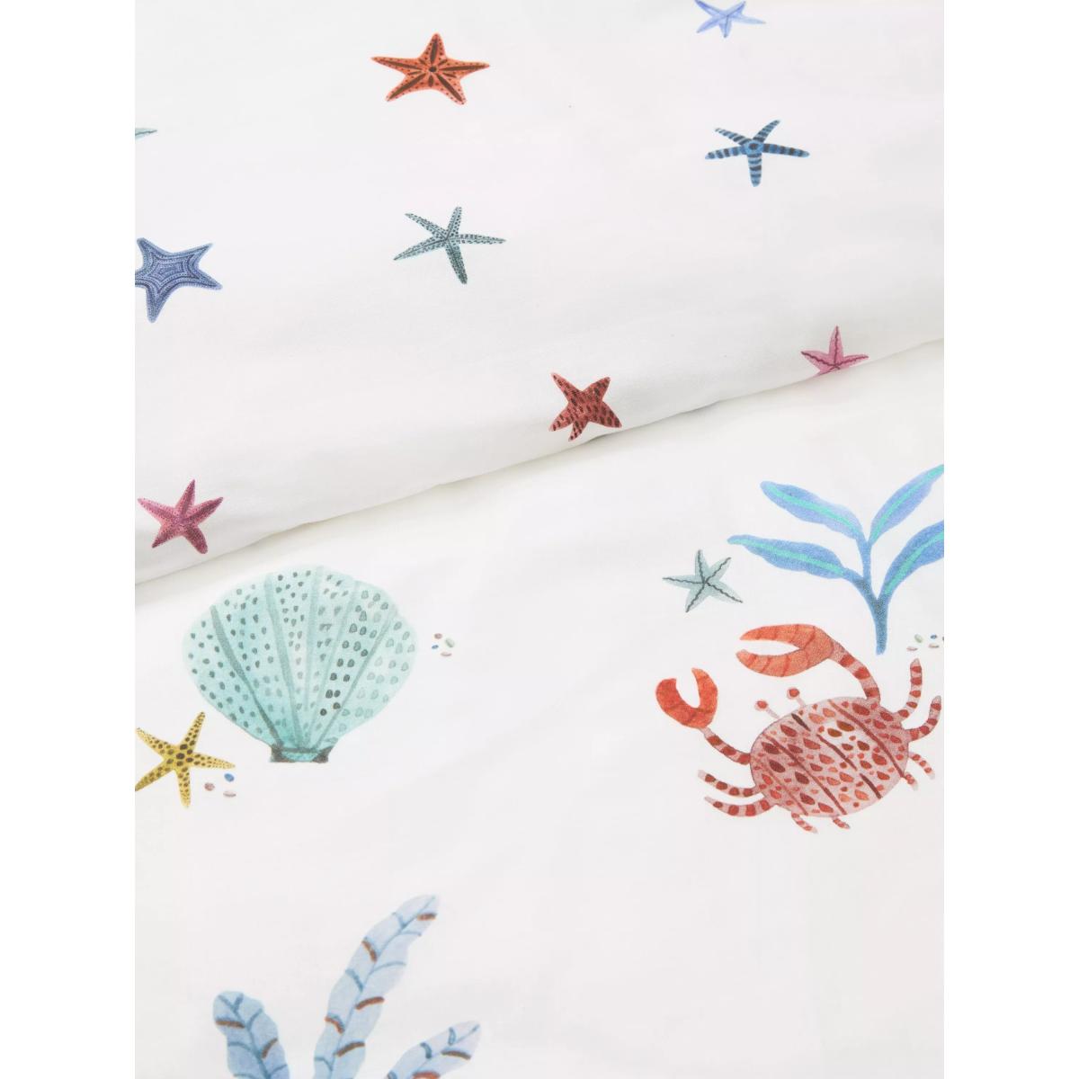 A playful coral reef print decorates this duvet cover and pillowcase set - perfect for nautical-themed rooms. This colourful duvet cover and pillowcase set is made from pure cotton that has a soft handle and breathable feel. It features a secondary print on the reverse, allowing you to change their sleep setting after every wash. Good to know: The cot, cotbed and single sets come with one pillowcase and the double set comes with two standard pillowcases. To fit duvet/pillow size (cm) Junior pillowcase L60 x W40cm Standard pillowcase, L75 x W50cm Cot duvet cover, L100 x W120cm Cotbed duvet cover, L150 x W120cm Single duvet cover, L200 x W135cm Double duvet cover, L200 x W200cm Please remember: Quilts, duvets and pillows are not suitable for children under 12 months due to the risk of overheating. Have you thought about sheeting? Shop here