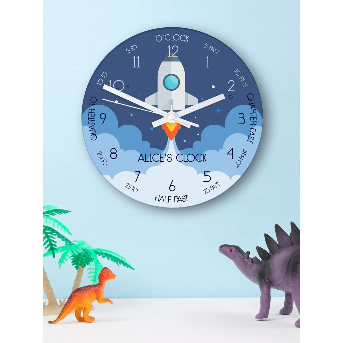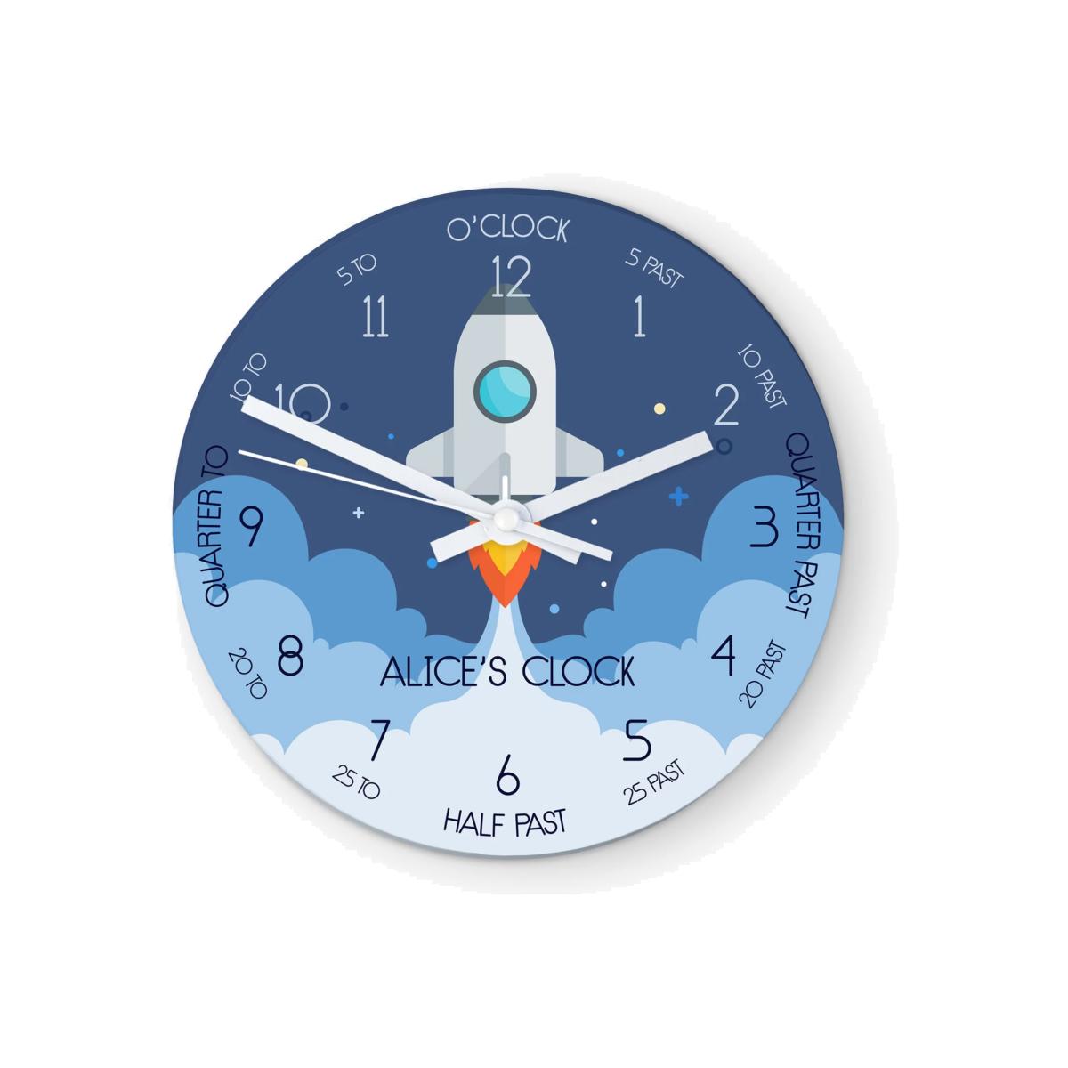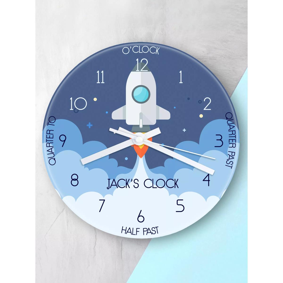 It's time to blast off! Help your child learn how to tell the time with this fun clock, which can be personalised with a child's name on the front. Ideal for hanging on a kid's bedroom wall, this glass wall clock makes a wonderful focal point with its bright and bold colour scheme.