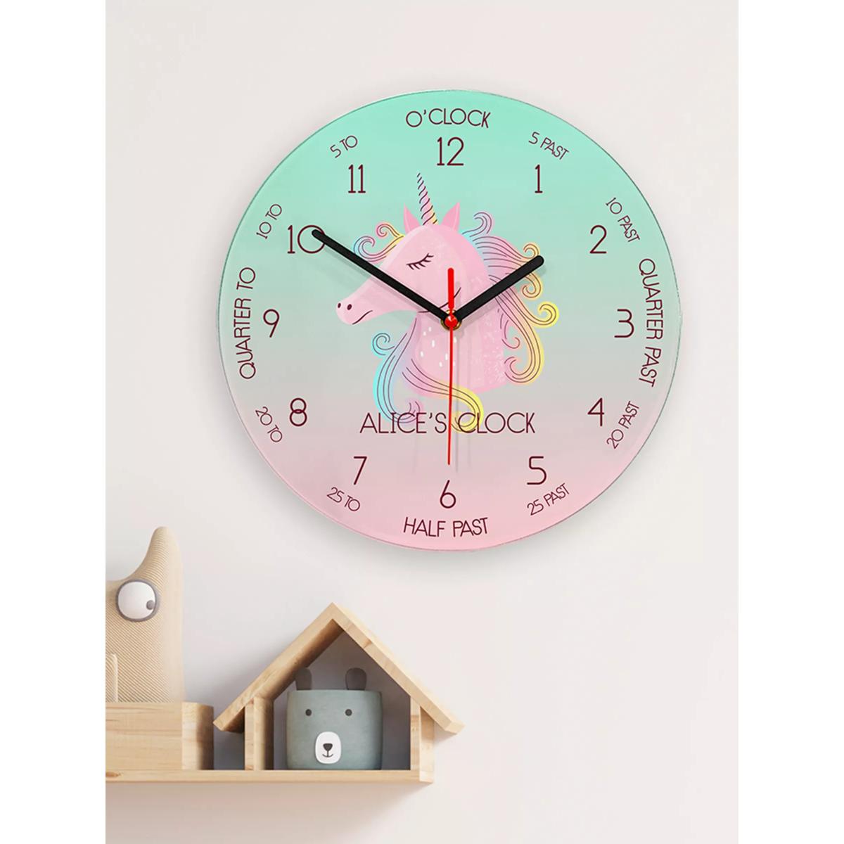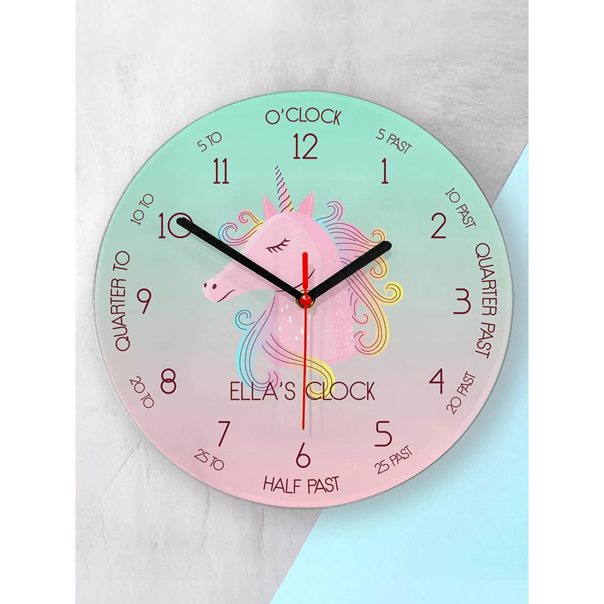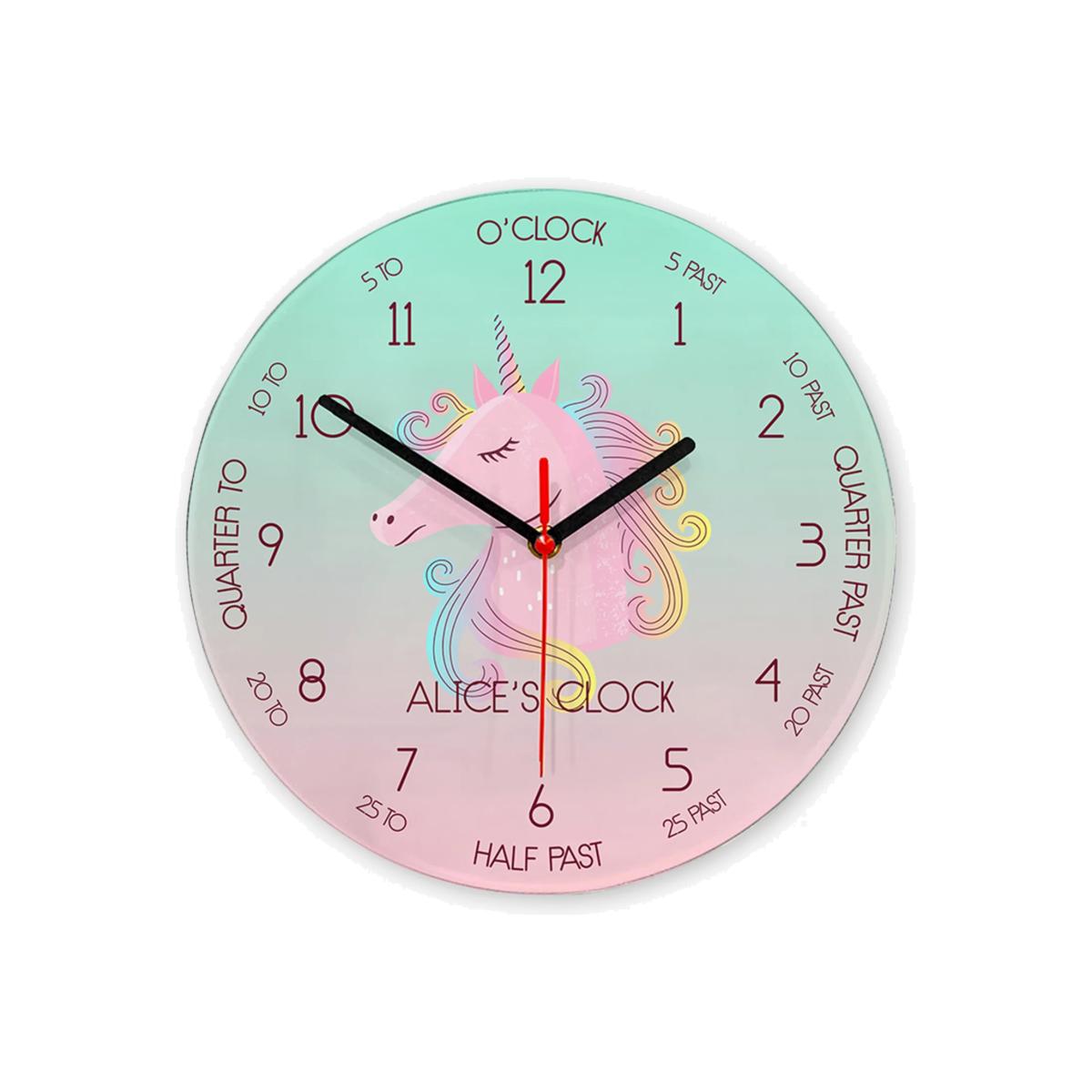 Help your child learn how to tell the time with this fun Unicorn clock, which can be personalised with a child's name on the front. Ideal for hanging on a kid's bedroom wall, this glass wall clock makes a wonderful focal point with its bright and bold colour scheme.
