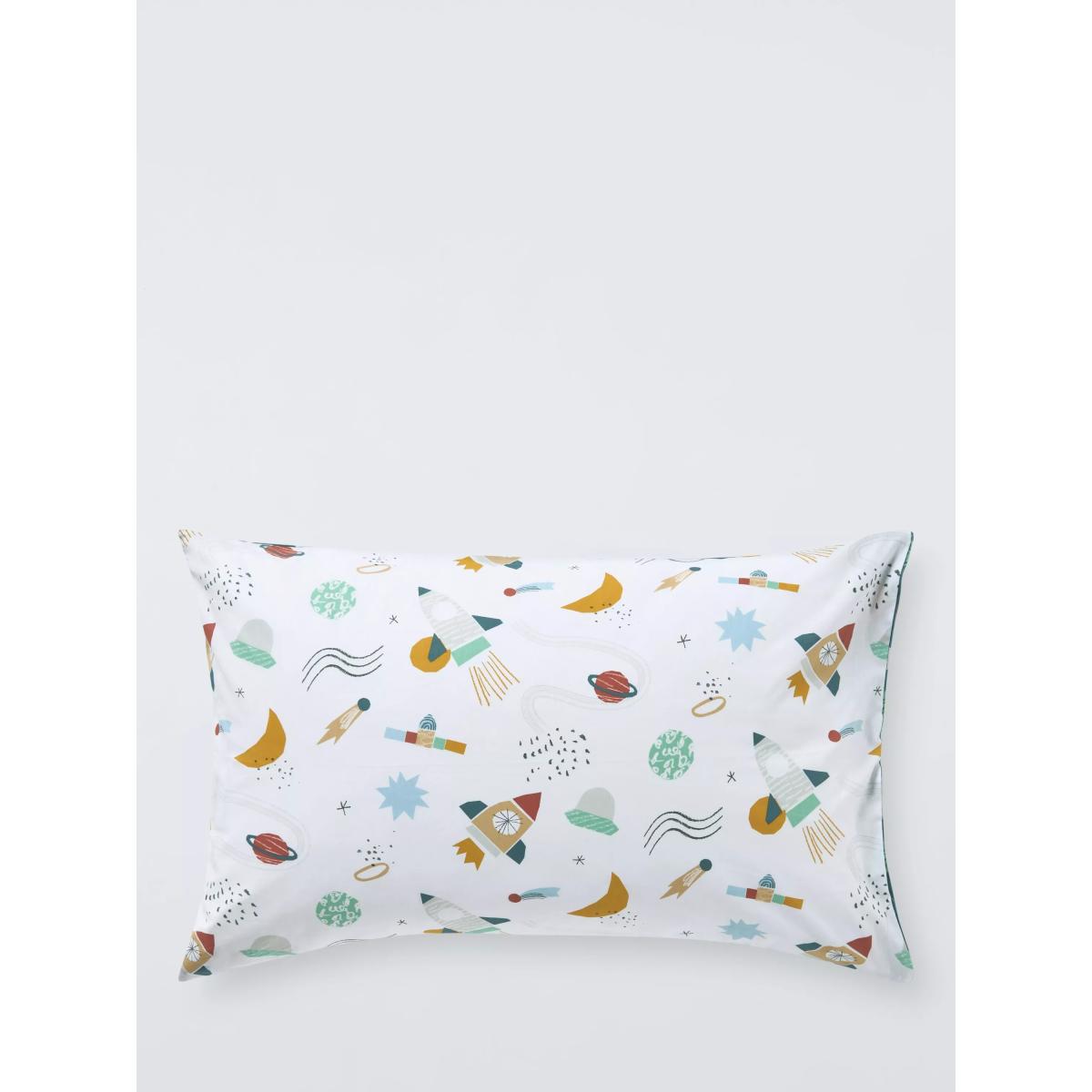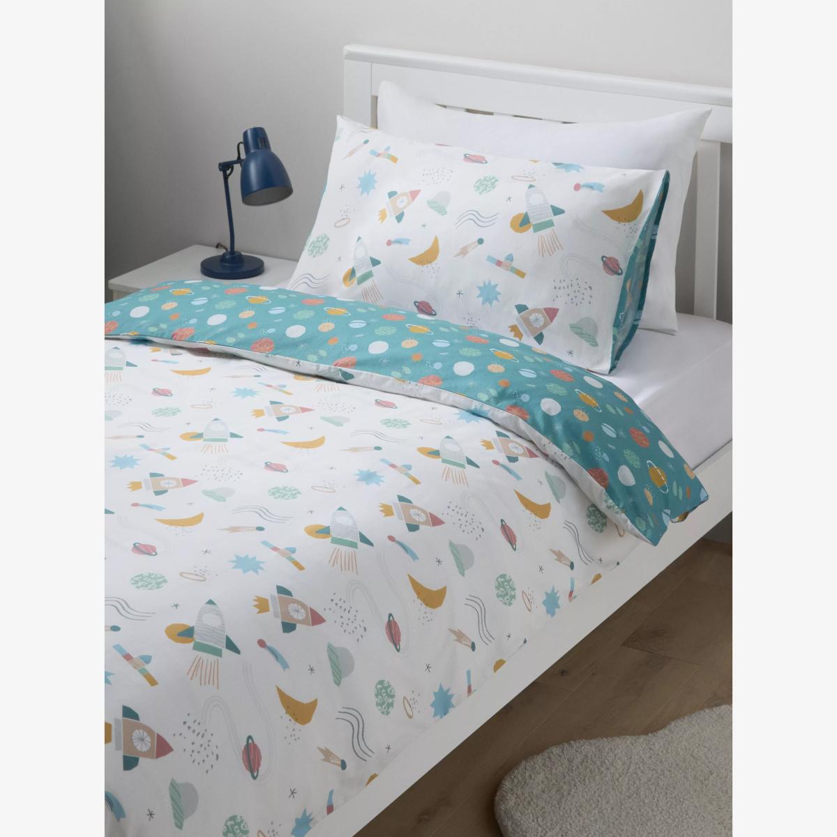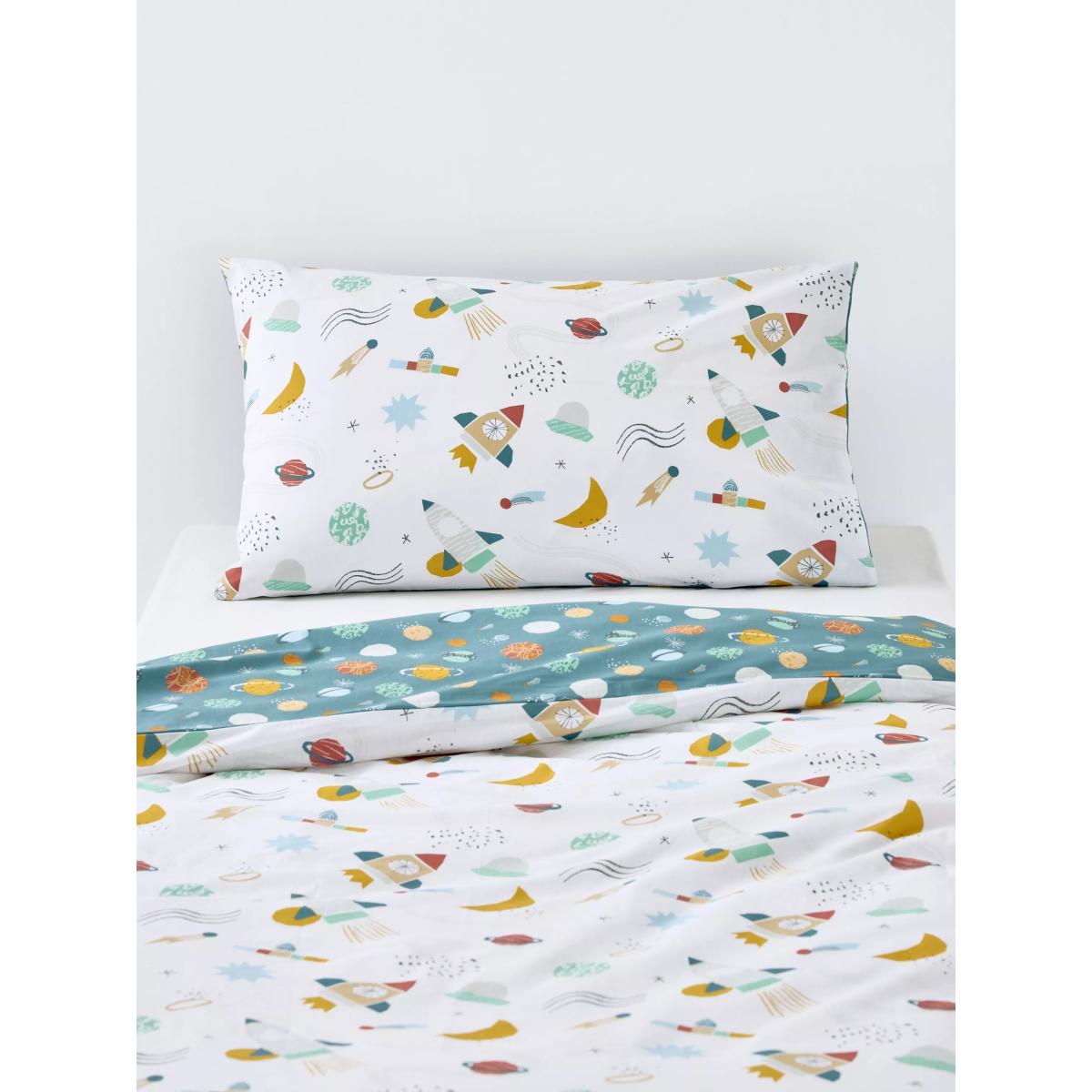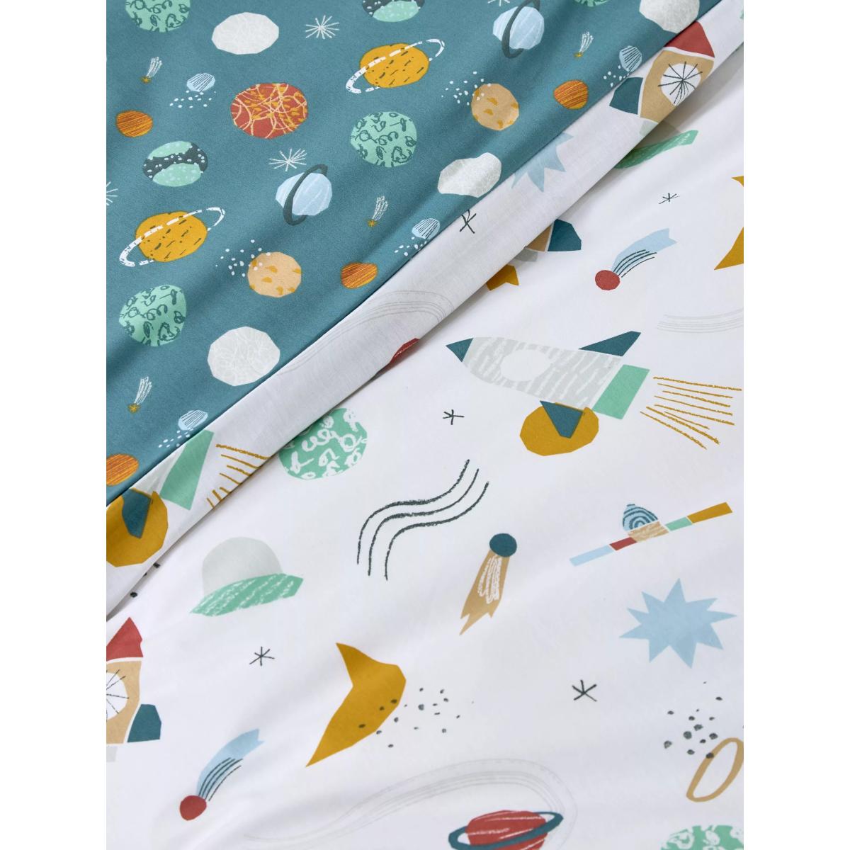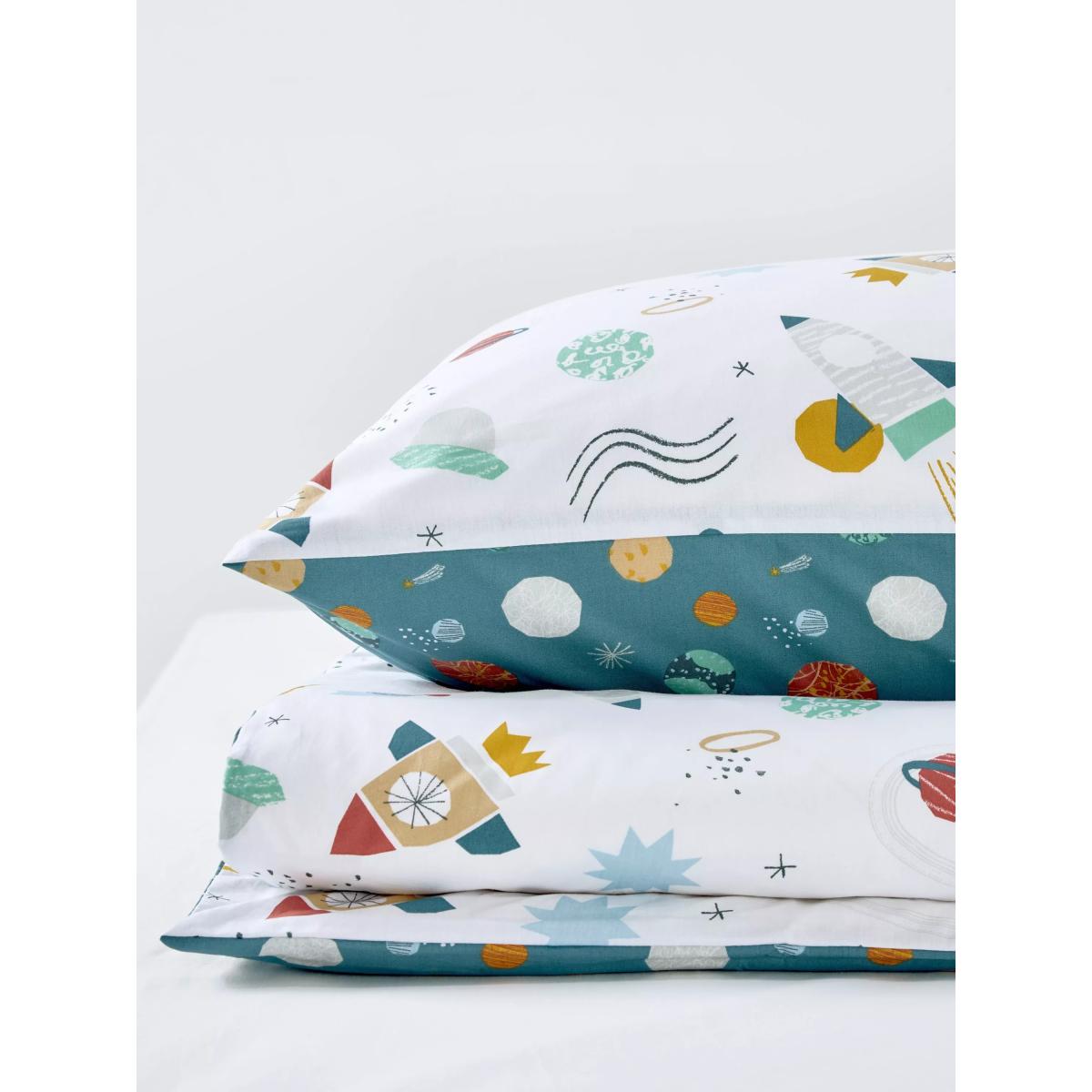 Zoom, zoom zoom, we're going to the moon! And Mars, and Jupiter, and the rest! Budding astronauts will love this reversible duvet cover and pillowcase set with cartoon outer-space designs. Made from 100% cotton and with a 180 thread count it balances durability with softness and breathability - the ideal foundation for a good night's sleep. Good to know: The cot, cotbed and single sets come with one pillowcase and the double set comes with two standard pillowcases. To fit duvet/pillow size (cm): Junior pillowcase L60 x W40cm Standard pillowcase, L75 x W50cm Cot duvet cover, L100 x W120cm Cotbed duvet cover, L150 x W120cm Single duvet cover, L200 x W135cm Double duvet cover, L200 x W200cm Please remember: Quilts, duvets and pillows are not suitable for children under 12 months due to the risk of overheating.