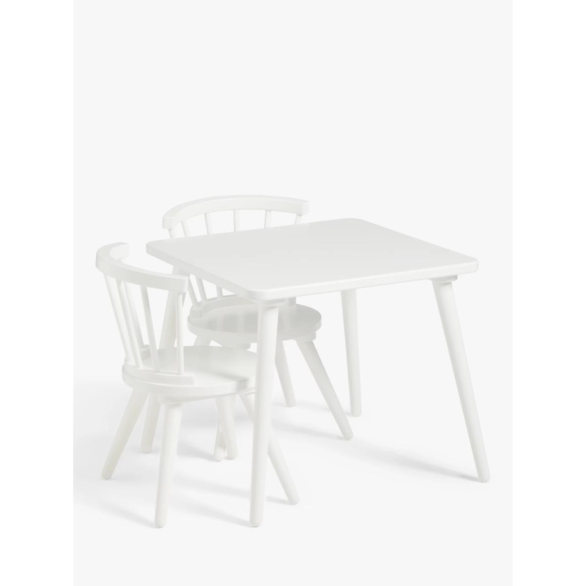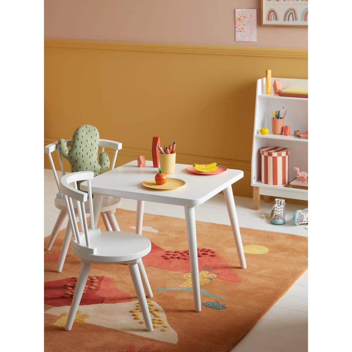 I’m a fan of this white kids’ spindle set for its clean lines and sturdy build - it slips effortlessly into Scandi, modern farmhouse or muted-tone nurseries without looking fussy. Its compact scale also makes it ideal for corner play zones in open-plan living spaces. To style it practically, lay a low-pile rug underneath to define the area and add a couple of pastel storage baskets beside for art supplies. A set of colourful place mats or wipe-clean mats keeps the surface neat, while small, non-toxic plant pots or framed prints on the wall above give the space personality.