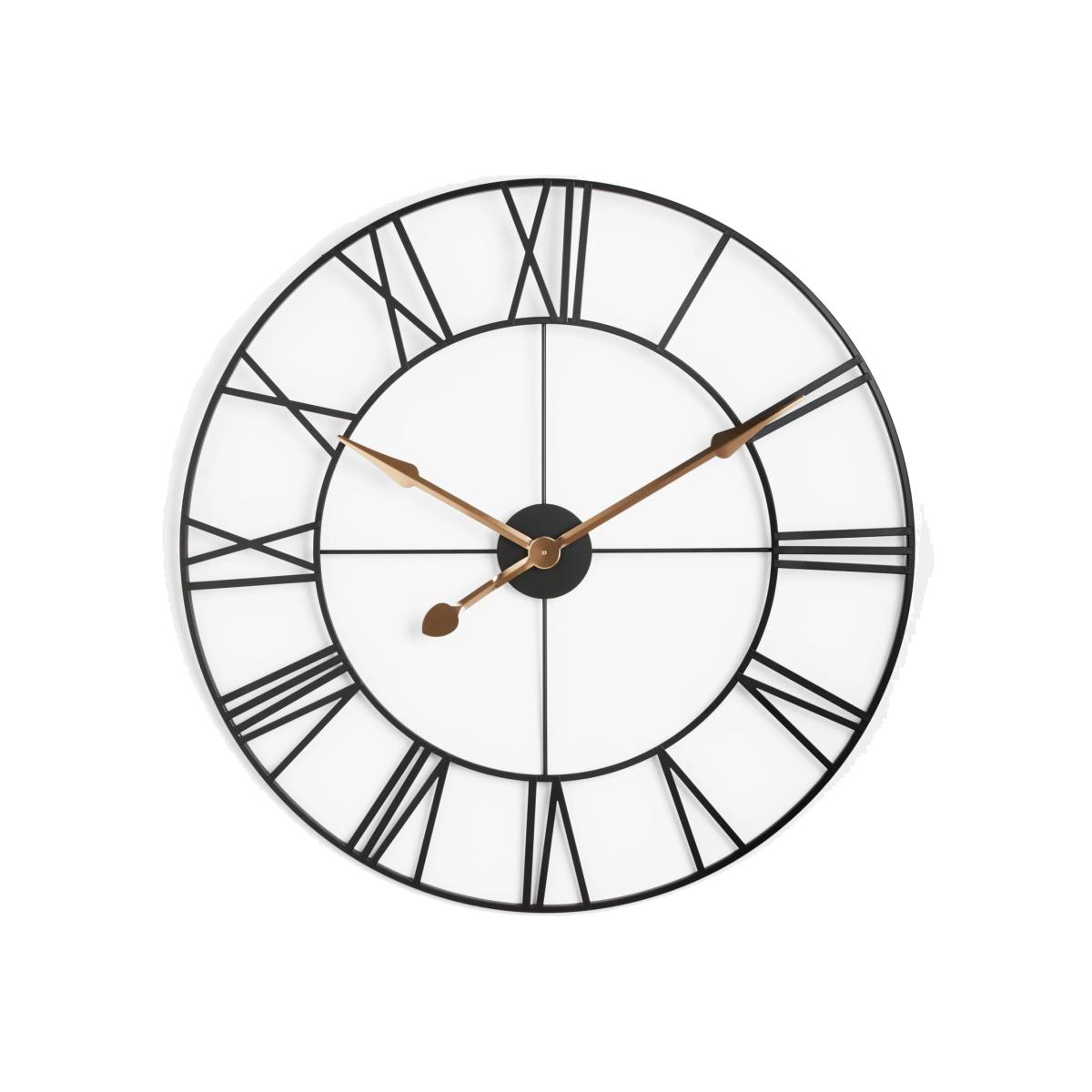 This large skeleton wall clock has an industrial look. The colour and texture of your wall show behind the clock's metallic finish. Traditional Roman numeral hour markers seamlessly integrate into your decor, with decorative clock hands making a striking contrast.
