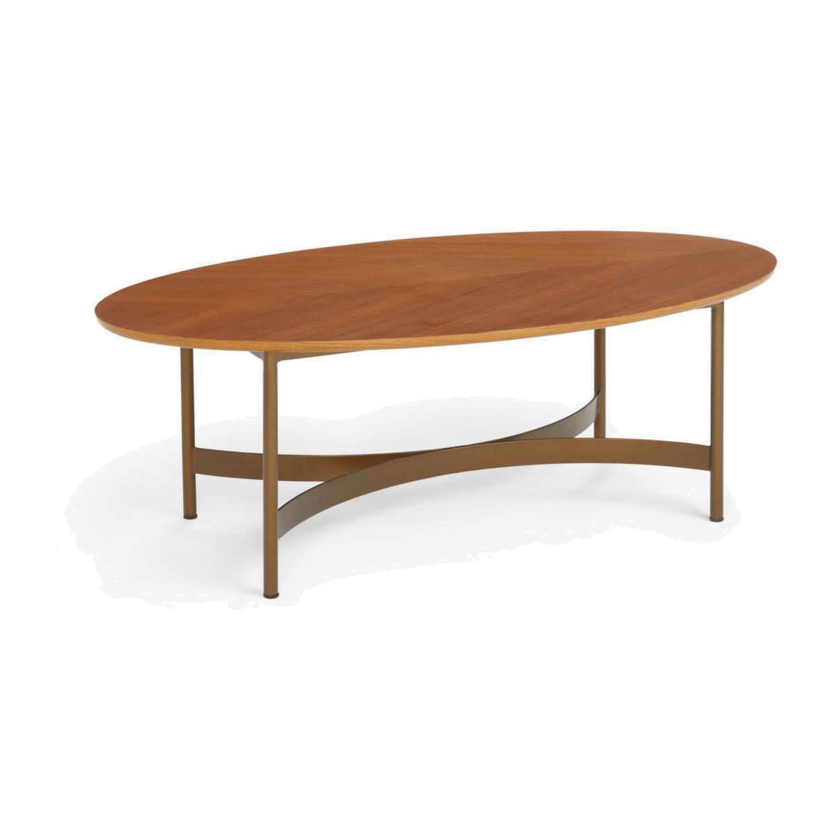The curvaceous top of this walnut veneer oval coffee table is echoed by the metal braces beneath, making this piece sturdy as well as attractive. A "fishbone" type veneer will look great against carpeting or parquet wood floors and sit well in a variety of living spaces including mid-century and modern. The legs are made from powder-coated metal. Want to see it first? You may want to see and get a feel for the furniture in one of our shops before ordering. We'll be able to tell you where the range you'd like to view is on display.