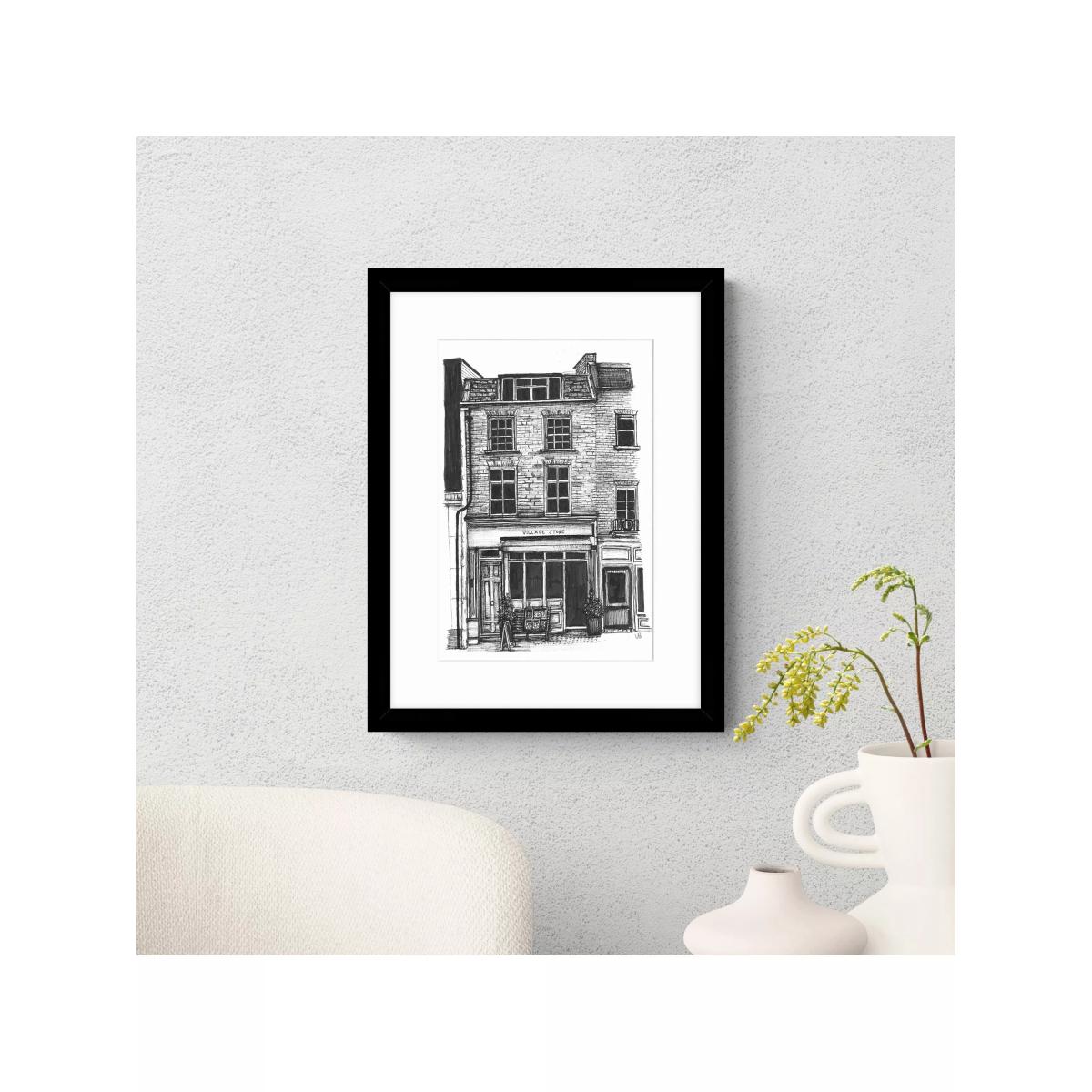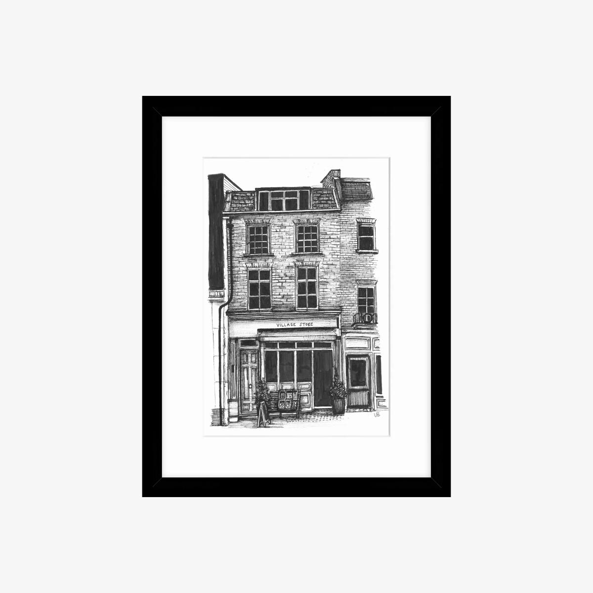 'Village Store' by artist Libby Bothway. This monochrome print is glazed and presented in a window mount and black frame, ready to hang on your wall.' by artist Libby Bothway. This print is glazed and presented in a window mount and black frame, ready to hang on your wall. Libby Bothway worked as a greeting card designer in the exciting creative studio at Woodmansterne. She created many of her own ranges and developed licensed ranges such as Quentin Blake, The Moomins, The Gruffalo and Roald Dahl. Have you thought about wall hooks and fittings?