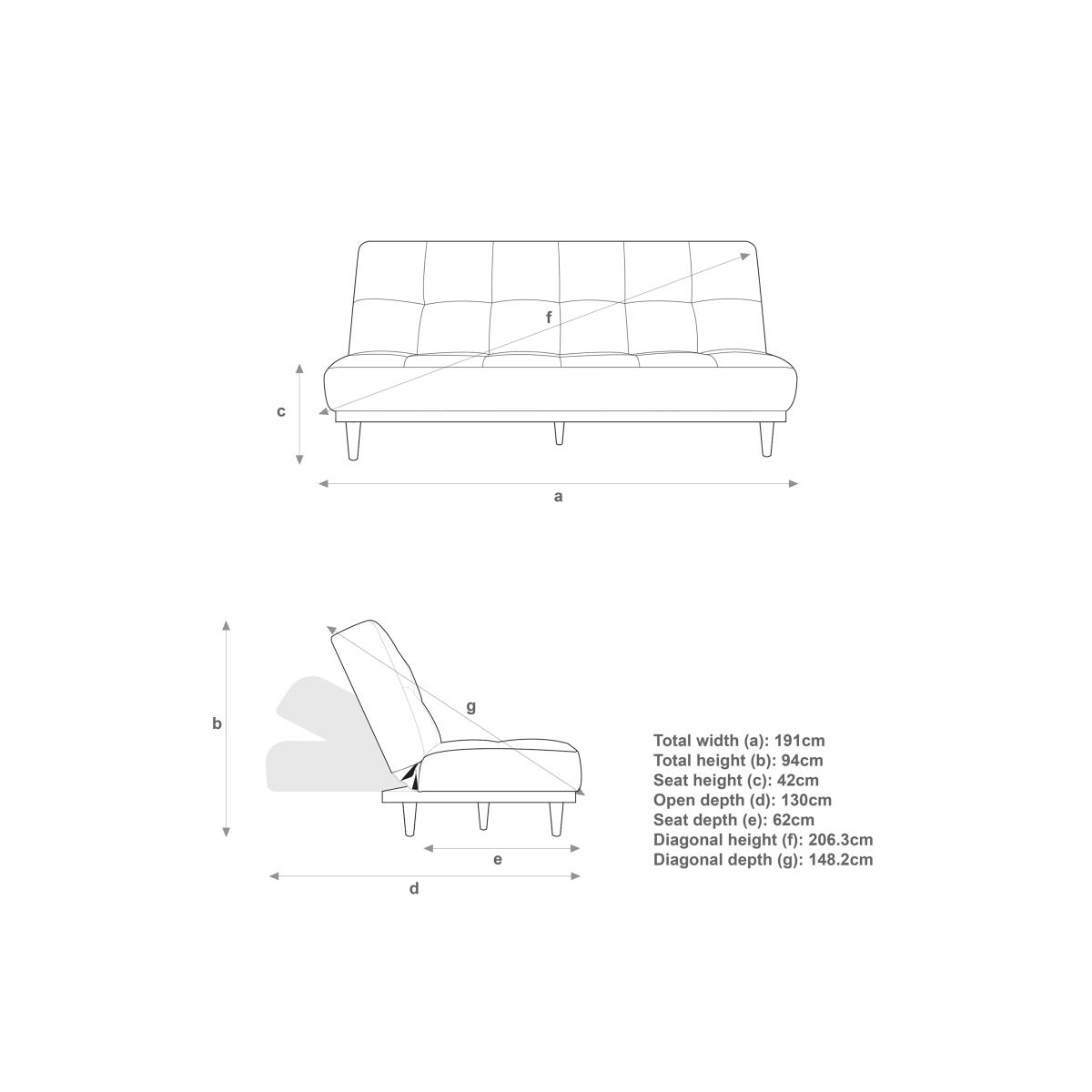 Product Information Sit, recline, sleep. Our quilted Linear sofa bed has three positions to choose from depending on just how chill you want your evening to be. Sits like a sofa, sleeps like a bedWhen assembled as a sofa the seats are supported by flexible webbing, the same as traditional sofas. This webbing provides great support to the foam and fibre filled cushions, which also benefit from individual pocket springs in the seats. These springs mould to your body when your sitting or lying on them, but then recover back to their original shape when you get up. Using a 2-fold mechanism it then easily opens up into the bed. This combination of webbing, springs, foam and fibre means it's not a case of either a comfortable sofa or a comfortable bed. You get both. It's the little thingsWe care about our furniture; how it's designed, the materials used and the people who make it. That's why every detail is carefully considered, with more than 20 quality checks, to ensure you're as proud of it as we are. Try before you buyWe're confident in our furniture's quality, but it's always a good idea to check that it's a good personal fit for you. Measuring Up for Furniture Guide Sofas, Sofa Beds & Chairs Buying Guide Upholstery Care Guide