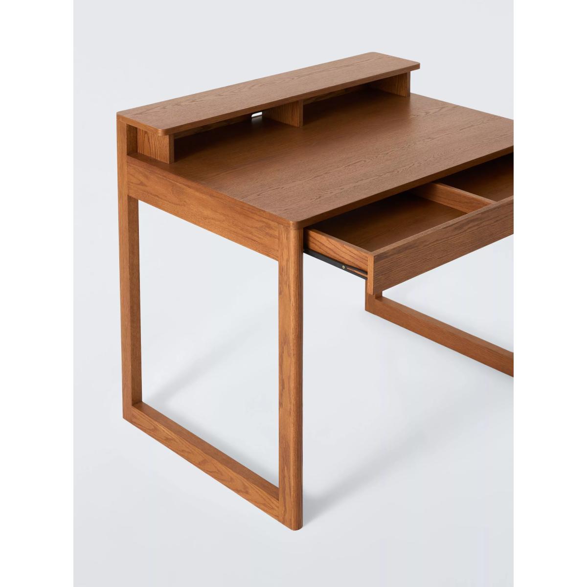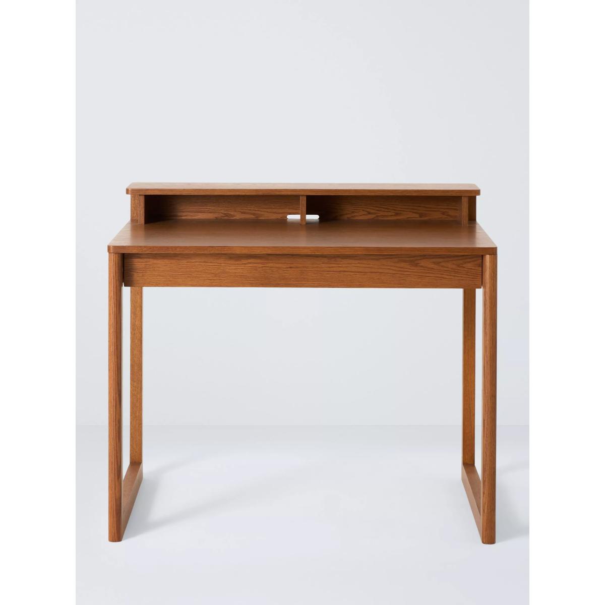 I’m a fan of this oak Loop desk for its clean lines and compact footprint - it slots neatly into home offices, bedroom corners or even open-plan living spaces without overwhelming the room. The warm red-oak finish pairs especially well with Scandi-inspired schemes, alongside muted greys, off-white walls and touches of black metal. Styling tips: keep the surface clutter-free by using a small woven tray for stationery and a slim LED task lamp. Add a potted plant on the raised shelf for a pop of greenery, and choose a simple upholstered chair in a neutral tone. Tuck a low storage basket underneath to hold notebooks or files and maintain that neat, lived-in look.