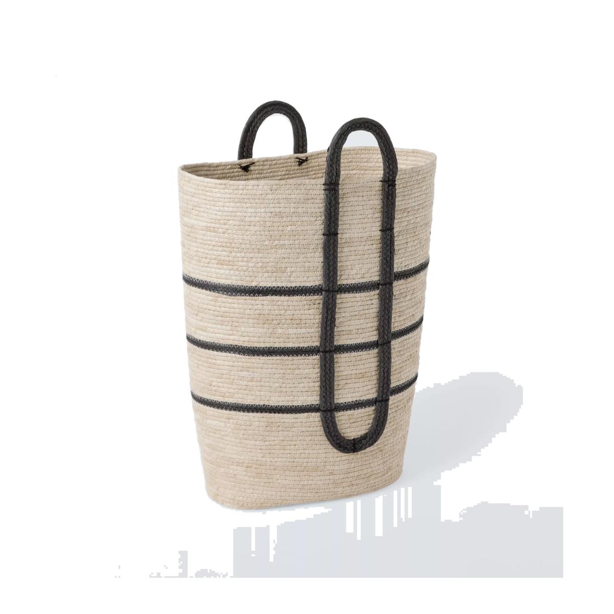 A soft-sided laundry basket, woven from maize and paper with contrast stripes and "O"-shaped handles.