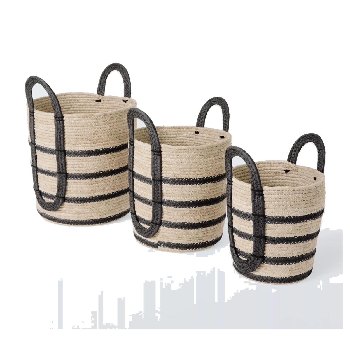 A set of three versatile storage baskets, woven from maize and paper, with contrast stripes and "O"-shaped handles.