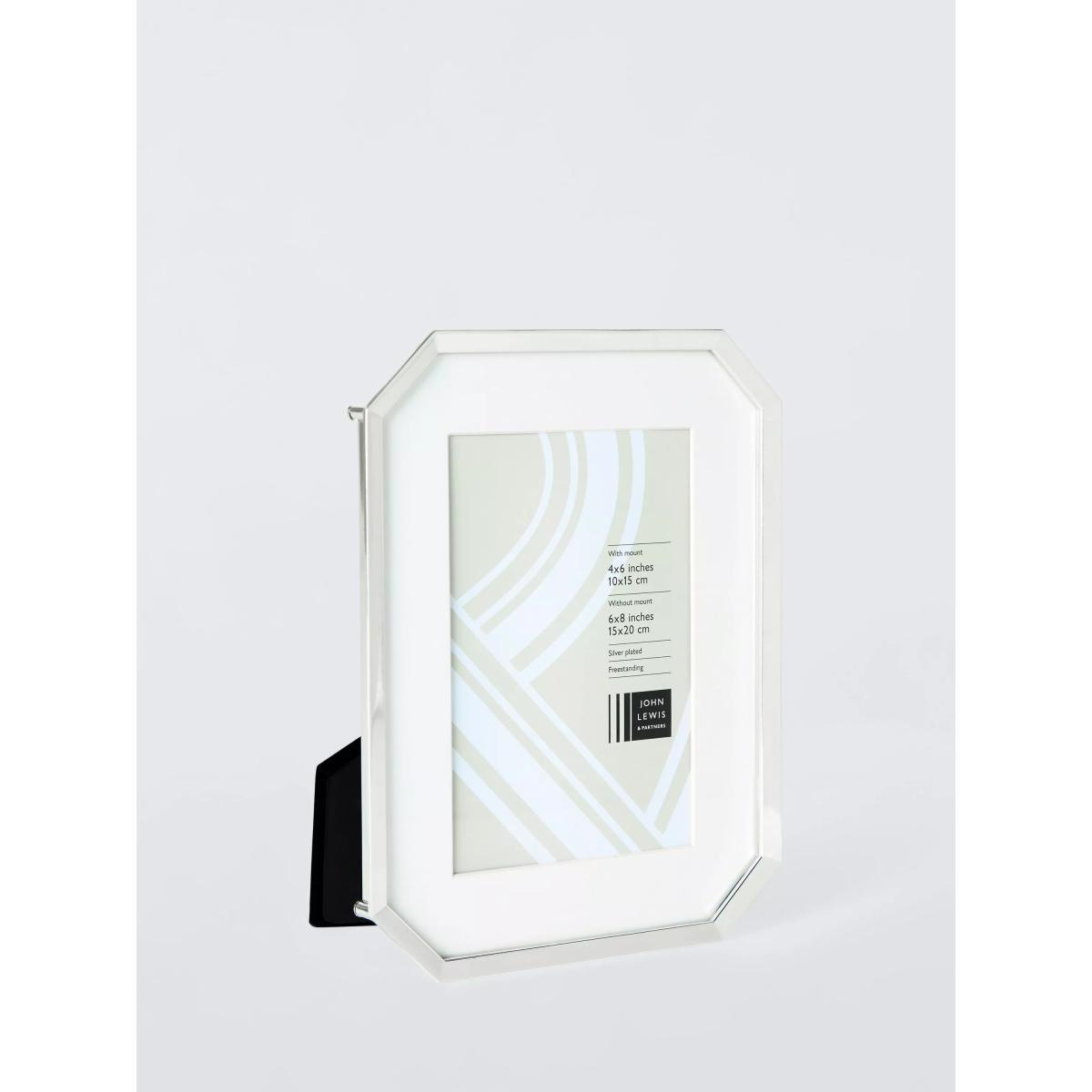 Timeless freestanding photo frame with cut-off corners. Made of silver-plated die-cast metal with a soft backing. Can be displayed vertically or horizontally. The photo sizes given are with the card window mount in place. Remove the mount, and you can display a slightly larger picture. The inch measurements are rounded measurements worked back from standard centimetre sizes.