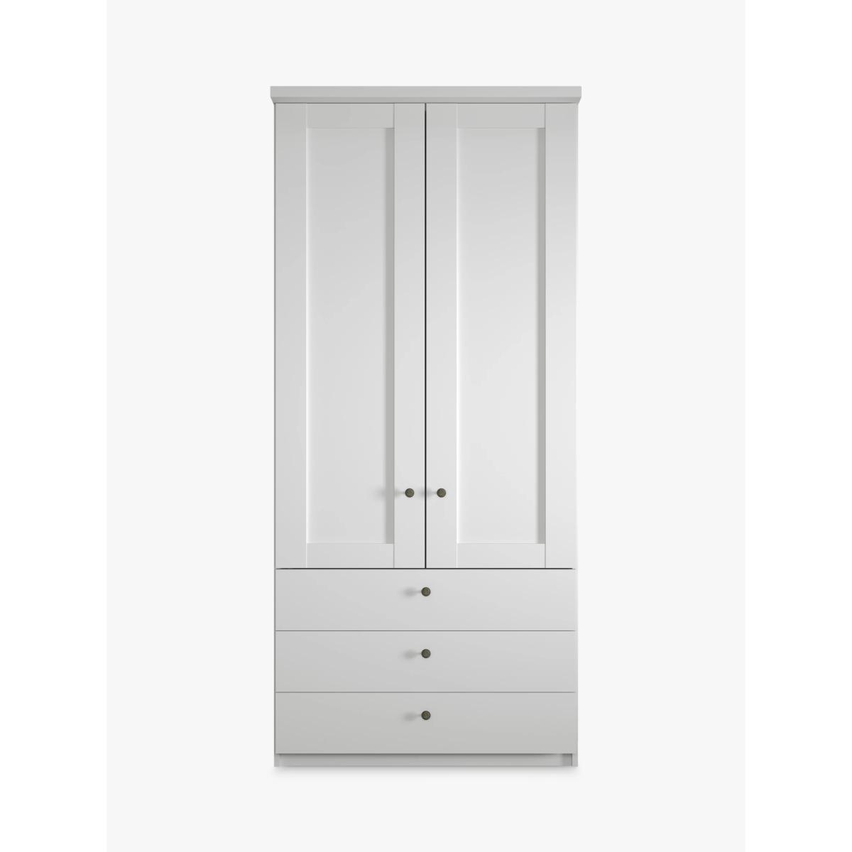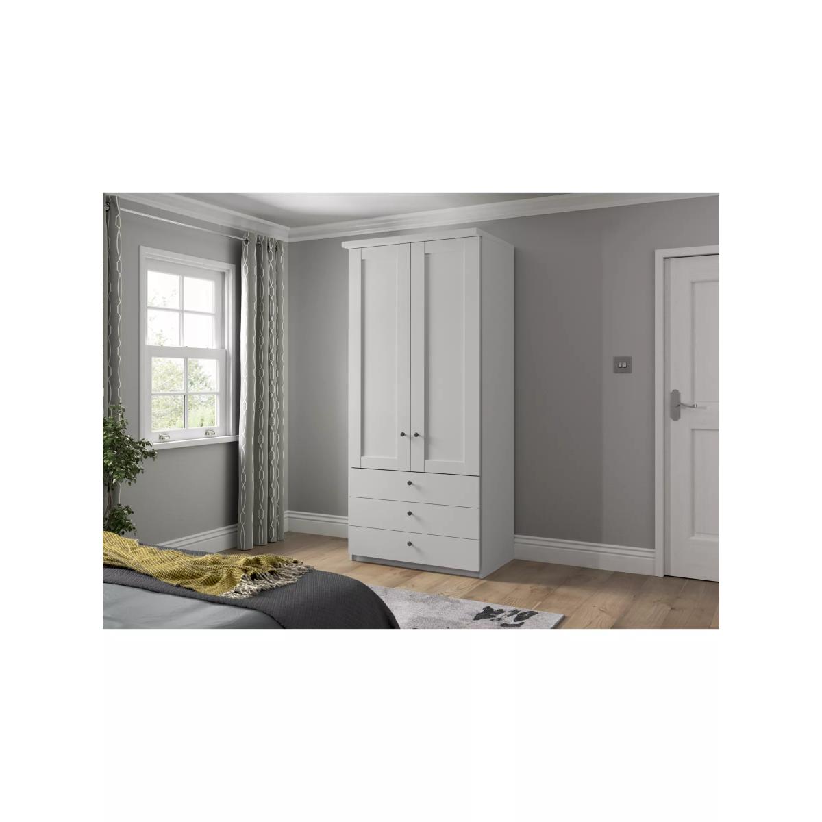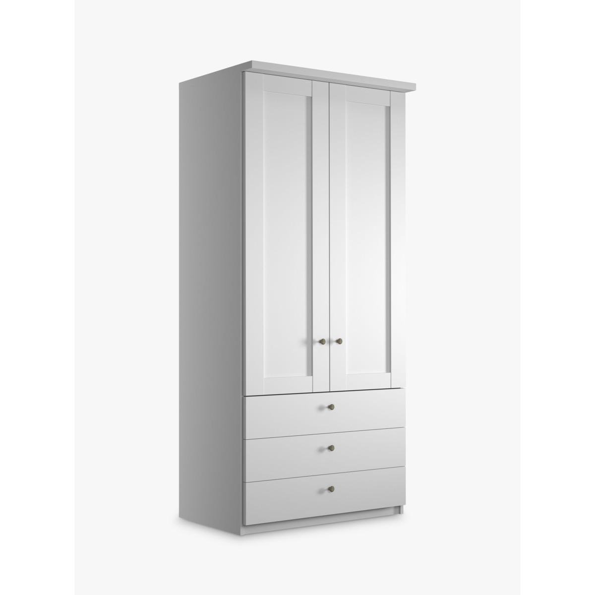 The elegant and classic look of our Marlow range suits most decor. Versatile and practical as a bedroom storage solution, the range is available in a choice of matt finishes:Off White, Pebble Grey and Graphite, and either with or without mirrors. The exterior is complemented with an attractive cornice detail at the top and hinged doors with handles in a pewter finish. This two-door wardrobe has three drawers at the bottom. The interior has a single compartment with two shelves and a hanging rail, all of which are fully adjustable to suit your requirements. This product is delivered and assembled by the supplier for your convenience. Compatible extra internal and external accessories available to purchase separately: Additional shelves - width 96.4cm Hanging rails - width 96.4cm Internal drawer units - width 96.4cm Internal LED lights External LED linear lights Want to see it first? You may want to see and get a feel for the furniture in one of our shops before ordering. We'll be able to tell you where the range you'd like to view is on display.