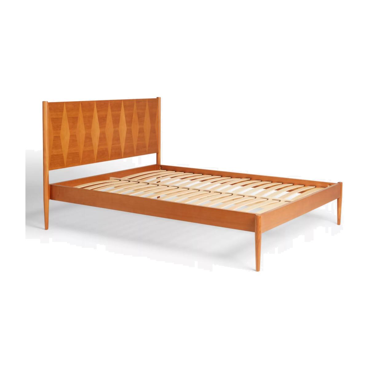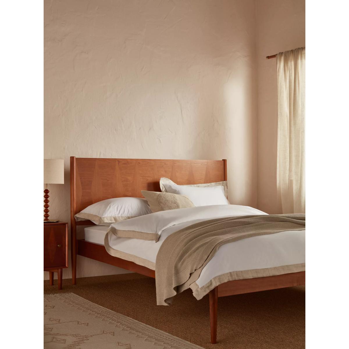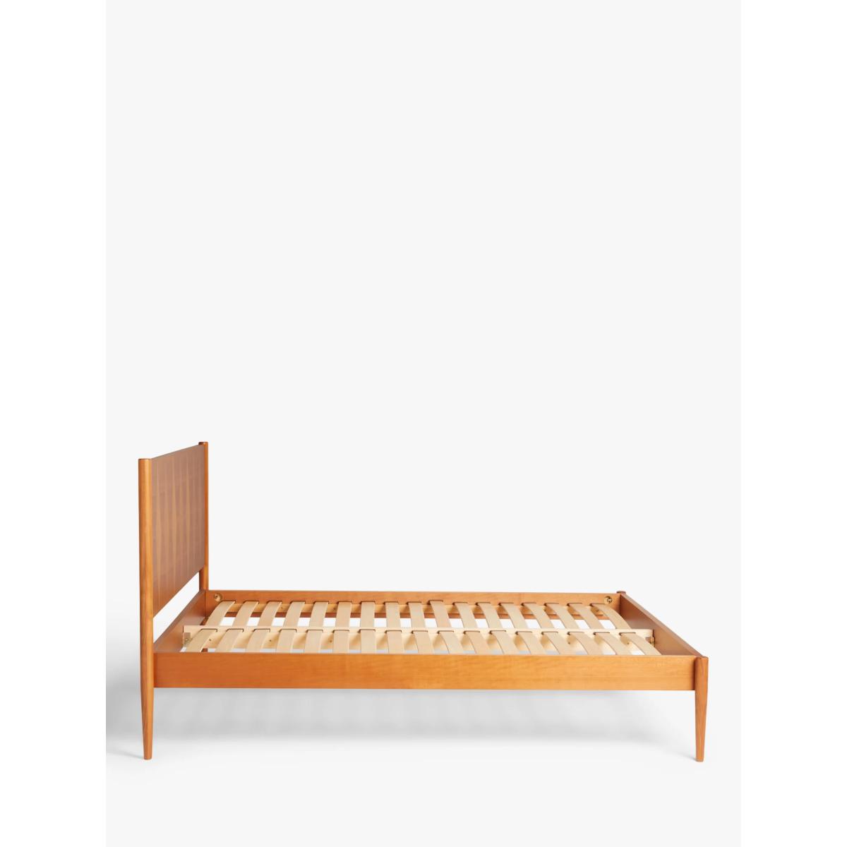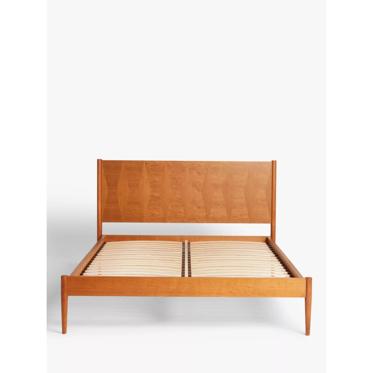Our Marquetry range of bedroom furniture celebrates marquetry techniques, with contrasting panels making the most of natural woodgrain patterns. Built from solid wood and veneers, this bed has a clean-lined headboard, rounded posts and tapered legs. We've kept the finish natural to create a calming environment in your bedroom. Plus, sprung slats provide a supportive base for your mattress. Want to see it first? You may want to see and get a feel for the furniture in one of our shops before ordering. We'll be able to tell you where the range you'd like to view is on display.