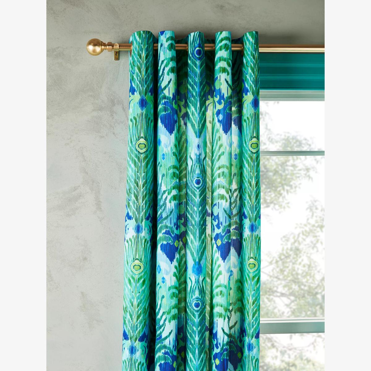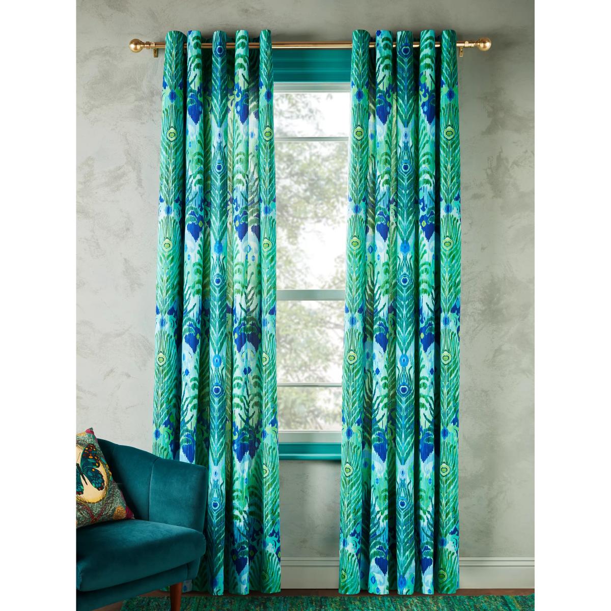 Nature's riotous beauty, brought home An exclusive collaboration with Matthew Williamson, master of colour and pattern. The energy of the great outdoors, beautifully captured. Printed on a luxurious heavy sateen base, the majestic fronds of a peacock feather are picked out in vibrant tones on these eyelet curtains. The lining adds the perfect finish, improving the drape and enhancing the vibrancy of the pattern. Better Cotton By choosing our cotton products, you’re supporting our investment in Better Cotton’s mission to help cotton communities survive and thrive while protecting and restoring the environment. Better Cotton Farmers are farmers who care for the environment and respect workers’ rights and wellbeing. This product is sourced via a system of mass balance and therefore may not contain Better Cotton. bettercotton.org/massbalance The width stated indicates the size of one curtain panel when laid completely flat. This pack contains two panels and the track/pole length we've recommended allows for the two panels to be gathered when the curtains are drawn. For a fuller look, increase the curtain width. One pair of 167cm width curtains will fit a curtain track/pole size 133-167cm One pair of 228cm width curtains will fit a curtain track/pole size 182-228cm Worth knowing... We package our curtains in recycled materials to keep them protected whilst they make their way to you. This means that when they arrive there could be some creases in them. We recommend you hang them for a few days to allow them to flatten and for the creases to fall out. If after this period your curtains still show signs of being folded then follow the ironing instructions on the back of the packaging. Be aware that each style of curtain has different ironing instructions, including heat limitations according to the fabric, so do make sure you follow the guidance provided to get the best results. Do you need a curtain pole and accessories? Shop them here.