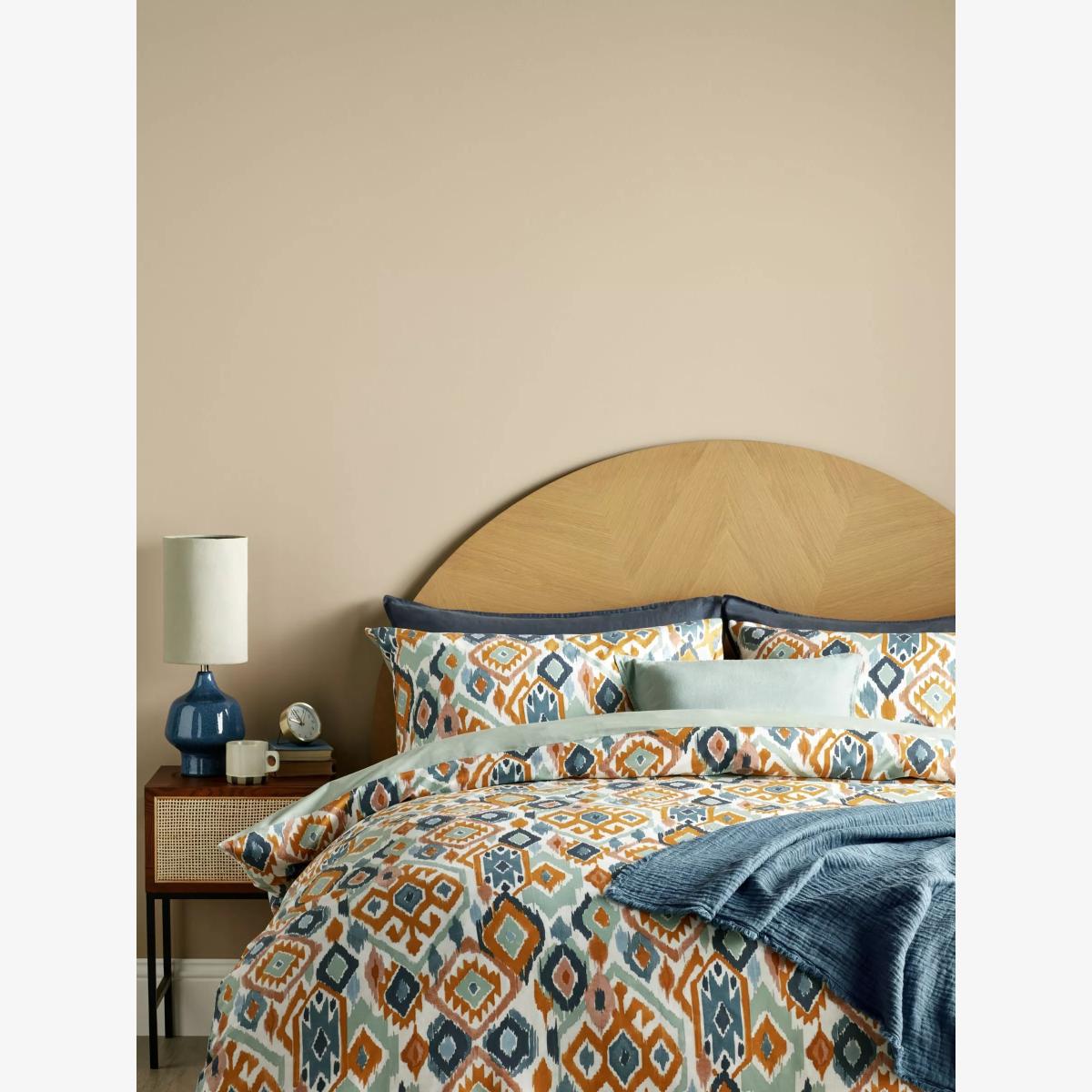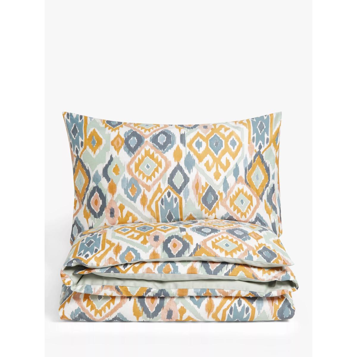 The colourful Ikat style print of this bedding contrasts beautifully with the cool, pale green reverse. This bedding is made from cotton sateen fabric which is naturally breathable, helping keep you cool and comfortable throughout the night. The single set comes with one standard pillowcase, while the double, king and super king sets come with two standard pillowcases. Bedding sizes To fit duvet/pillow size (cm) Standard pillowcase, L75 x W50cm Single duvet cover, L200 x W135cm Double duvet cover, L200 x W200cm King duvet cover, L220 x W225cm Super king duvet cover, L220 x W260cm