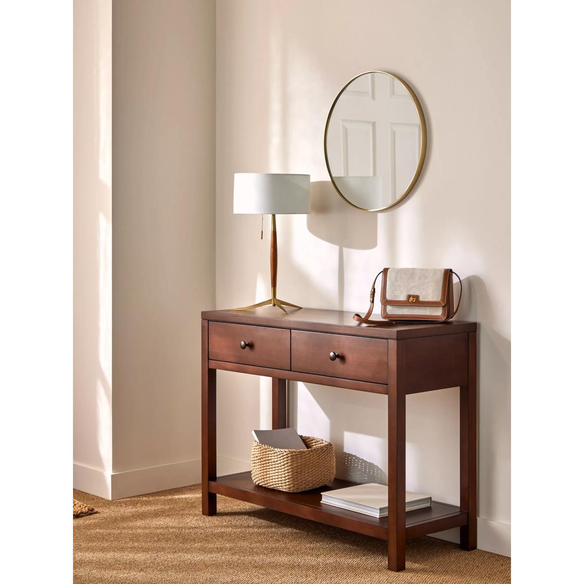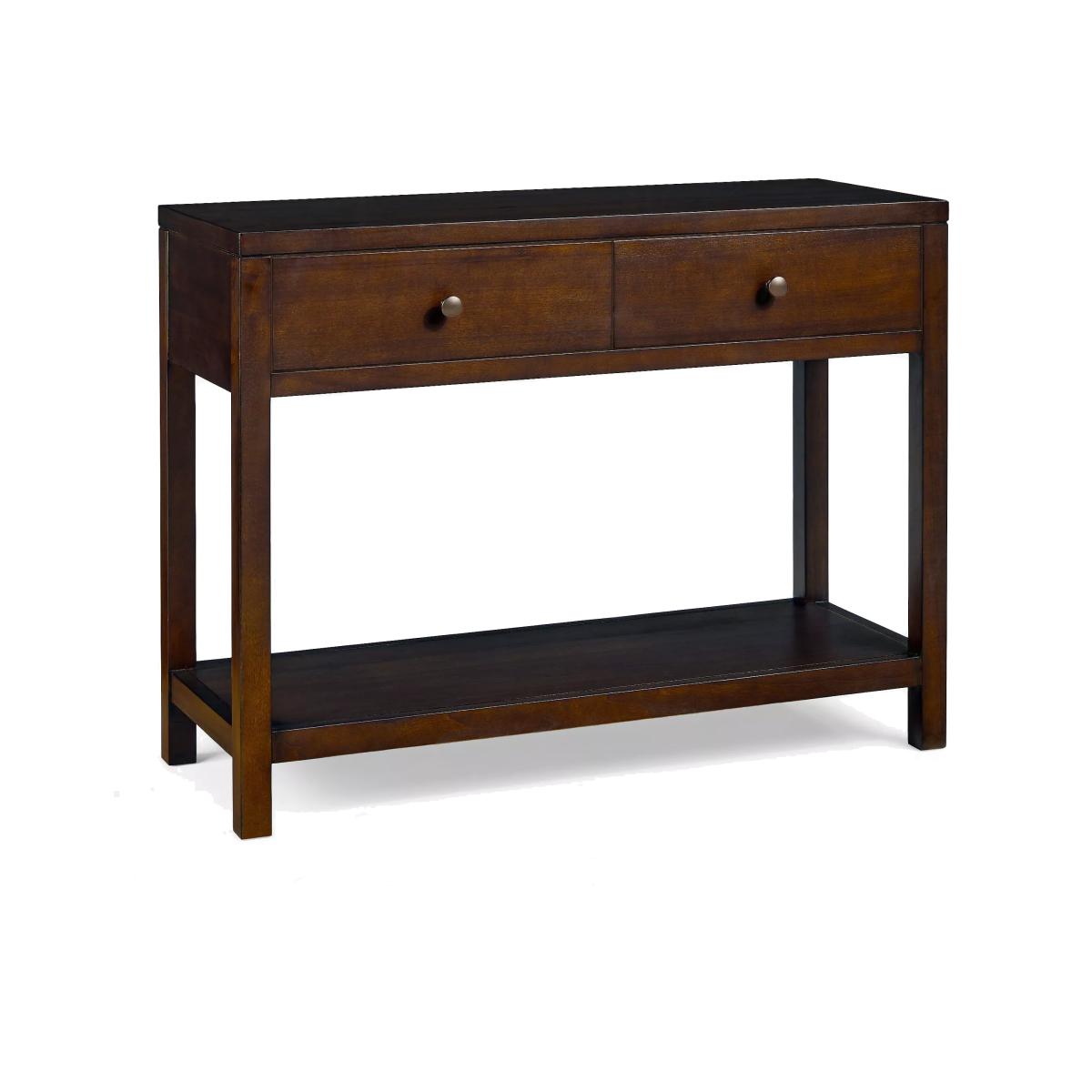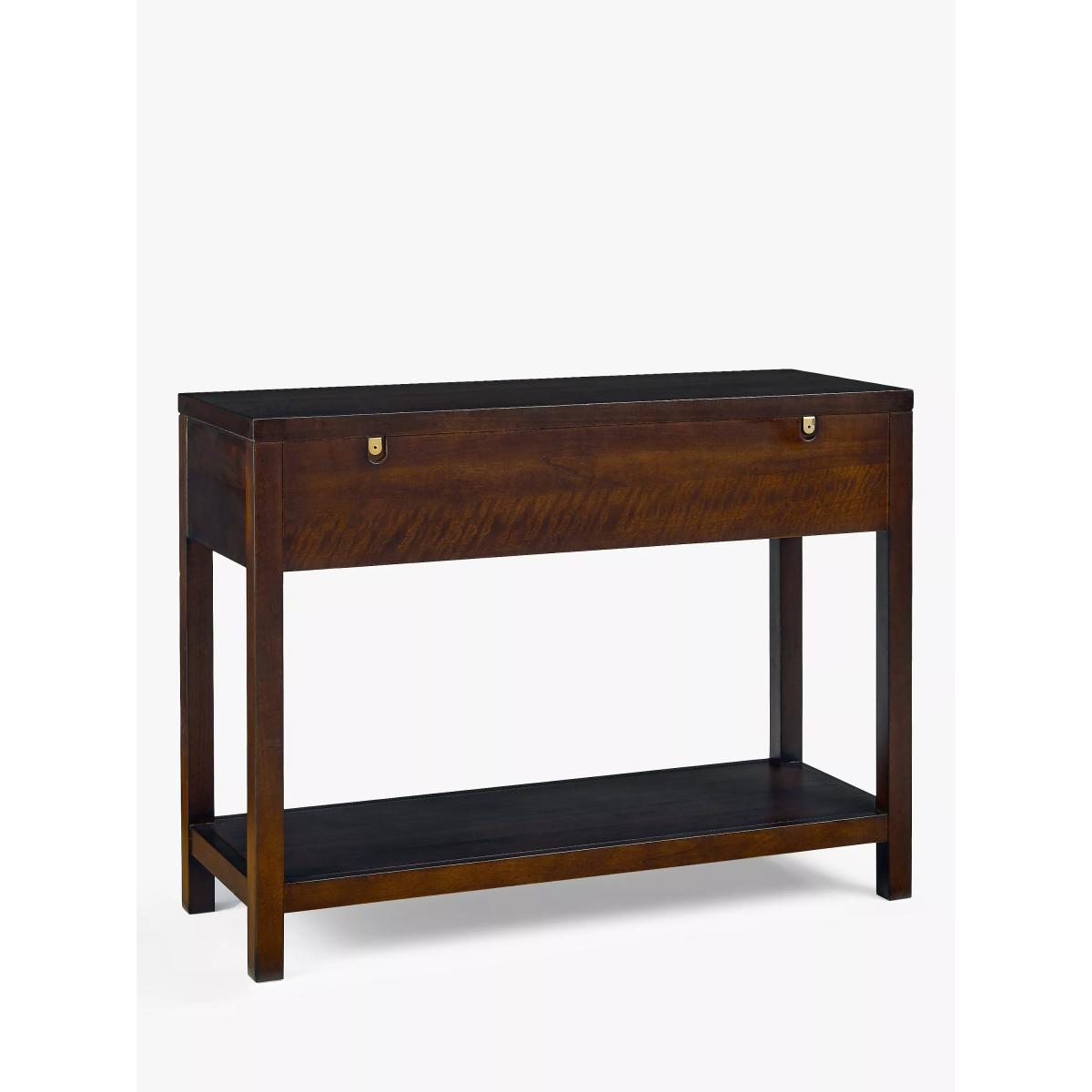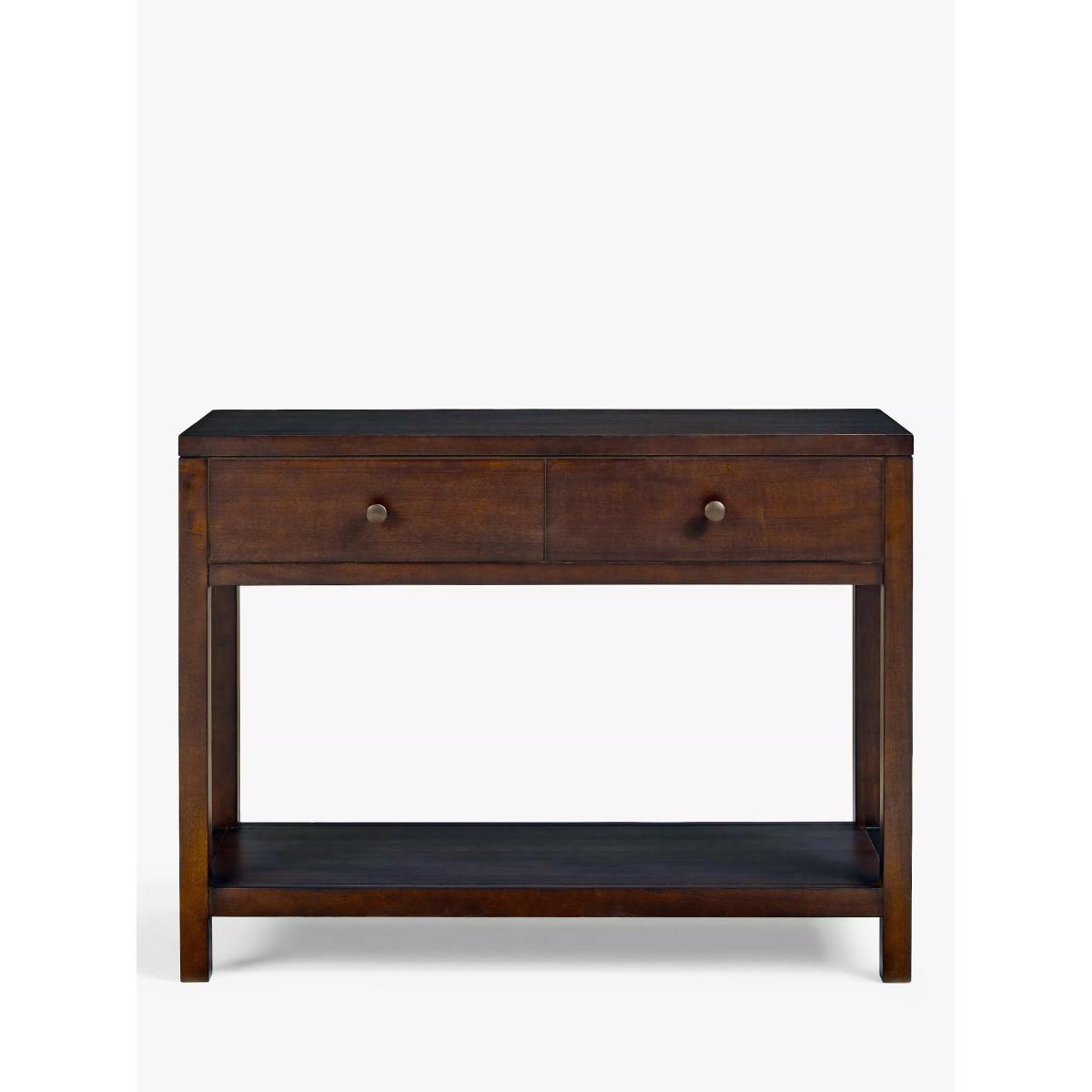 Exhibiting a traditional, yet timeless design, our Medan range is a considered choice for your living room. Made from wood and with a smooth, dark lacquered finish, this console table features 2 drawers and a shelf at the base for a combination of storage and display. It would also make a practical piece for a hallway. Its sturdy profile is complemented with metal knob handles that lend a refined finish. Want to see it first? You may want to see and get a feel for the furniture in one of our shops before ordering. We'll be able to tell you where the range you'd like to view is on display.