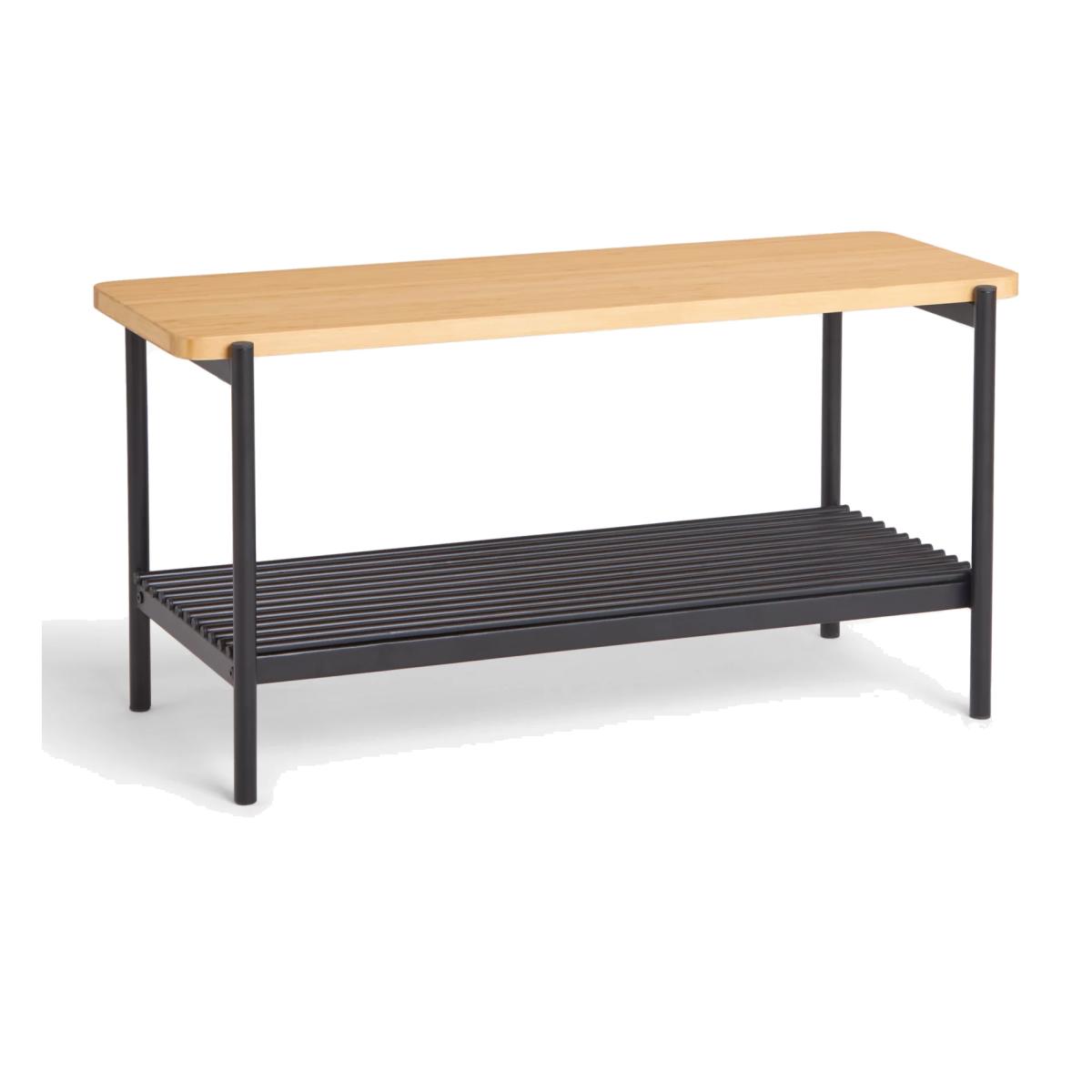 Sturdy shoe bench with a metal frame and lower shelf for keeping shoes. Use the bamboo top for storage or take a seat and pull on your footwear.