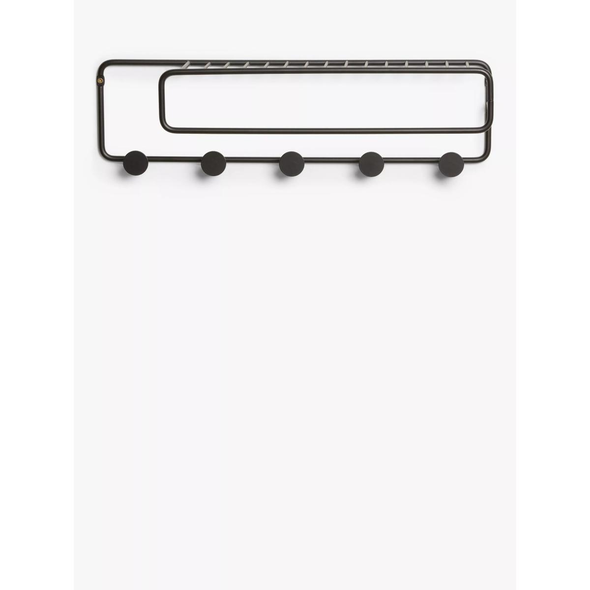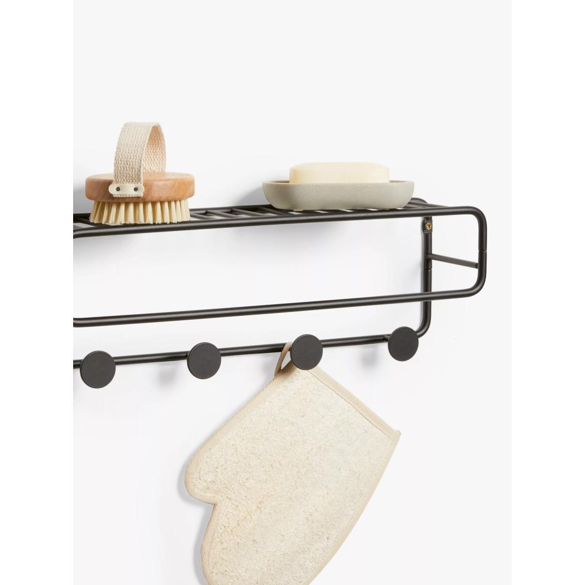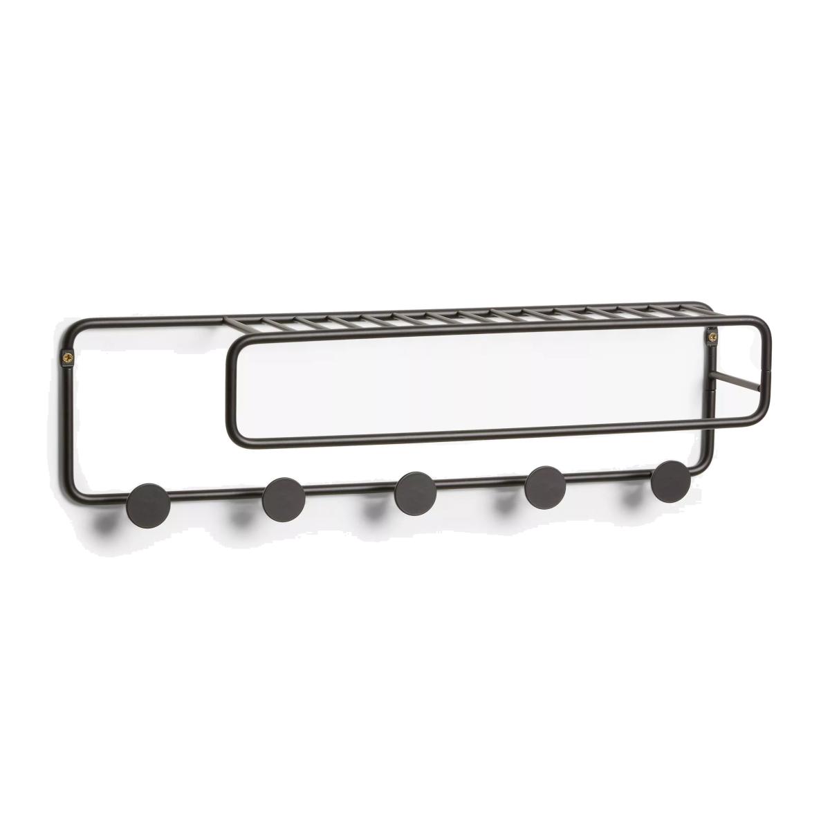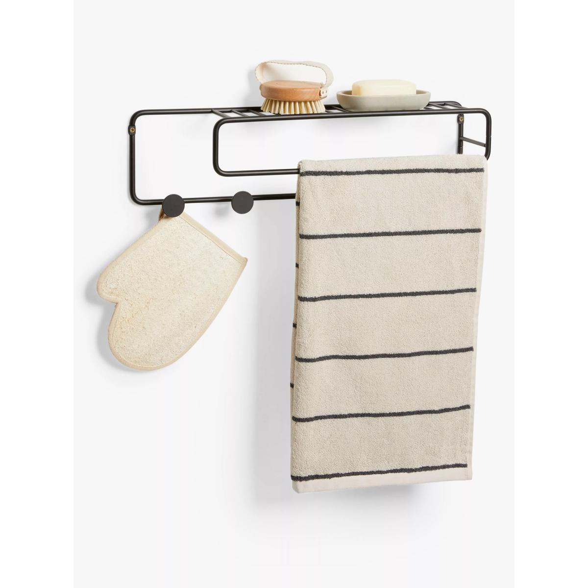 This minimalist metal wall unit holds all your bathroom essentials. It combines a shelf with 5 hanging knobs and a rail to hold a towel. It's also useful for hallways.