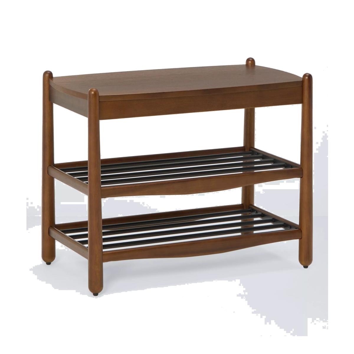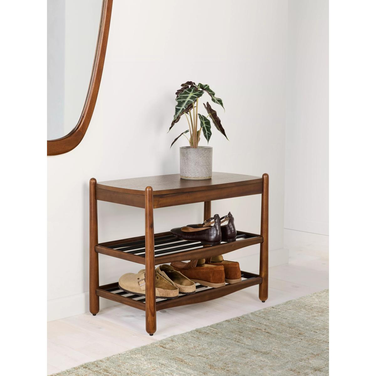 This stained acacia wood shoe shelf features two racks so you can store all your footwear neatly away. There's also a shelf at the top for seating or display.