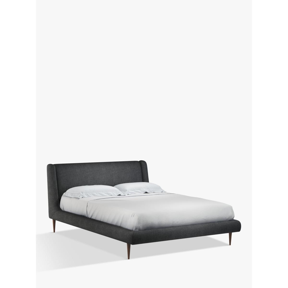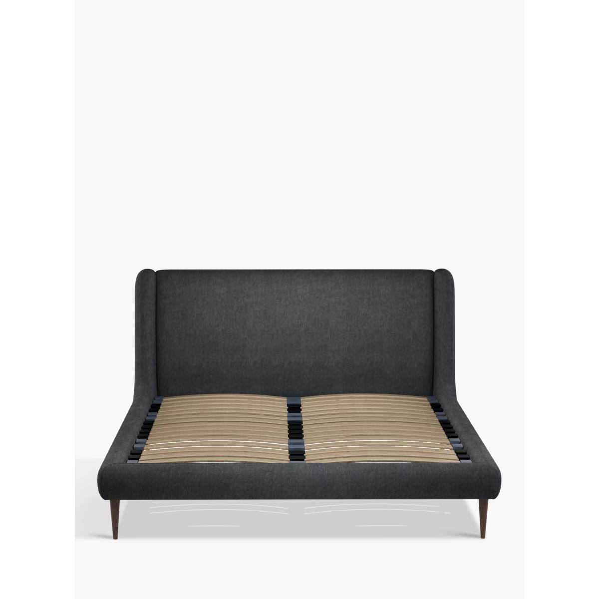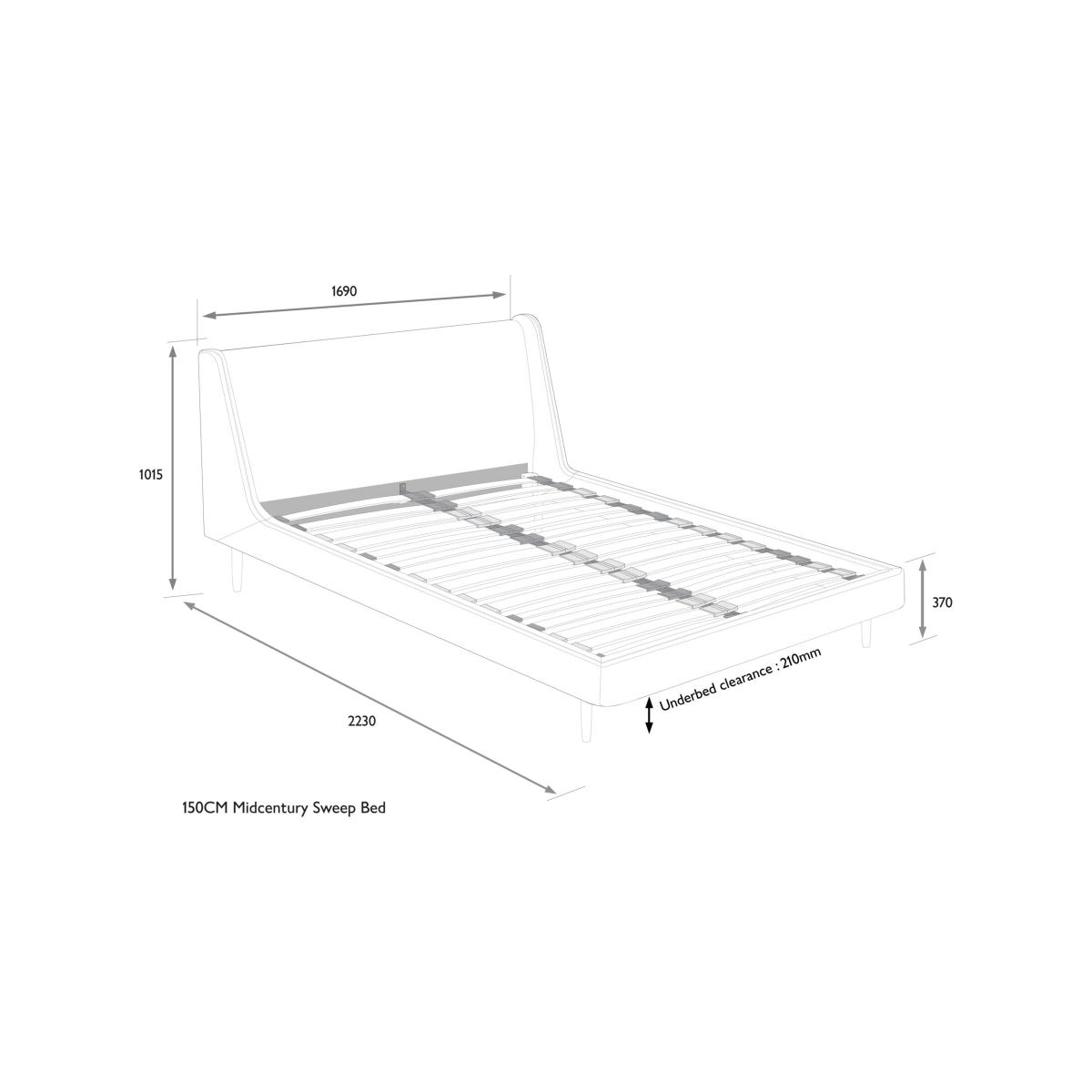 Our Mid-Century Sweep bed frame has a sleek, retro-inspired shape. Its streamlined profile marries soft curves and sharp lines, resting on tapered wooden legs. Sprung slats in the base provide additional support for you and your mattress. Built with Smart Slats This bed frame is designed with wider slats at the shoulders, lumbar and feet. They provide maximum support for you and your mattress so that you experience perfect spinal alignment while you sleep. The standard slat caps are black so we have added grey slat caps to ensure that you know where to place the wider slats. Choose from one of our fabrics: Our Band A fabric, Cotton Effect has a laid-back and fine-textured look that looks like cotton, but it's made from durable polyester fibres Our Band A fabric, Brushed Tweed is made with a brushed herringbone weave that has a cosy wool look and soft 'peach skin' feel. It's really hard-wearing and a brilliant all-rounder Our Band A fabric, Soft Weave has a casual cotton look with a brushed finish that's soft-to-touch and a suble texture that's created by slight variations in the tones of the woven fibres Our Band B fabric, Deep Velvet will bring warmth and luxury to your bedroom. It's a short pile velvet with a soft, plush feel Our Band B fabric, Soft Touch Chenille is made from a blend of fibres that give it a super-soft feel and added durability Our Band B fabric, Boucle is luxe and oh-so cosy. This plush knitted fabric is super-soft and durable with a thick texture that calls for comfort Our Band B fabric, Deep Velvet will bring warmth and luxury to your bedroom. It's a short pile velvet with a soft, plush feel Our Band B fabric, Mole is a soft and cosy woven wool-blend. Piling and bobbling may occur naturally over time Our Band B fabric, Cord is rich in texture and available in neutral shades that will suit every space. Our Band B fabric, Relaxed Linen gives you the fine texture of cotton, the durability of synthetic fibres and the laid-back look of linen Our Band C fabric, Marylamb is woven from both man-made and natural fibres, creating a tactile and soft-touch feel. Our Band C fabric, Aquaclean Velvet will liven up your bedroom. It's plush, available in a range of bold colours and treated with Aquaclean so that it can be wiped clean with just water. A smart choice for families and those with pets. Want to see it first? You may want to see and get a feel for the furniture in one of our shops before ordering. We'll be able to tell you where the range you'd like to view is on display.