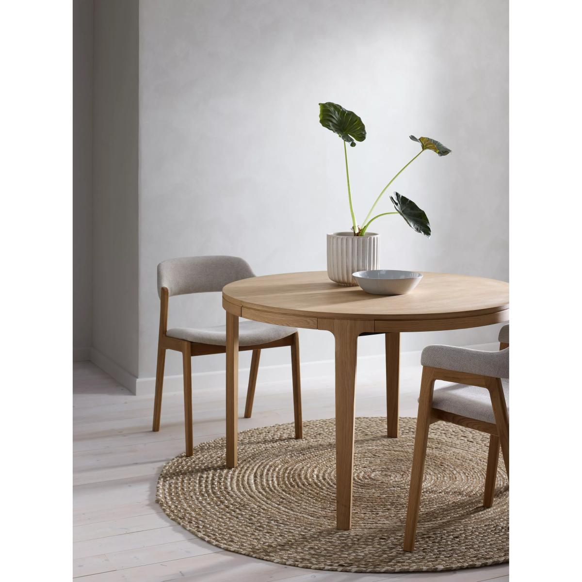 I love the Mira extending oak table for its clean lines and smooth extension mechanism - it’s ideal when you need extra seats without the bulk of a permanent large top. Its light oak finish works equally well in Scandi-inspired spaces, minimalist urban flats or a more classic country scheme. To style it, keep the setting simple with neutral linen placemats and a low, uncluttered centrepiece (think a ceramic bowl or a cluster of small succulents). Pair with mixed chairs - perhaps two oak-tone chairs for cohesion and a couple of upholstered seats for added comfort and contrast.