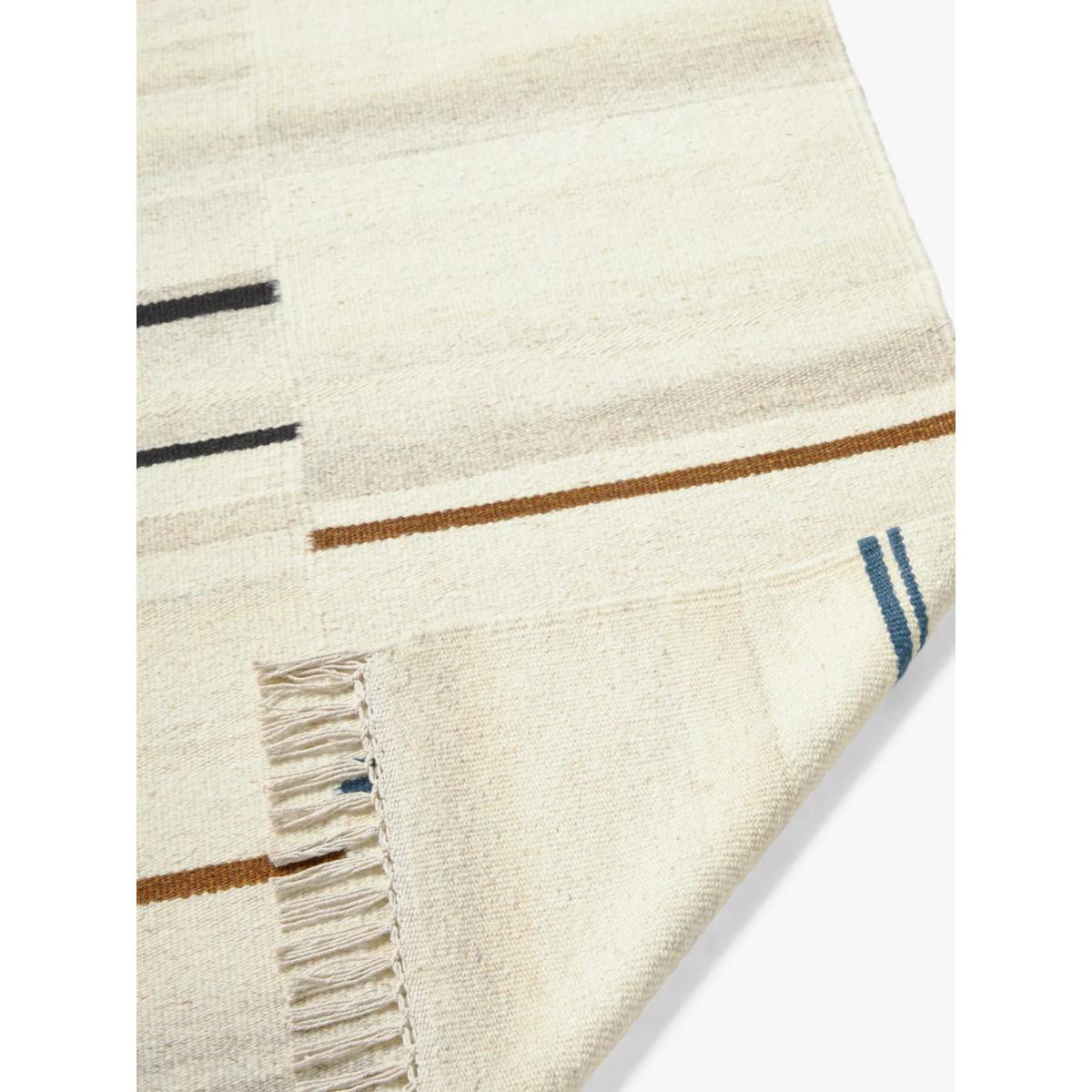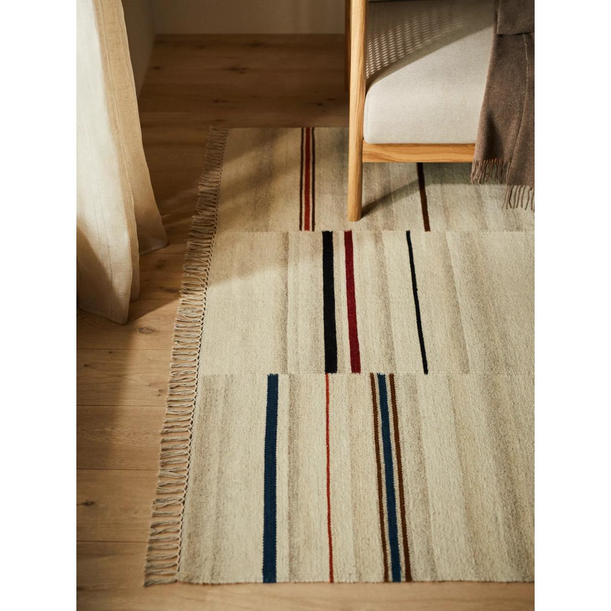 A more contemporary interpretation of a tried and tested stripe pattern, this rug is indulgently imagined in a wool-rich mix for a soft feel underfoot. About your new rug We recommend John Lewis & Partners Rug Hold Underlay. It prevents your rug from moving underfoot and protects against colour transfer to the floor As this rug is made using natural fibres, shedding is to be expected. This will reduce over time, and should not have an impact on the lifespan or performance of your rug. When you first get your rug, please use the brush attachment on your vacuum cleaner whilst the shedding dies down. After that, when vacuuming your rug, use suction only. Rotating brushes may damage the fibres. When vacuuming your rug, use suction only. Rotating brushes may damage the fibres Blot any spills with a clean, dry cloth. Do not rub or use harsh detergents. Textile backed Attend to spillages immediately and blot with a clean, dry cloth to prevent staining. Dilute a small amount of appropriate carpet shampoo in water. Dampen a colourfast cloth in the diluted shampoo solution and dab the rug, lightly agitating, moving in the direction of the pile. Treat the whole rug and not just the affected area. To restore the appearance of the affected area, use a soft bristled brush to gently comb in the direction of the pile. Allow the rug to thoroughly dry.