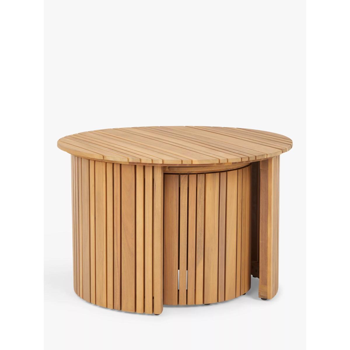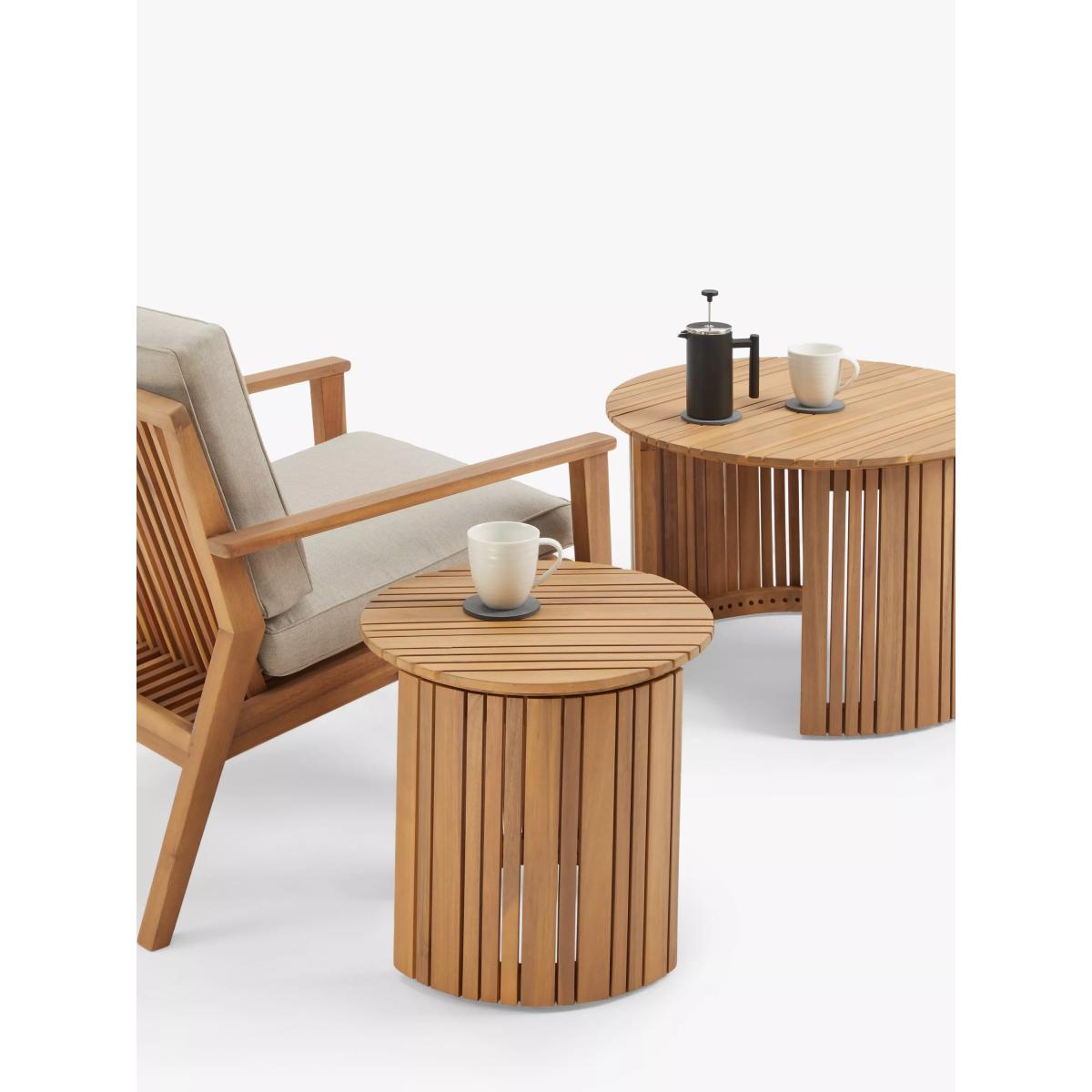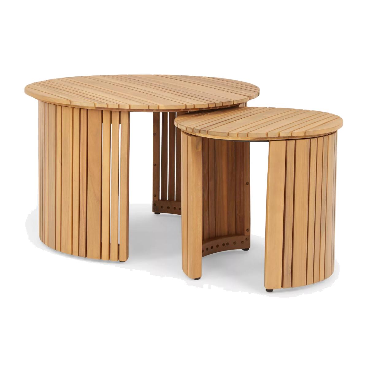 Our Mona garden furniture range is a contemporary slatted design, made from sustainably sourced, naturally weather-resistant FSC-certified acacia wood. Key features: Two round garden coffee tables Nest together for compact storage Contemporary slatted design Naturally weather-resistant FSC-certified acacia wood Feet caps protect flooring and furniture legs and are adjustable in height for uneven surfaces Team with our Mona range of garden furniture Garden furniture care: To keep your outdoor furniture in the best condition, store it in a cool, dry, well-ventilated spot indoors over the winter. If it’s staying outside, use an outdoor furniture cover whenever the weather is wet or unseasonal. Make sure furniture is clean and dry before storing it away. By choosing this product you are supporting responsible management of the world's forests. The Forest Stewardship Council® (FSC®) is a global, not-for-profit organisation that helps take care of forests and the people and wildlife that call them home. To learn more, visit fsc.org. Choose the perfect outdoor furniture We have a selection of wooden furniture for you to choose from which will suit the home or garden. Below are a few options to consider when choosing your perfect outdoor furniture. TeakA premium and popular wood with an attractive appearance which ages beautifully. Strong, durable and resistant to rot and decay, this furniture requires little maintenanceEucalyptusDistinctive scent and appearance which darkens as it ages. Provides similar natural benefits to teak including moisture resistance, hardness and durability. It's plentiful in supply which makes the furniture an inexpensive choice. AcaciaNaturally durable, this wood is incredibly hard and is unlikely to suffer damage during everyday use. It provides similar natural benefits to teak, yet unlike many other hardwoods, acacia is also relatively fast growing which minimises the environmental impact.