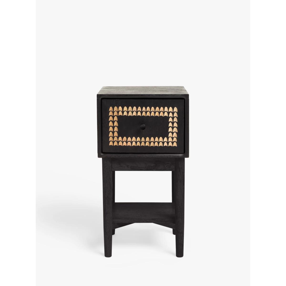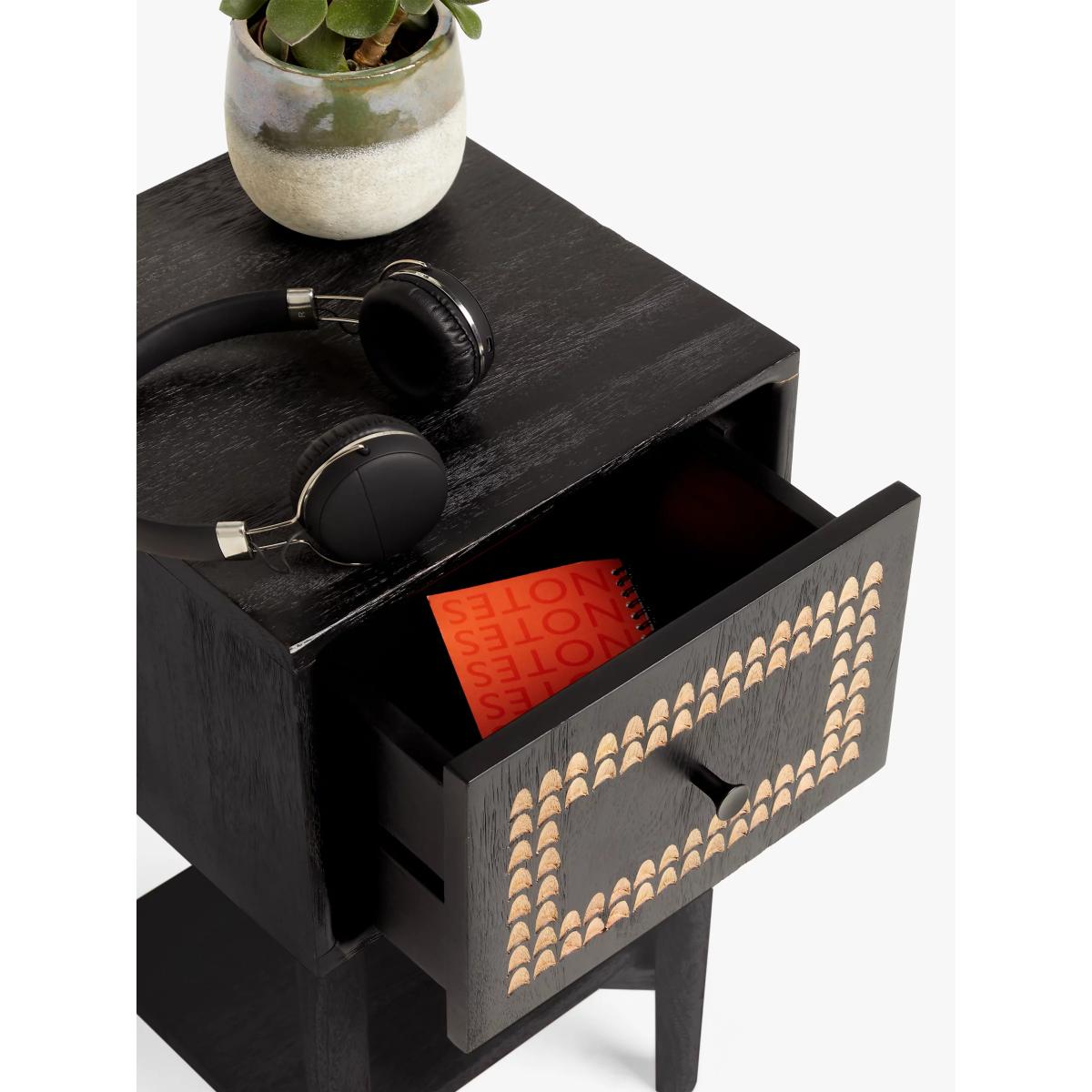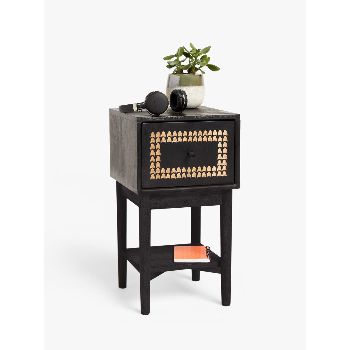 The humble bedside table just got a bold, boho update. Made from mango wood using traditional design methods, we love its raw-tone finish and intricate pattern on the drawer front. Our in-house designers also kept the edges smooth and curved for a retro styling point. And with its lower shelf and deep drawer, it's the perfect little size for your bedside bits and bobs. Want to see it first? You may want to see and get a feel for the furniture in one of our shops before ordering. We'll be able to tell you where the range you'd like to view is on display.
