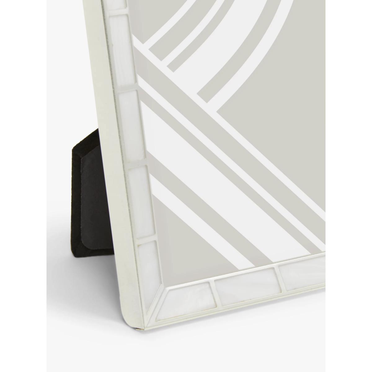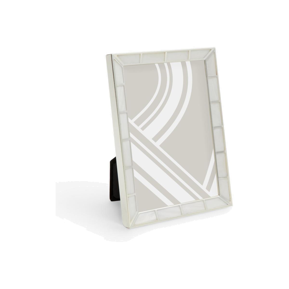 An updated take on Art Deco design, this photo frame is inlaid with mother-of-pearl blocks, hand cut and hand polished. An elegant silver-plated frame completes the look. It makes a beautiful gift for displaying photos at home freestanding, horizontally or vertically. The frame holds a single image and is available in a choice of aperture sizes. The inch measurements are rounded measurements worked back from standard centimetre sizes.