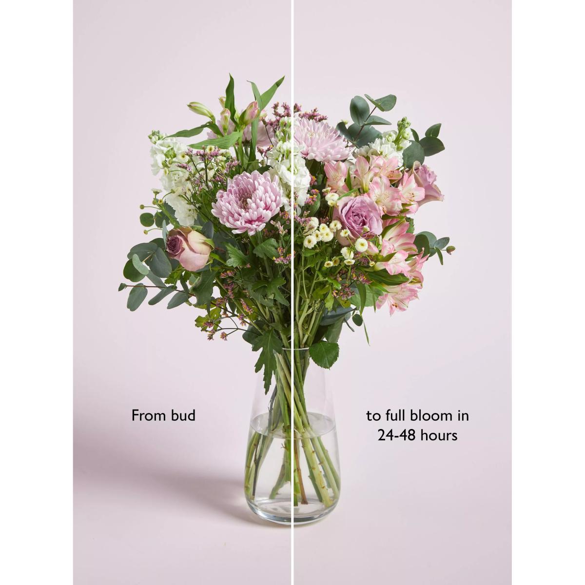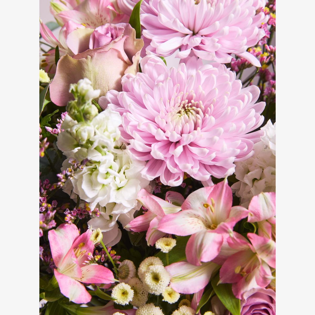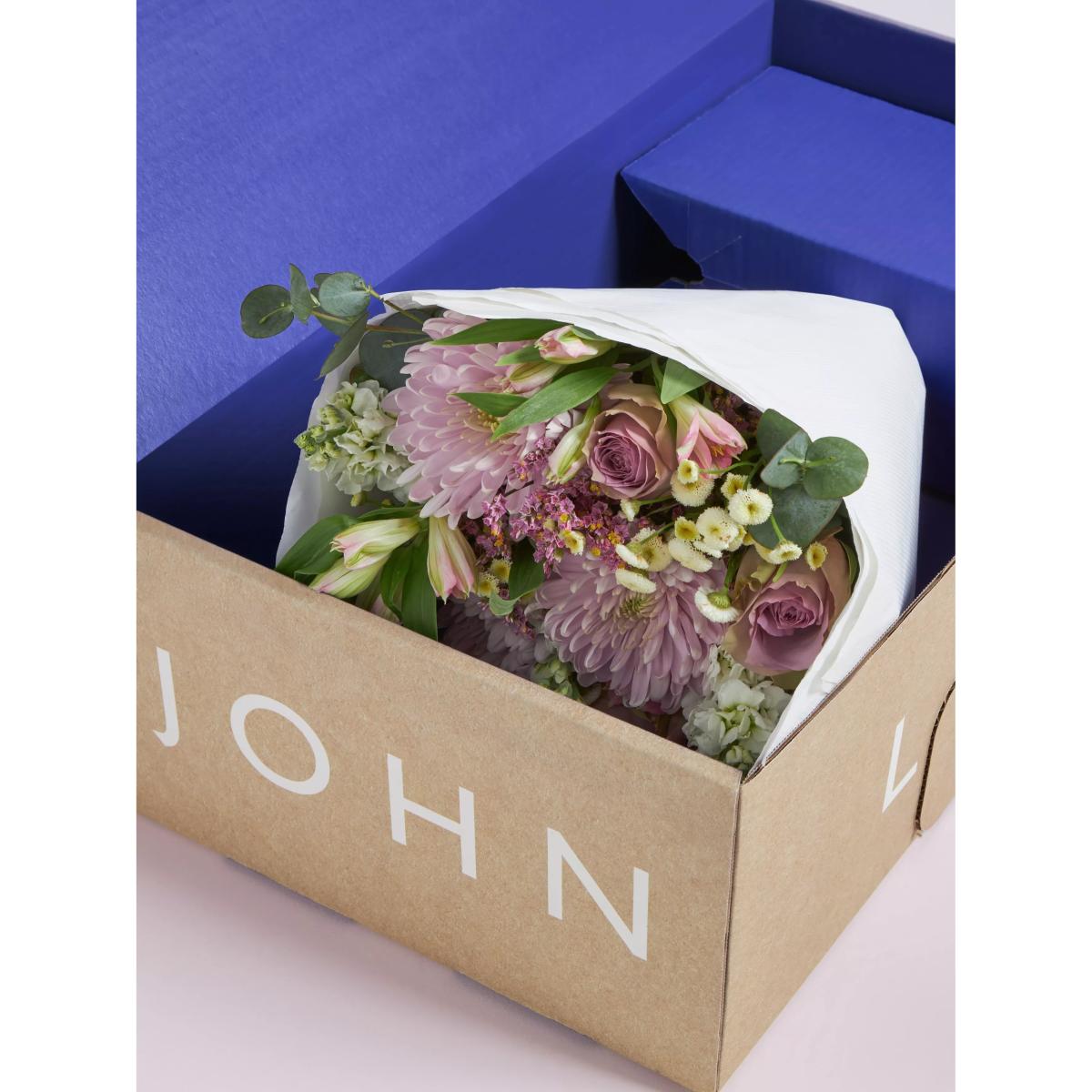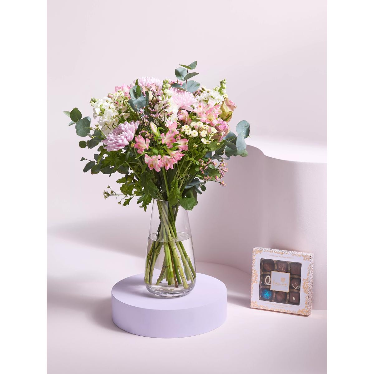 A traditional Mother's Day hand-tied bouquet with a pink pastel mix of large pink bloom chrysanths, scented white stocks and lilac roses, accompanied by pale pink alstro, small white tanacetum, soft pink limonium and grey Eucalyptus. Complete with gourmet chocolates. Free UK delivery Delivery will be on Sunday 30th March Orders placed after 9am on Saturday 29th March will be delivered within 2 working days Contents: 20 stems Height of bouquet 50cm Holdsworth Window Box Milk Chocolates, 110g Hand-tied and delivered in bespoke John Lewis packaging Arrives in bud, they'll begin to bloom within 24-48 hours Gift message and card Flower food and care guide to keep fresh flowers full of life for a minimum of 5 days How to personalise your bouquet: 1. Place your order 2. Consider the personal message you'd like to add (maximum of 300 characters) - remember to include in your message who the gift is from 3. Click the gift message link and enter your order number and message 4. Gift message requests must be completed within 1 hour of order purchase, otherwise a standard 'thinking of you' message will be included Refund policy We can't offer refunds or exchanges on perishable goods such as flowers and food, unless faulty or not as described. Find out more. This does not affect your statutory rights.