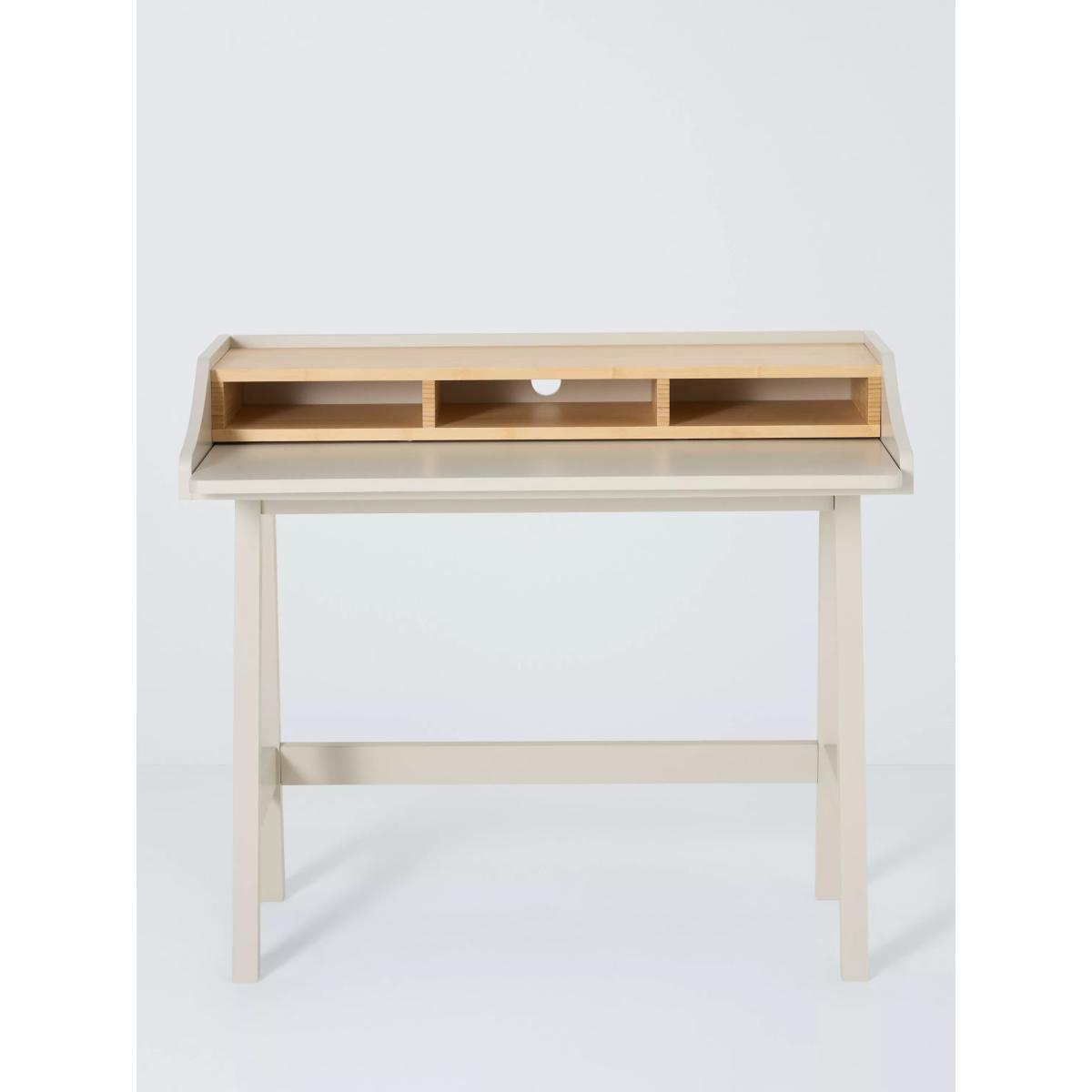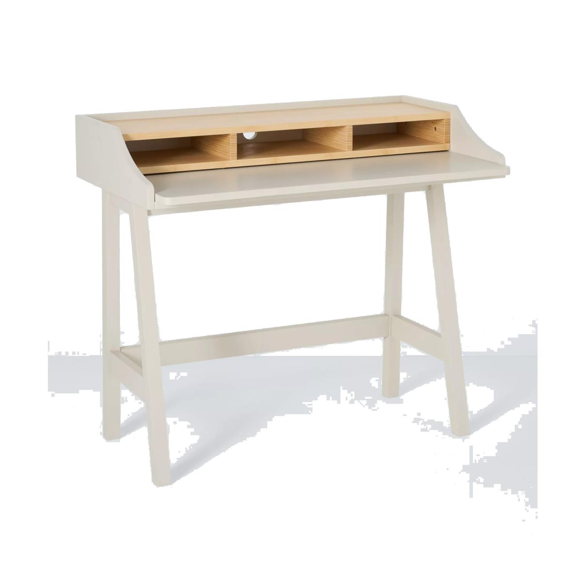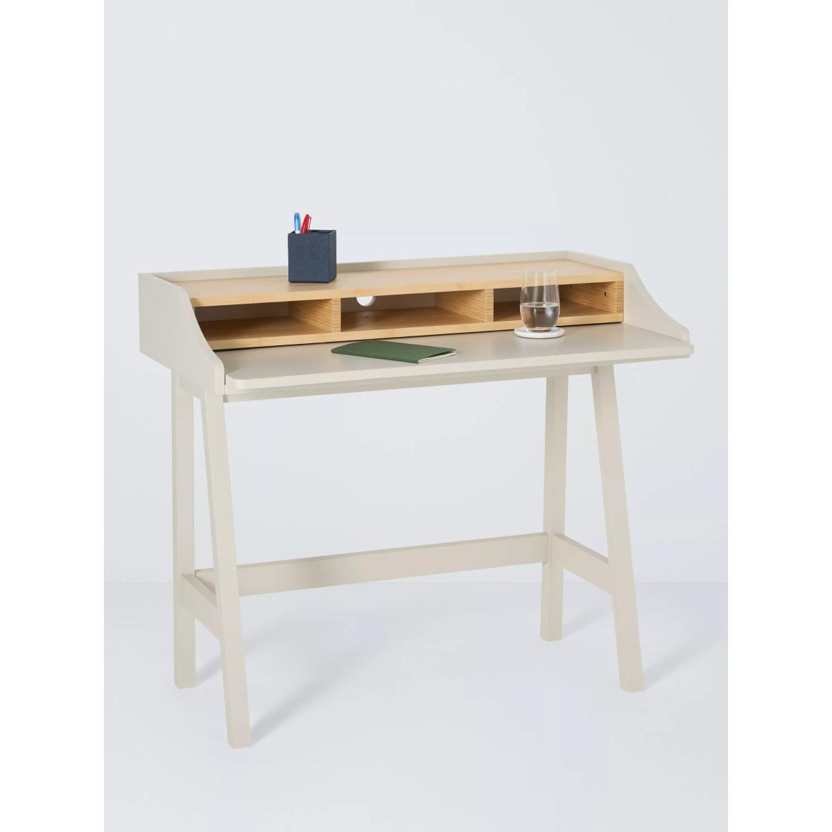 I’m a big fan of the Motto desk in greige because its pared-back silhouette and neutral finish slot seamlessly into modern, Scandi-inspired or even cottage-style rooms. The little top cubbies keep stationery and tech bits tucked away, while the slim desktop feels spacious without taking over the room. To style it, pair with a simple metal-frame desk lamp and a low-profile planter or two to bring in texture and a touch of greenery. Keep the shelves neat with uniform baskets or file trays, and consider a woven rug underneath to soften the look. A slim task chair in the same tonal family will finish off the set-up without detracting from the desk’s clean lines.