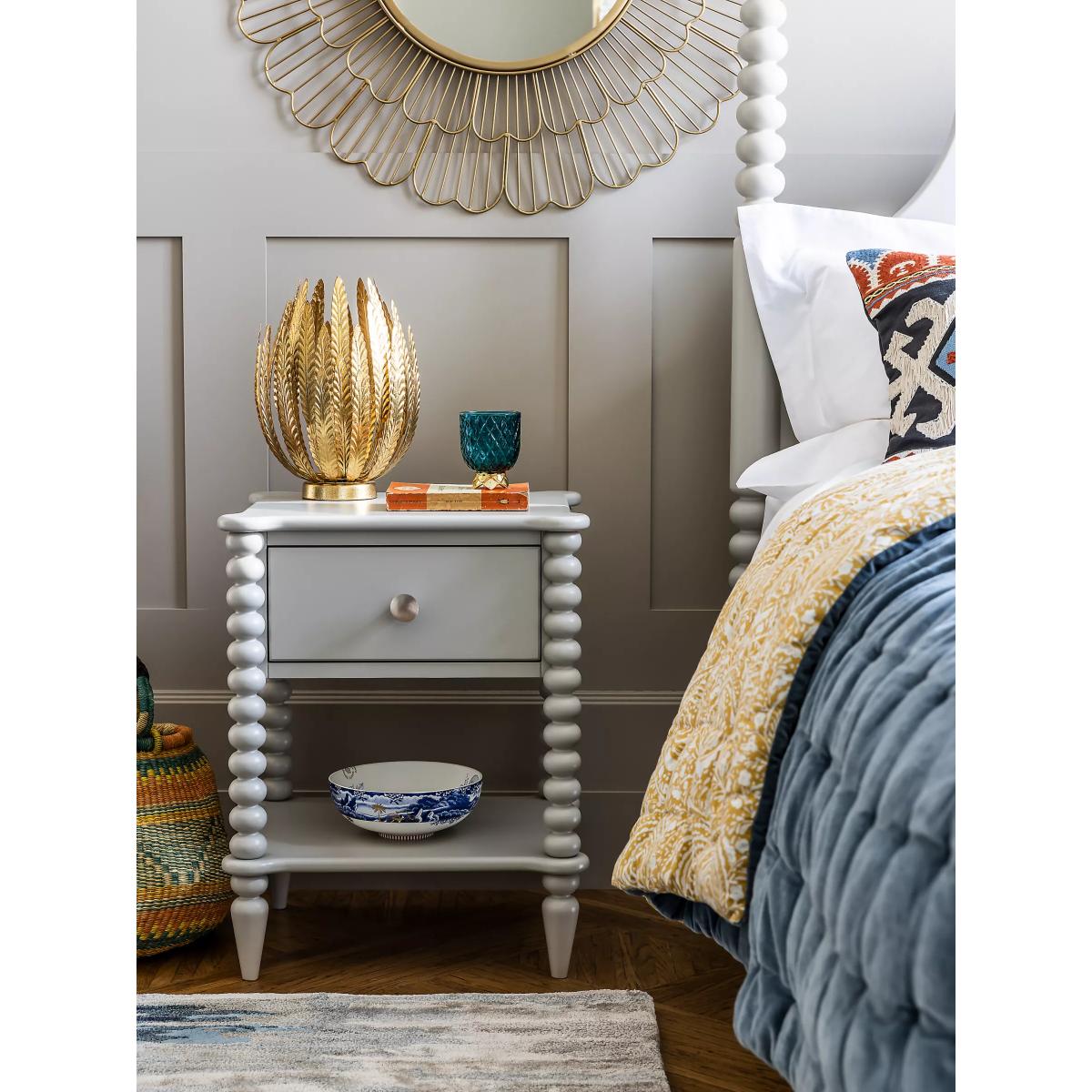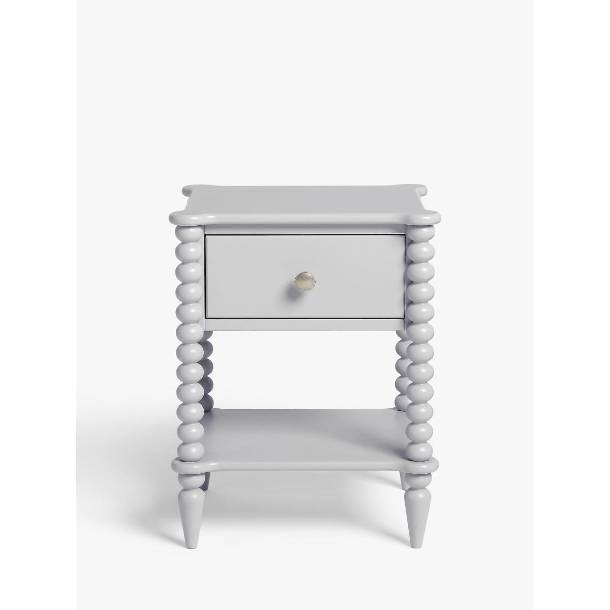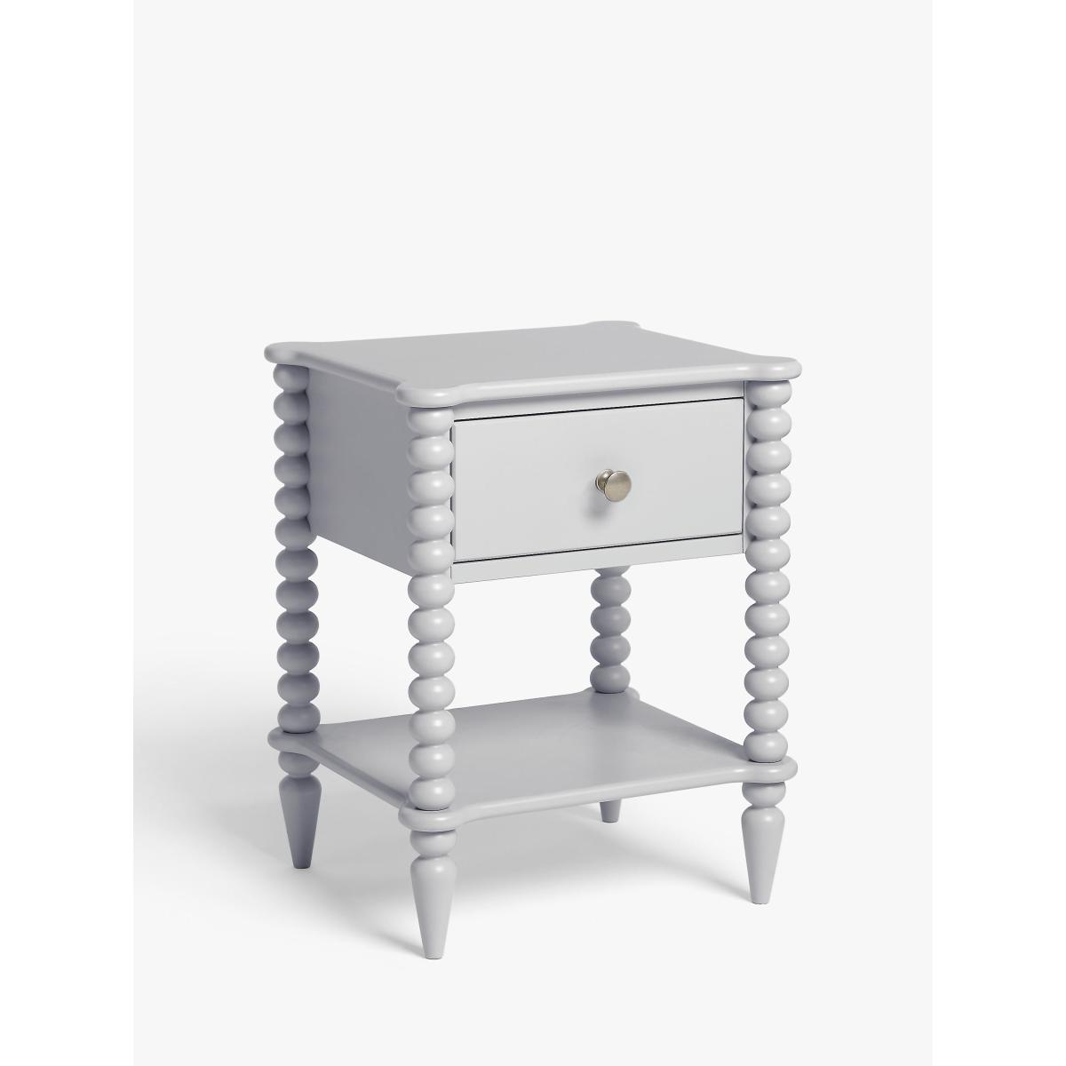 A revival of eclectic 17th century designs, our Bobbin range of furniture will bring a heritage feel back into your home. Decorative design points are awarded for this painted bedside table's round bobbin legs which add character and charm, and it's also impressively sturdy thanks to a combination of high-quality rubberwood and MDF. Complete with a deep drawer and lower shelf, who said bedside storage had to be boring? This one is practically sized and a perfect amount of playful. Want to see it first? You may want to see and get a feel for the furniture in one of our shops before ordering. We'll be able to tell you where the range you'd like to view is on display.