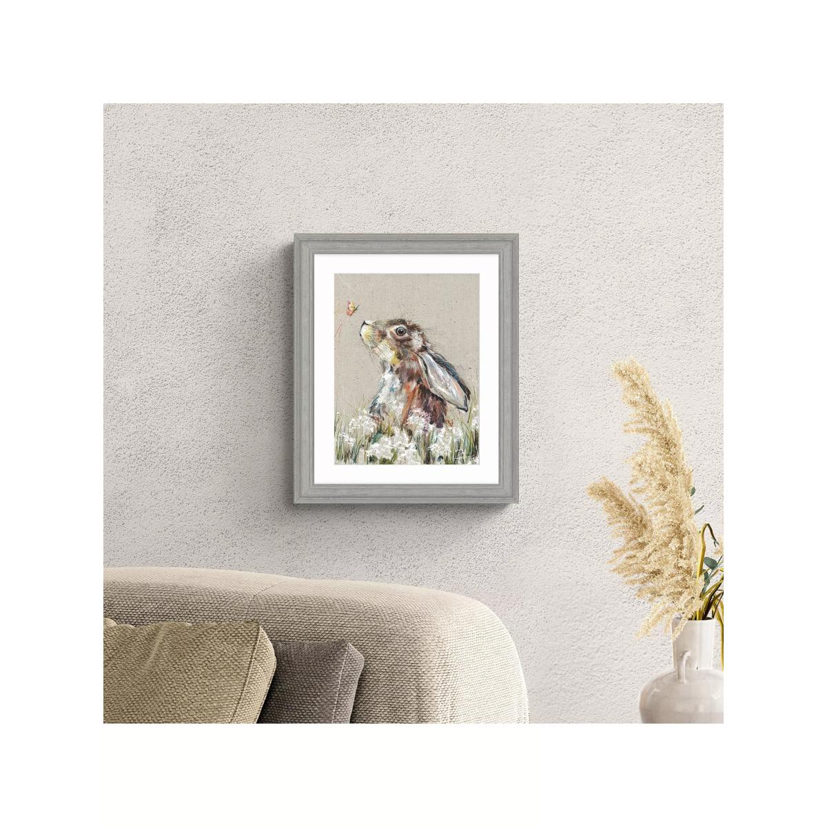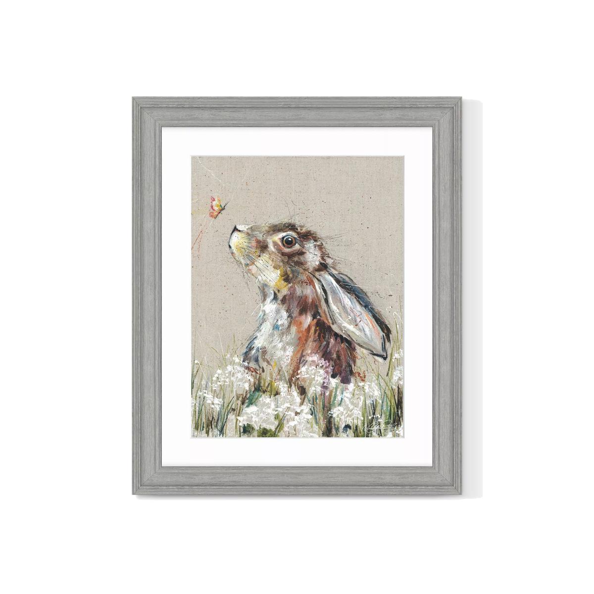 'Bella', a hare and butterfly artwork by artist Nicola Jane Rowles. Made in the UK, this glazed print is presented with a window mount in a grey wood-effect frame, ready to hang on your wall. Living in Cornwall on the edge of Bodmin moor and near to the coast, Nicola Jane Rowles is surrounded by beauty and nature. Nicola's studio and home gallery has views to Dartmoor over rolling fields, the home of animals, fur and feather, small and large giving her a wealth of inspiration. Nicola loves to create interesting paintings with movement and vibrancy using a mixture of inks and watercolour, letting the paintwork create beautiful natural marks and patterns. Have you thought about wall hooks and fittings?
