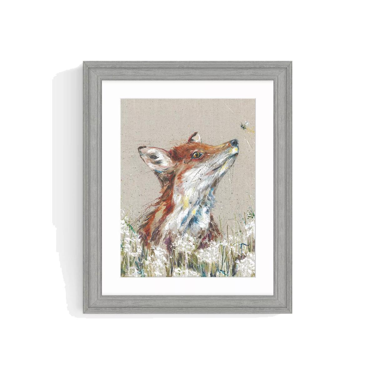'Finley', a playful fox and bee artwork by artist Nicola Jane Rowles. Made in the UK, this glazed print is presented with a window mount in a grey wood-effect frame, ready to hang on your wall. Living in Cornwall on the edge of Bodmin moor and near to the coast, Nicola Jane Rowles is surrounded by beauty and nature. Nicola's studio and home gallery has views to Dartmoor over rolling fields, the home of animals, fur and feather, small and large giving her a wealth of inspiration. Nicola loves to create interesting paintings with movement and vibrancy using a mixture of inks and watercolour, letting the paintwork create beautiful natural marks and patterns. Have you thought about wall hooks and fittings?
