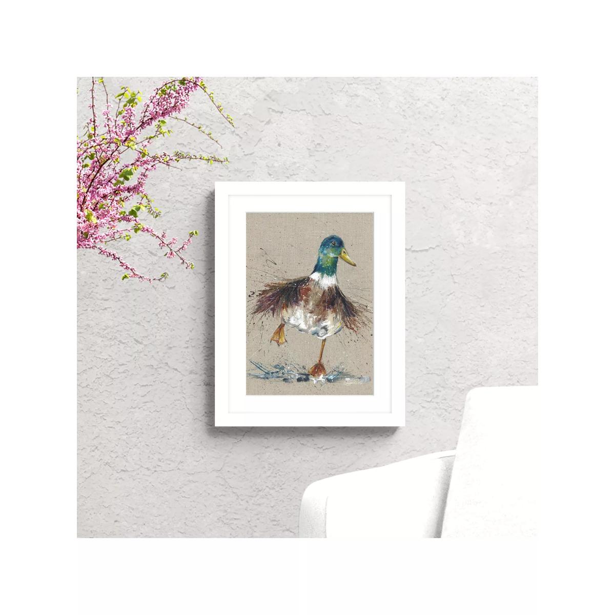 'Splish Splash', a mallard on the water by artist Nicola Jane Rowles. Made in the UK, this glazed print is presented with a window mount in a white frame, ready to hang on your wall. Living in Cornwall on the edge of Bodmin moor and near to the coast, Nicola Jane Rowles is surrounded by beauty and nature. Nicola's studio and home gallery has views to Dartmoor over rolling fields, the home of animals, fur and feather, small and large giving her a wealth of inspiration. Nicola loves to create interesting paintings with movement and vibrancy using a mixture of inks and watercolour, letting the paintwork create beautiful natural marks and patterns. Have you thought about wall hooks and fittings?