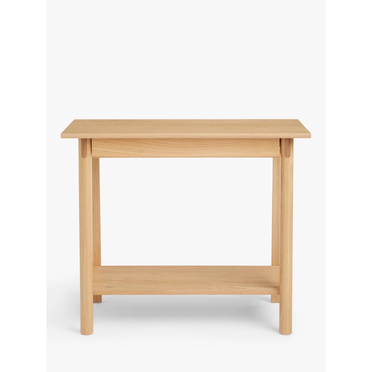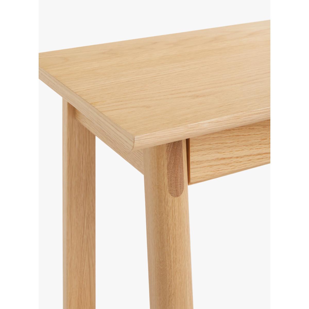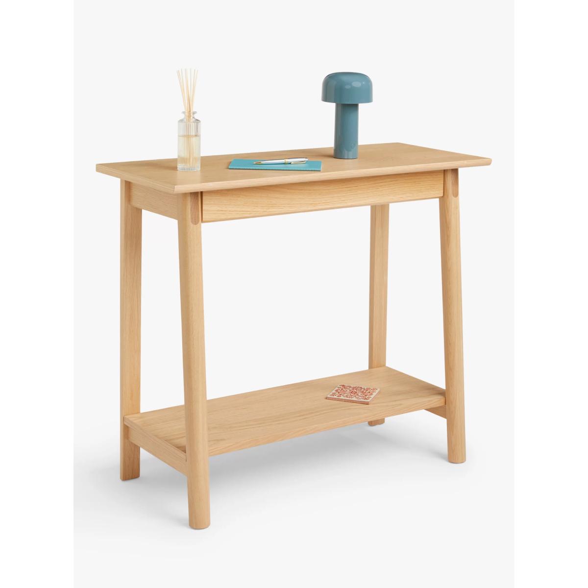 A timeless oak range with a contemporary take. Notch's heritage details add the sense of a handcrafted approach to form a real sense of quality. Crafted with leg details and solid wood handles, Notch is made from FSC high-quality solid oak, veneers and poplar - practical pieces with a lasting aesthetic. This console table has sturdy, slightly splayed legs braced by a bottom shelf. A full-width drawer sits unobtrusively beneath the top for handy storage. Want to see it first? You may want to see and get a feel for the furniture in one of our shops before ordering. We'll be able to tell you where the range you'd like to view is on display.