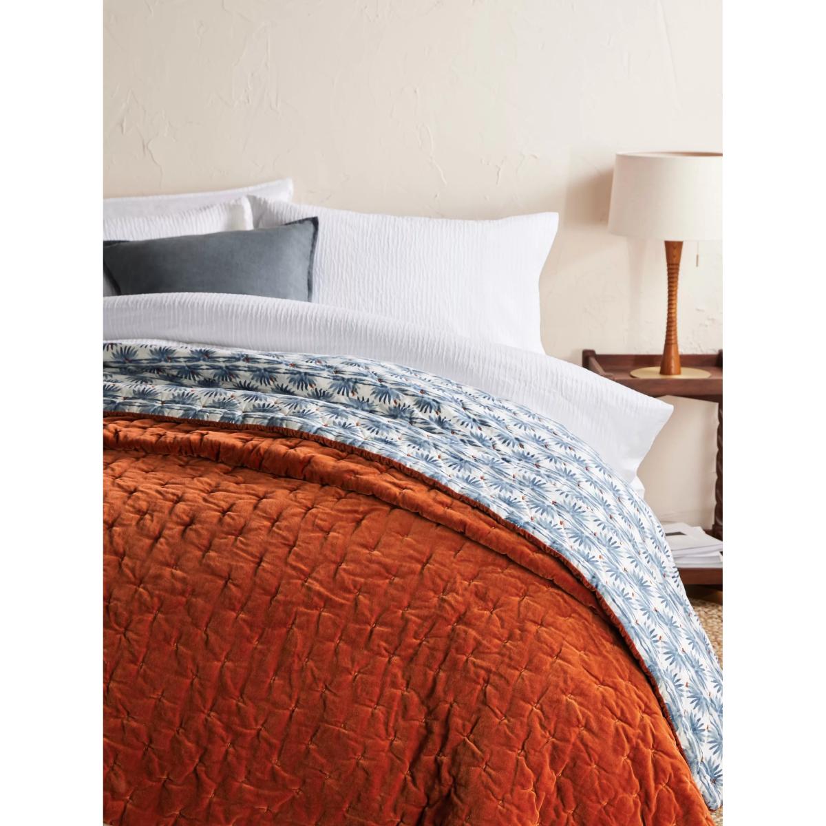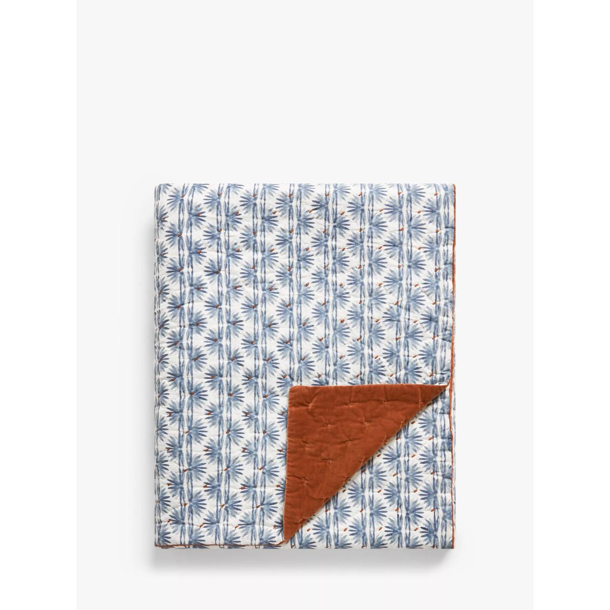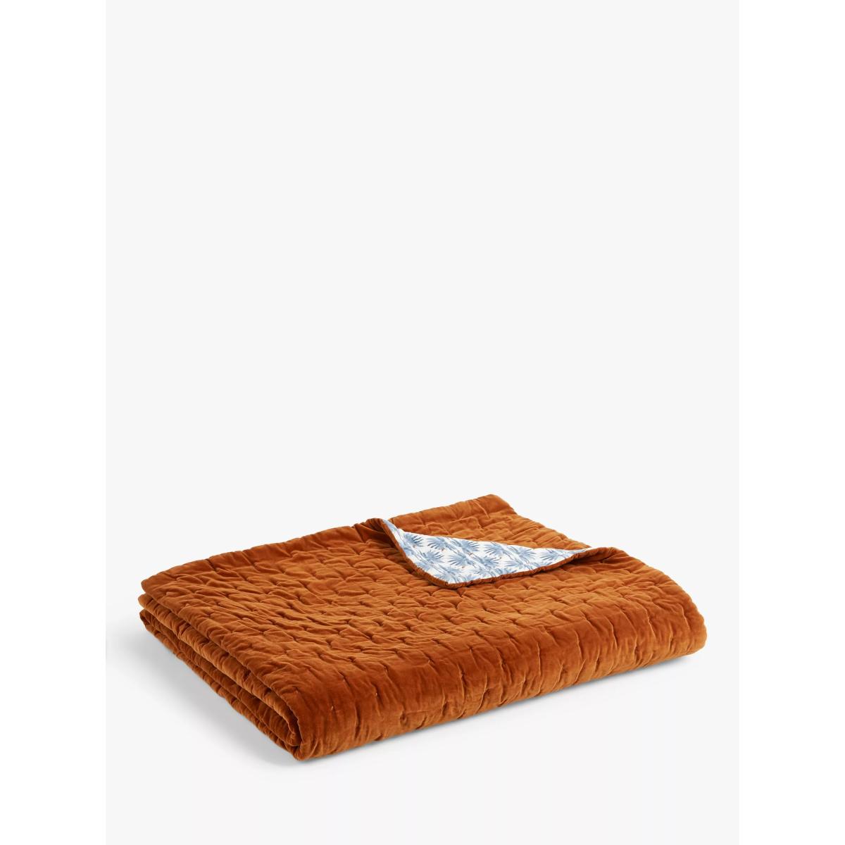 This reversible quilted bedspread allows you to switch between sumptuous velvet and a fresh, floral print as the seasons change. It's made from 100% cotton including the filling. We recommend this size for double and kingsize beds. Better Cotton By choosing our cotton products, you’re supporting our investment in Better Cotton’s mission to help cotton communities survive and thrive while protecting and restoring the environment. Better Cotton Farmers are farmers who care for the environment and respect workers’ rights and wellbeing. This product is sourced via a system of mass balance and therefore may not contain Better Cotton. bettercotton.org/massbalance