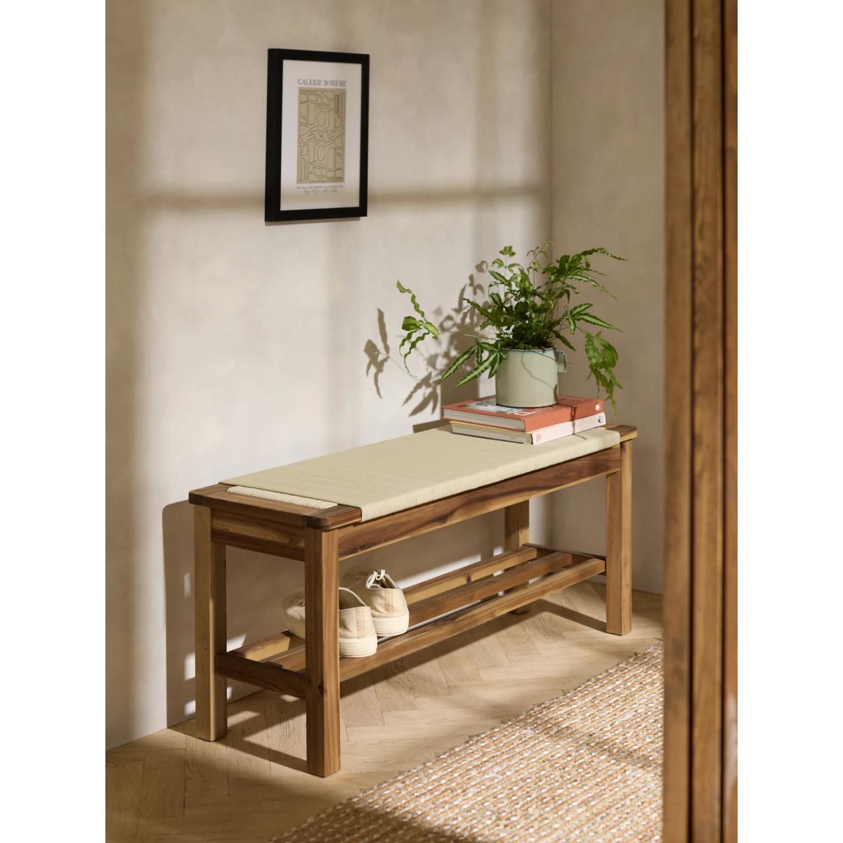 I’m a fan of this natural weave bench because it brings warmth and texture to an entryway without feeling heavy. Its simple lines and open shelf make it ideal for Scandi, coastal or modern farmhouse schemes, and the lower tier is perfect for organising shoes in neat baskets or boxes. Styling tip: top it with a slim cushion in a muted stripe or tonal wool for extra comfort, and add a woven basket underneath to corral scarves or umbrellas. Position it beside a full-length mirror or under a row of hooks to create a functional, clutter-free drop zone that still feels inviting.