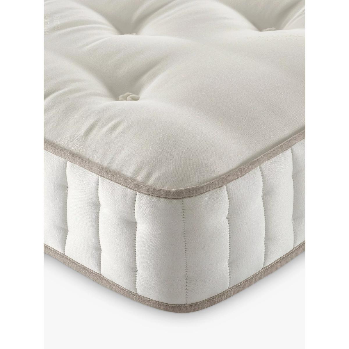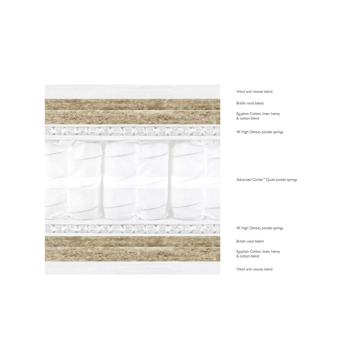Our Luxury Natural Collection is handmade by experts in Yorkshire, with natural fillings chosen for their wonderful comfort, temperature-regulating and moisture-wicking properties. The innovative, high-density pocket springs reduce pressure points and give excellent targeted support. Plus, the combination of eco-friendly and natural fillings, alongside a completely glue-free design means these mattresses are fully recyclable at end of life for a much more sustainable sleep space. Handcrafted by Harrison Spinks. Reassuringly dense with an extra level of support, our Firmer tension models are perfect for those who prefer a firm feel. Natural fillings Manufactured in Yorkshire, this mattress is upholstered with layers of locally-sourced natural fillings. British wool is used for its durability, comfort and natural springiness while hemp wicks away moisture, keeping the bed fresh and hygienic. The cover is also made with insulating, luxury wool which is fully traceable to British farms. It’s naturally fire retardant and free from chemical treatment for a healthier sleep. Cortec™ Quad pocket spring system This glue-free support system is made up of hundreds of pocket springs that move independently from each other to contour your body with accuracy. Designed, developed and manufactured in-house with a design that unites comfort and sustainability, they ensure precise pressure relief and help to keep your body weight evenly distributed during the night. Plus, as the springs work individually, air can flow better through the mattress and keep the temperature controlled. Eco-friendly design Marking a huge and sustainable step forward in mattress manufacturing, the patented Cortec™ Quad springs are sealed with heat rather than glue. Not only does this mean the springs can work individually for maximum efficiency, it also means each spring can be disassembled and reinvented in the future. So this mattress is 100% recyclable at the end of its life, rather than ending up in landfill sites across the country. We guarantee to recycle your mattress responsibly when you’re ready to buy your next one, after seven years. and we’ll help you to choose a new mattress and recycle this one. Make the most of your mattress After unwrapping your new mattress, leave it in a well-ventilated room for a few hours. Any natural scent from the fillings will dissipate after a few days. We recommend using a cotton mattress protector and airing your mattress regularly. If you’re placing this mattress on a slatted base, ensure the gaps are no more than 7.5cm apart. Try before you buy This is an important purchase and it’s worthwhile to try your choice of mattress in store to make sure it's right for you. Our store Partners will be able to tell you more about its benefits, and recommend options based on your needs.