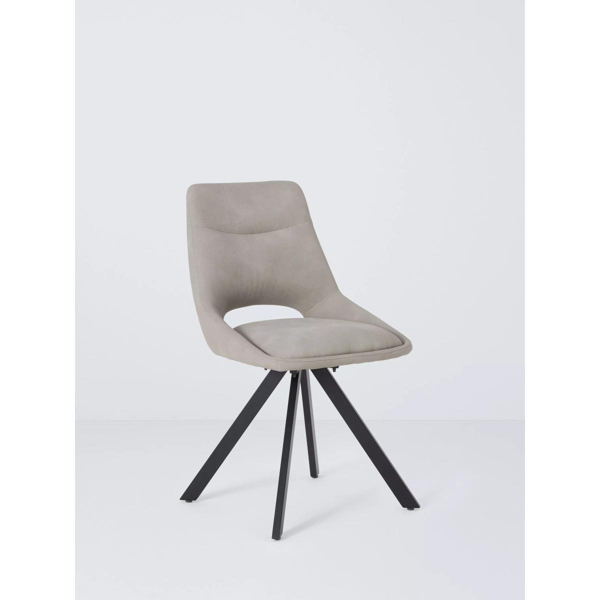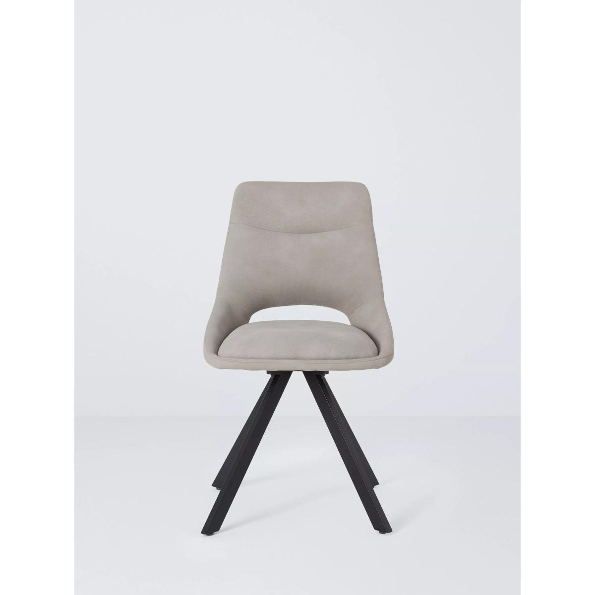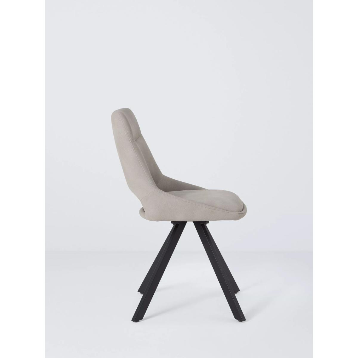 This dining chair features a sleek, contemporary design in polyurethane and textured misty polyester upholstery, offering a refined touch to any space. Its ergonomic seat and backrest provide excellent comfort, while the durable matte black metal legs add stability and style. Equipped with a swivel mechanism, it ensures enhanced versatility and functionality - perfect for modern dining areas. Want to see it first? You may want to see and get a feel for the furniture in one of our shops before ordering. We'll be able to tell you where the range you'd like to view is on display.